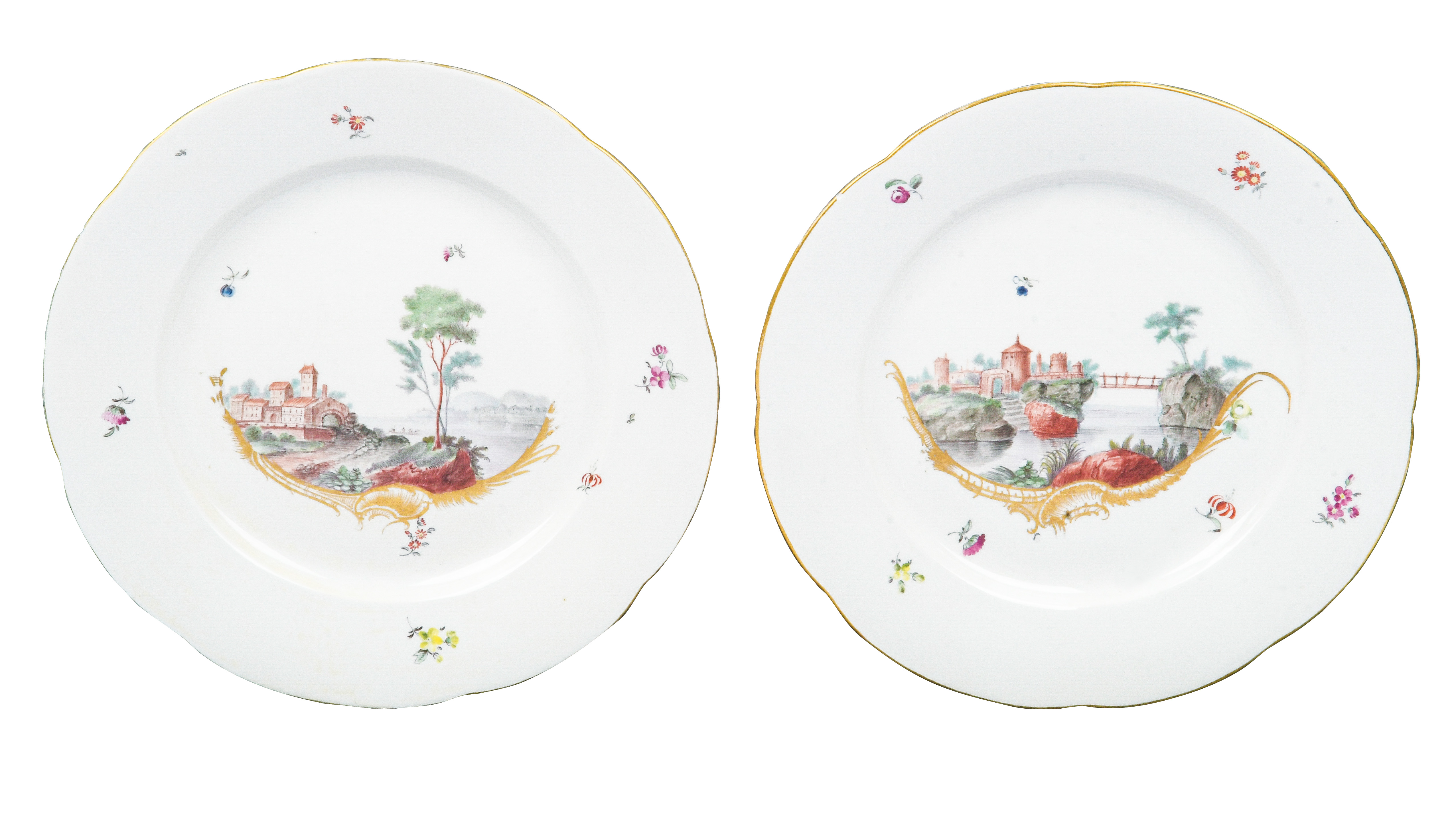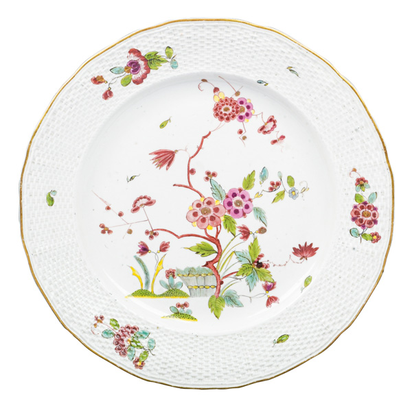 Rund gemuldet, mit steigender Korbflechtrelieffahne, gold gesäumt. Spiegel bunt bemalt mit indianischem Floraldekor. Porzellan, verso unterglasurblaue, steigende Löwenmarke mit „iH“, REM Sammlungs-No. 02287. Vgl. B. Beaucamp-Markowsky, S. 45ff, Nr. 9ff.