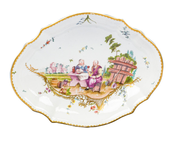 Gemuldet, mit achtfach eingekniffener Wandung. Spiegel bunt bemalt mit ländlicher Szenerie eines Rotwein trinkenden Bauernpaares in Landschaft auf Goldspitzenterrasse. Freiräume bunt bemalt mit Streublumen. Porzellan, verso unterglasurblaue, bekrönte, ligierte CT-Marke. REM, Sammlungs-No. 02203.