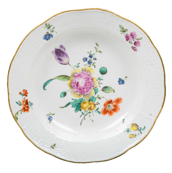 Rund gemuldet, mit steigender Korbflechtrelieffahne und purpurn staffiertem Lippenrand. Spiegel bunt bemalt mit Floraldekor. Porzellan, verso unterglasurblaue steigende Löwenmarke, REM Sammlungs-No. 000081. Vgl. B. Beaucamp-Markowsky, S. 39ff, Nr. 5.