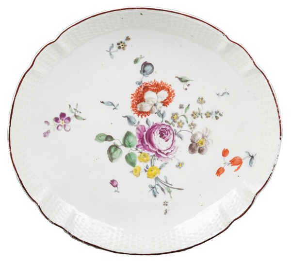 Oval gemuldet, mit steigender Fahne und Flechtwerkrelief, gesäumt von kapuzinerbraunem Lippenrand. Spiegel bunt bemalt mit Floraldekor. Porzellan, verso unterglasurblaue, steigende Löwenmarke, REM Sammlungs-No. 000080. Vgl. B. Beaucamp-Markowsky, S. 39, Nr. 4.