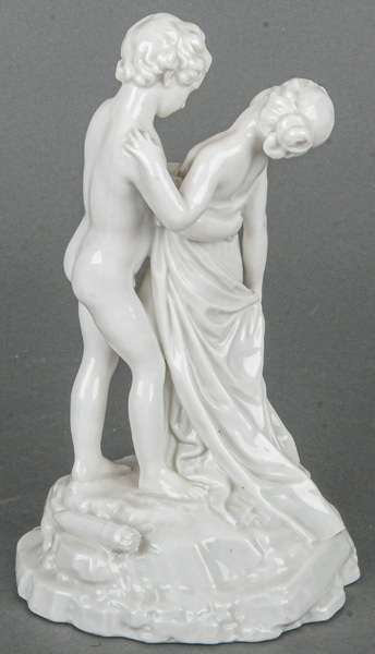 Allegorische Darstellung in Form dreier nackter Kinder beim spielerischen Traubenessen, auf ovalem, unregelmäßigem Felssockel. Porzellan, weiß glasiert, am Boden unterglasurblaue, bekrönte, ligierte CT-Marke, REM Sammlung-No. 000004. Modell von Johann Peter Melchior. Vgl. B. Beaucamp-Markowsky, S. 574ff, Nr. 313ff.