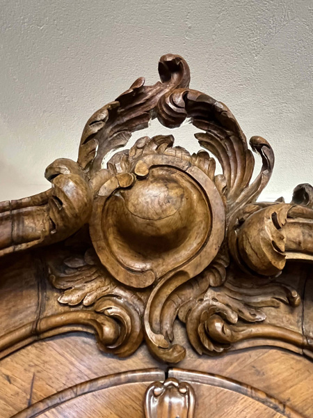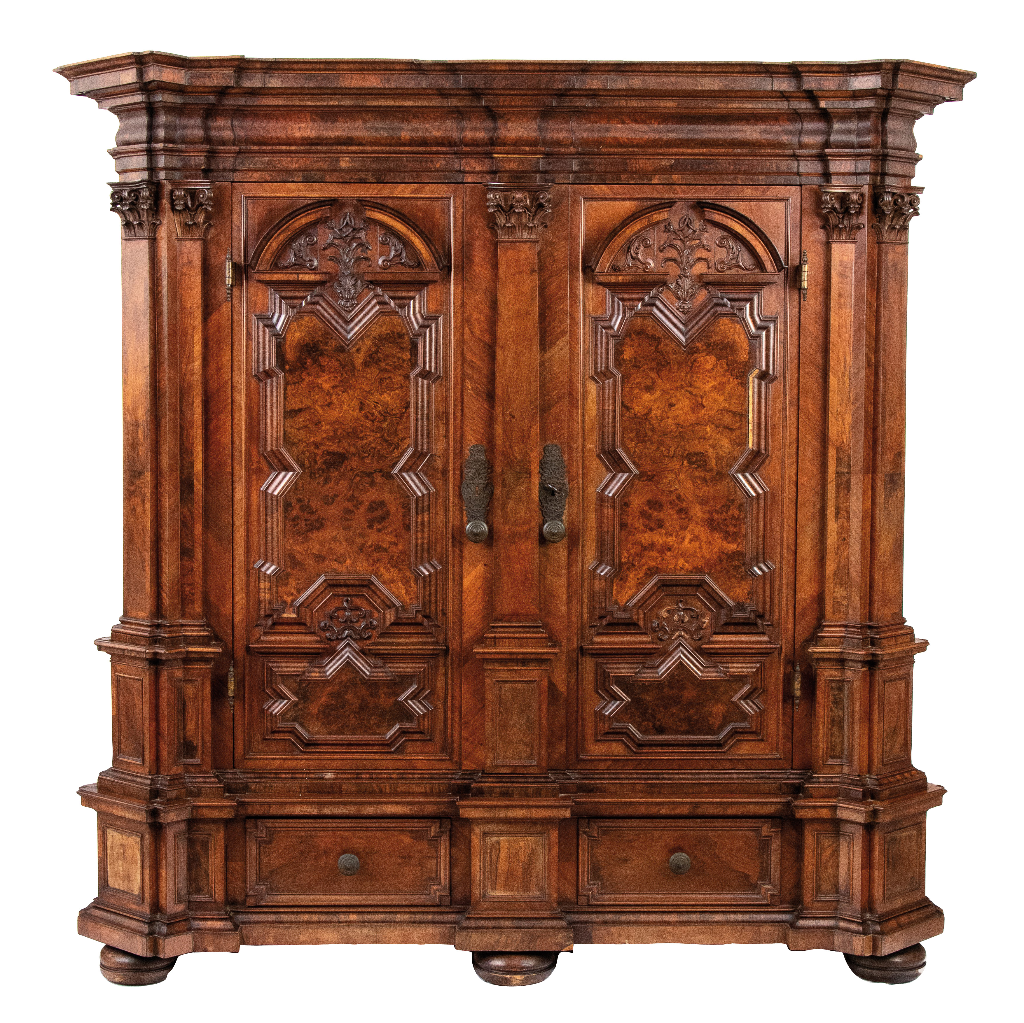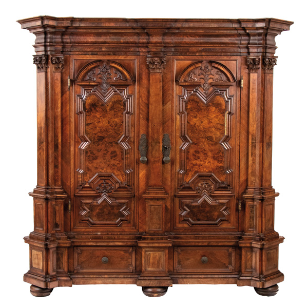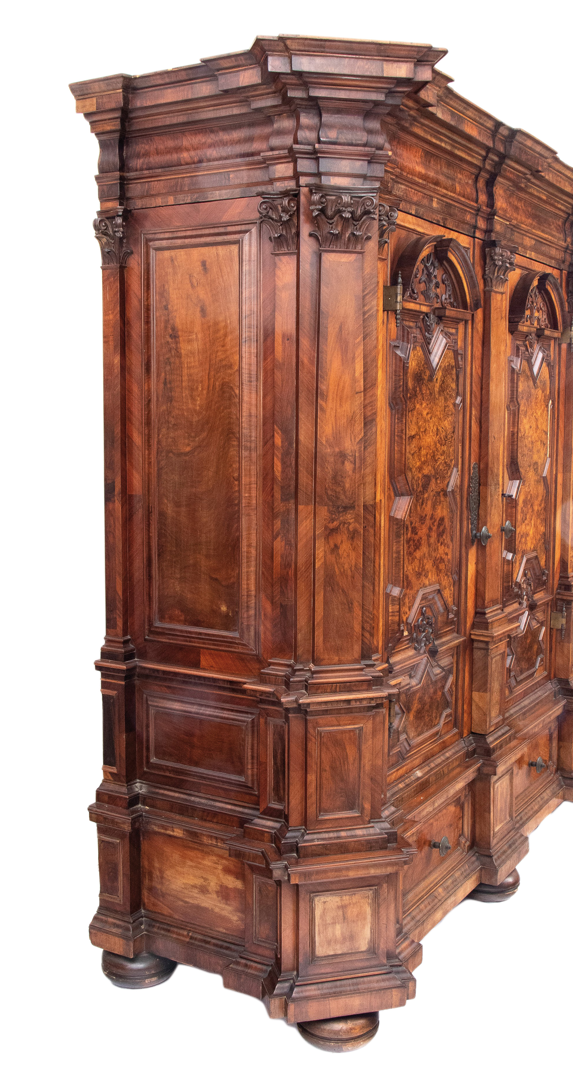 | Rechteckiger, zweitüriger Korpus mit zweischübigem Sockel auf gequetschten Ballenfüßen. Abgeschrägte Ecken mit korinthischen Pilastern mit Schnitzwerk. Türen aufwendig mit aufgesetzten Bastionsfüllungen, je bekrönt von gesprengtem Rundgiebel. Kopfteil meisterhaft profiliert und mehrfach verkröpft. Weichholz, furniert mit Nussbaum und Nussbaumwurzel, teilw. geschnitzt; Türbänder, Scharniere, Riegel und aufwendiges Kastenschloss aus fein geschmiedetem, gebleutem Eisen bzw. Messing. Unberührter Original-Zustand mit schöner Patina. Vgl. H. Kreisel / G. Himmelheber, „Die Kunst des deutschen Möbels“, Bd. II, Nr. 1073.