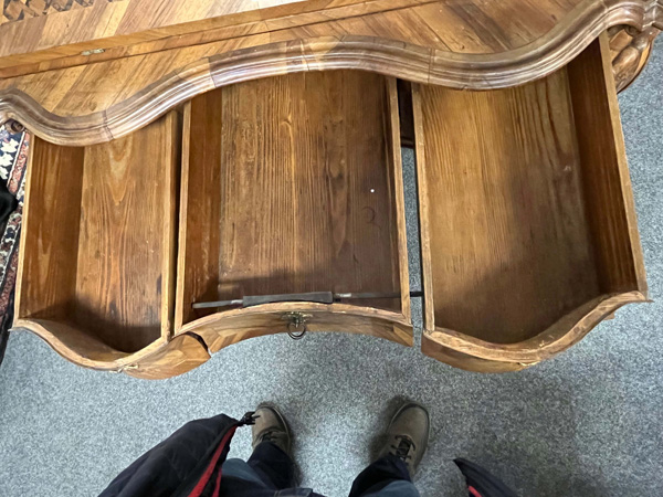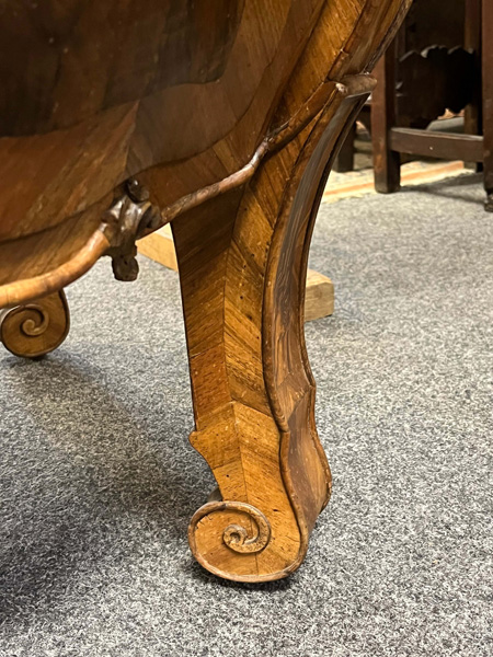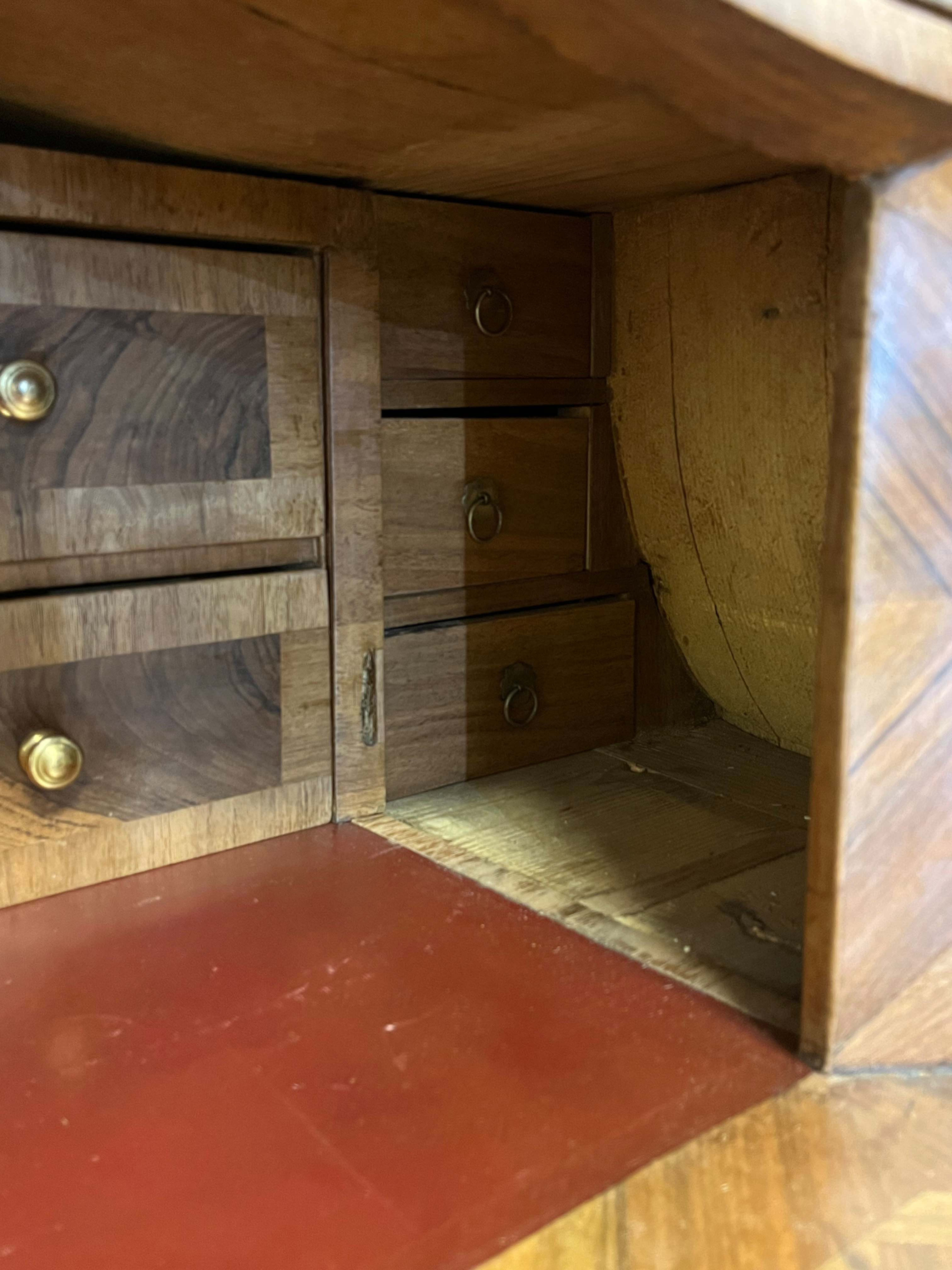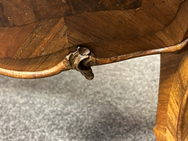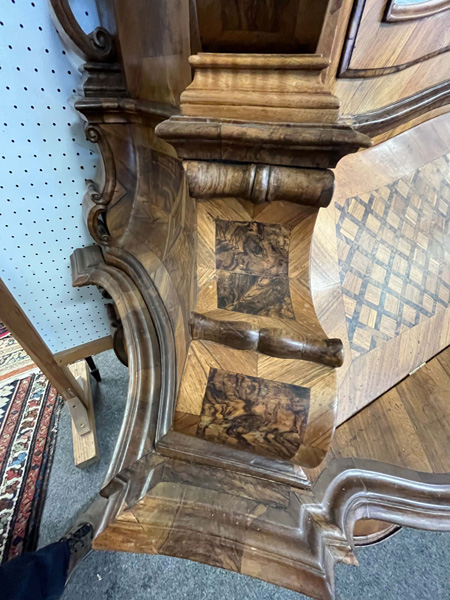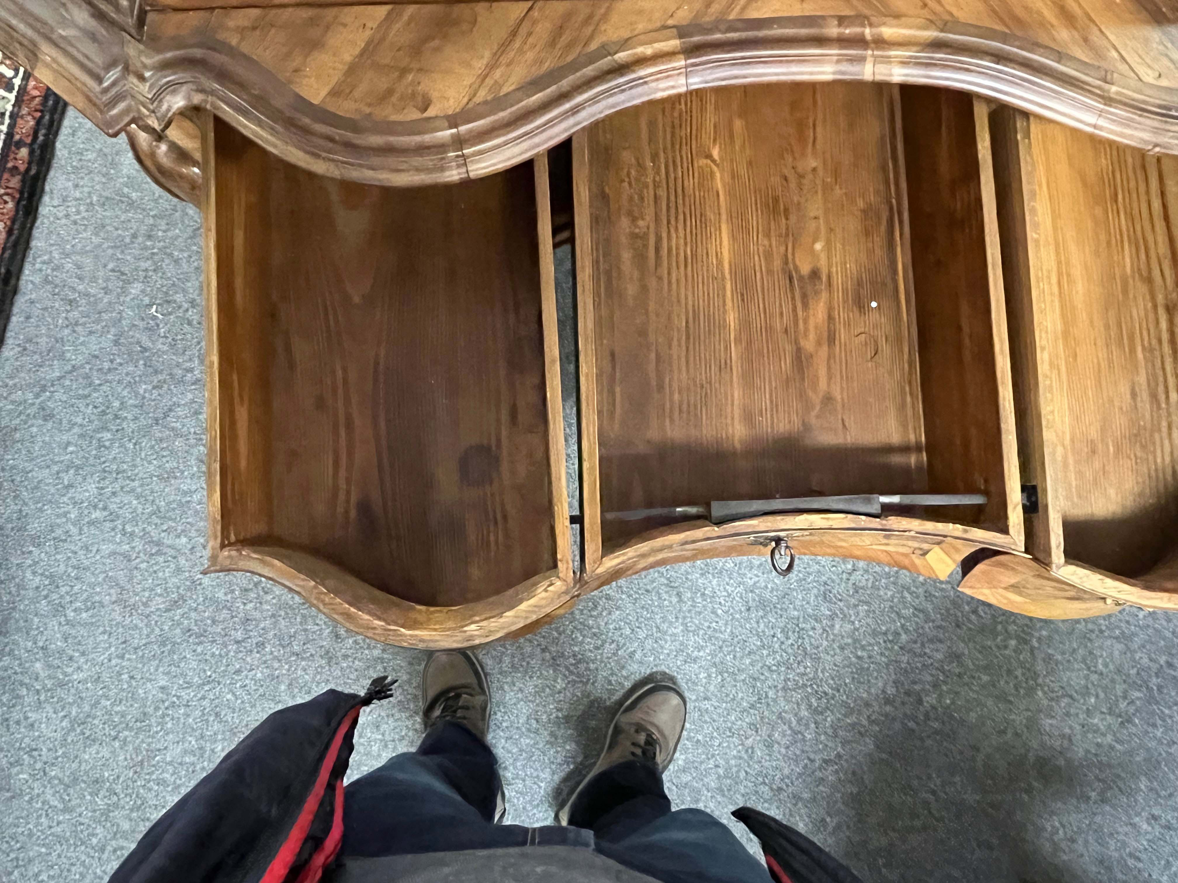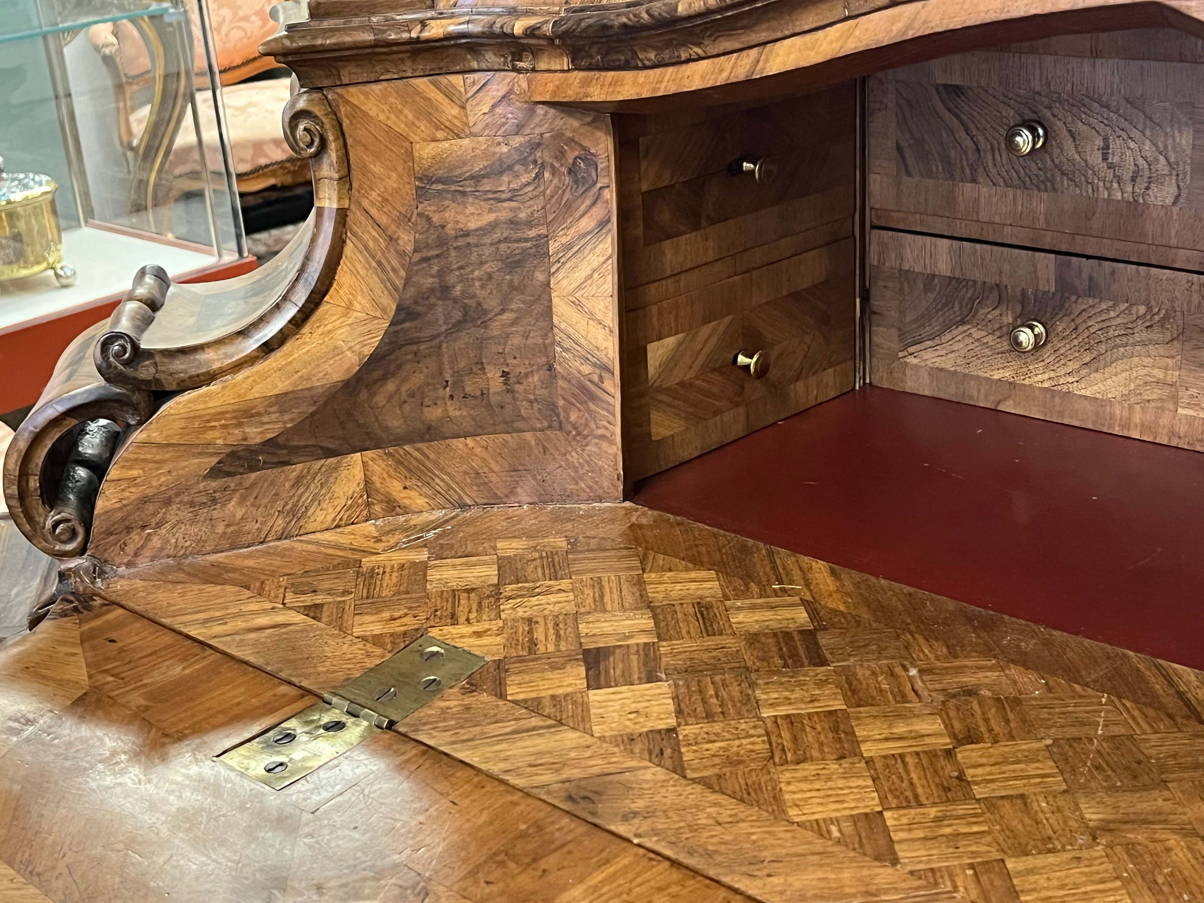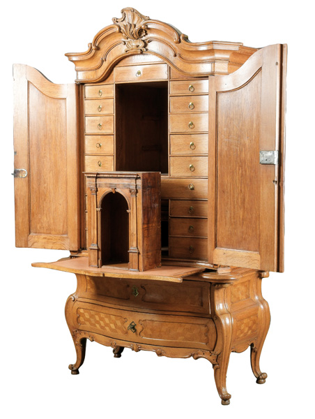 | Auf vier nach außen gestellten und sich nach unten verjüngenden Volutenfüßen stehend. Zweischübiges Kommodenteil mit geschweifter Zarge, abgeschrägten Kanten, gewellten Seiten und überstehender, profilerter Plattenkante mit abgerundeten Ecken. Zurückgesetzter, zweitüriger Aufsatz mit herausziehbarer, lederbezogener Schreibplatte an der Unterkante. Leicht gebogene Front mit den typischen Spangen an den Kanten und gerade Seiten, jeweils in Füllung gearbeitet. Hinter den Türen aufwendige Einteilung: Beinahe mittig plaziert ein durchgehender Schub, flankiert von je acht Schüben. Mittig unterhalb ein offenes Fach mit vier Schüben, der obere mit Geheimfach. Darüber herausziehbarer Tabernakel mit zwei Pilastern, korinthischen Kapitellen und dahinter liegenden Geheimfächern (Fachböden fehlen). Herausragendes, geschweiftes und mehrfach profiliertes Abschlußgesims mit geschnitzter Muschelkartusche. Massiv Eiche geschnitzt mit Rocaillen, Akanthus, Blattwerk, Muscheln und eingerollten Schnecken, teiilweise furniert mit Würfelmaketerie. Alle Schreinerarbeiten sind meisterlich ausgeführt. Das Möbel befindet sich in guten Zustand, hat eine schöne Patina und die Original-Schlösser und -Beschläge.