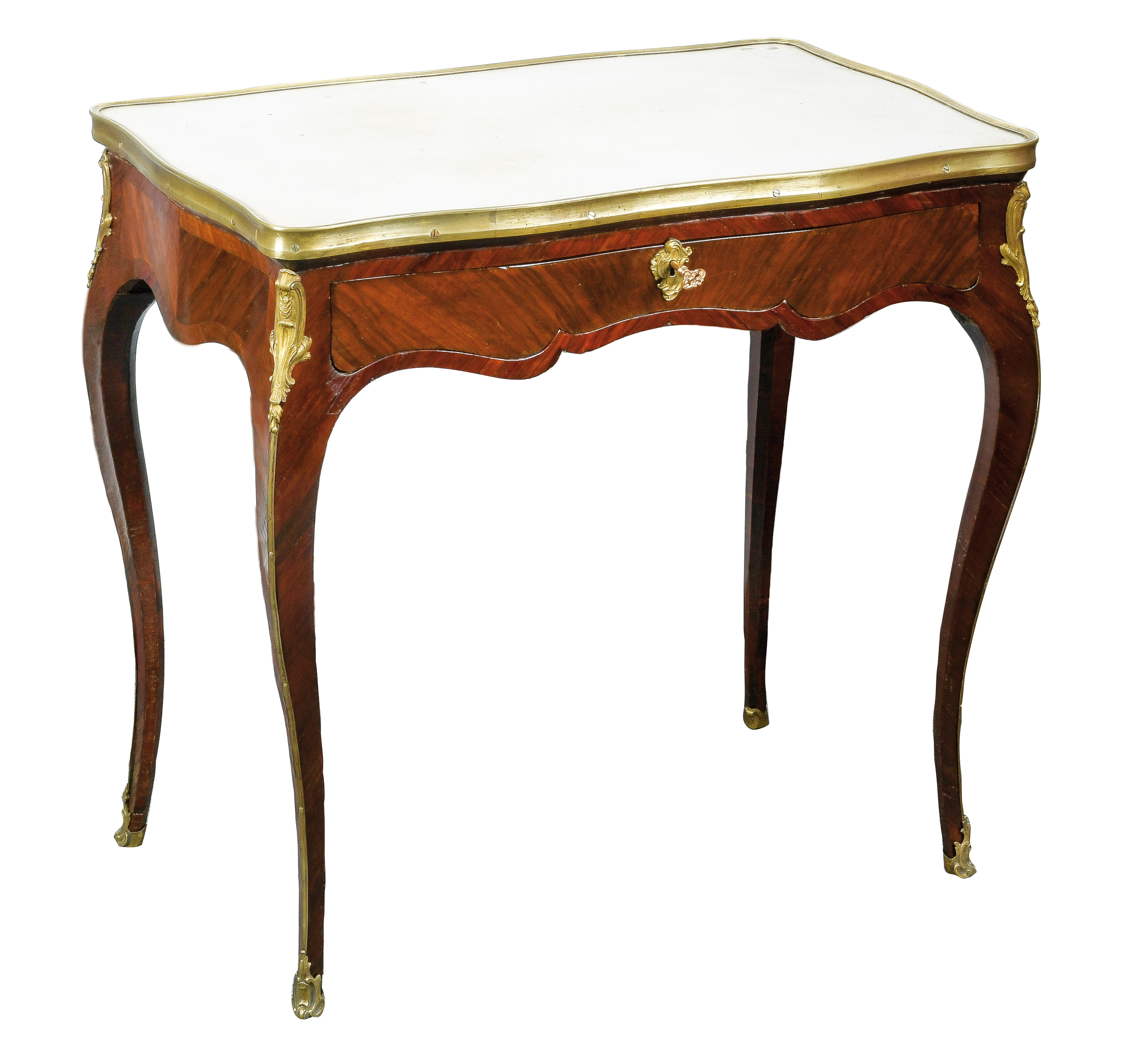| Amarant, furniert und gefriest. Längsrechteckiges, geschweiftes, weißes Marmorblatt mit umlaufender Bronzefassung. Die wellige Zarge mit einer Schublade. Geschweifte, in Sabots ruhende Beine. Überaus fein ziselierte und feuervergoldete Bronzebeschläge. Signiert von Jean-Baptiste II Tuart als Wiederverkäufer und mit dem Pariser Innungsstempel, dem JME versehen, und dem Ebenisten Jacques-Philippe Carel (Meister ab 1723) zuzuweisen. Provenienz: Freiherr Max Emanuel von und zu Sandizell (1702-1778); durch Erbfolge in ununterbrochenem Familienbesitz bis S. H. Carl Hochbrand Graf Sandizell, Schloss Sandizell, Bayern, Auktion Sotheby’s Zürich, 29. November 1995, Los Nr. 183; aus französischem Besitz.Das Wiederauffinden des hier angebotenen, sehr seltenen und mit seiner weißen Marmorplatte ungewöhnlichen und qualitätsvollen Schreib- und Ziermöbel der Louis XV Zeit, darf wohl zurecht als ein Glücksfall bezeichnet werden. Dieses charmante table à écrire der Zeit um 1745-50, kann mit grosser Sicherheit dem Pariser Ebenisten Jacques Philippe Carel zugewiesen werden und steht möglicherweise in Zusammenhang oder im Anschluss zu den umfangreichen und sehr bedeutenden Möbelbestellung des Kurfürsten Carl Albrecht von Bayern (reg. 1726-1745), welcher dieser über den PariserMarchand miroitier, Charles Granier, ab den 1730er Jahren für die Münchener Residenz in Auftrag gab. Unser schlichtes und formschönes Pariser Möbel erinnert sehr an die noch ganz der Régence verpflichteten Möbel des Pariser Meisters Jacques Philippe Carel und ist in solcher Ausführung wie wir sie hier sehen ein Unikat. Besonders interessant für die Möbelforschung ist das Vorhandensein der Signatur von Jean-Baptiste II Tuart, auf dem Sandizell-Möbel. Tuart fils , der mit J.B. Tuart (wie auf unserem Tischchen) oder mit Tuart fils signierte, stellte keine eigenen Möbel her, sondern arbeitete in seinen frühen Jahren im Kloster Saint-Germain-l’Auxerrois vor allem fürseinen Vater Jean-Baptiste I Tuart und später als berühmter Händler von Luxusmobiliar, welches er von seinen Ebenisten-Kollegen bezog. Freiherr Max Emanuel von Sandizell, aus dessen Besitz unser Ziertisch stammte, wurde am 26. Januar 1702 geboren und « eigenhändig von seiner kurfürstlichen Durchlaucht Max Emanuel von Bayern aus der Taufe gehoben und vom Kölner Erzbischof Josef Clemens in der Hofkapelle der Residenz getauft» Max Emanuel von Sandizell absolvierte seine Rechtsstudien in Ingoldstadt undwurde 1725 Kurbayerischer Hofrat, später Generalleutnant, Kommandant undStatthalter zu Ingoldstadt, Komtur des Bayerischen Hausritterordens vom Heiligen Georg. Am St. Martinstag des Jahres 1725 hielt Sandizell Hochzeit mit der Reichsgräfin Maximiliana Topor-Morawitzky von Tenzing und Rudnitz «zu München in der Reichen Kapelle der Residenz in grosser Gala und Anwohnheit der gnädigsten Herrschaften, des ganzen Hofes mit allen Zeremonien». Max Emanuel, mit dem Bayerischen Kurfürsteneng vertraut, war wie dieser ein grosser Förderer der Künste. Es ist anzunehmen, dass Sandizell durch gleiche Vermittlung, wie der Kurfürst, bedeutendes französisches Mobiliar in Paris bestellte oder solches direkt über den ihm eng verbundenen Hof erhielt. Unser Kleinmöbel ist somit mit seiner massiven Marmorplatte nicht nur ein sehr eigenwilliges Werk eines begabten Pariser Ebenisten, es ist auch von historischer Bedeutung.Literatur: Georg August Reischl, „Tausendjähriges Sandizell“, München 1948/50
