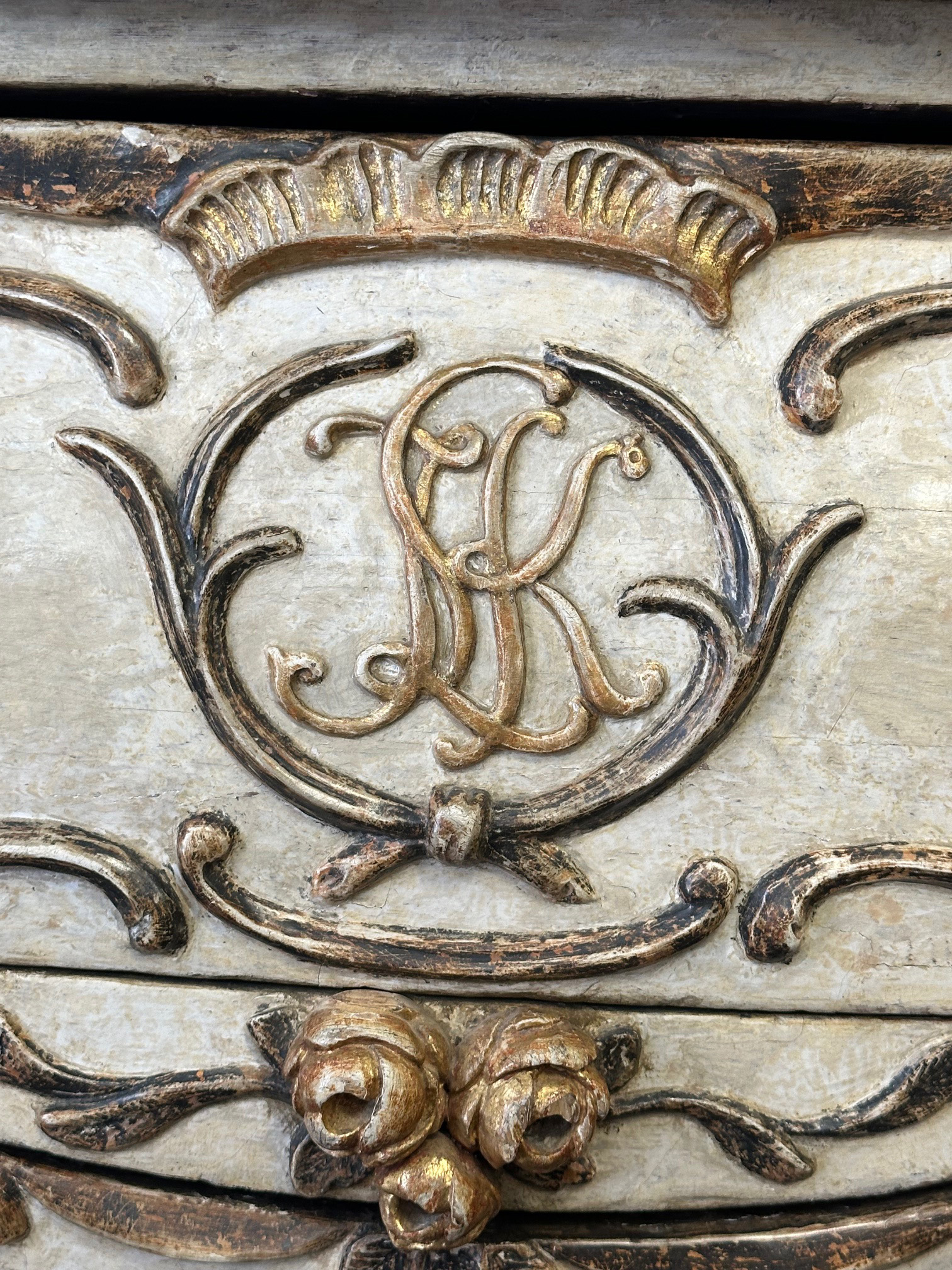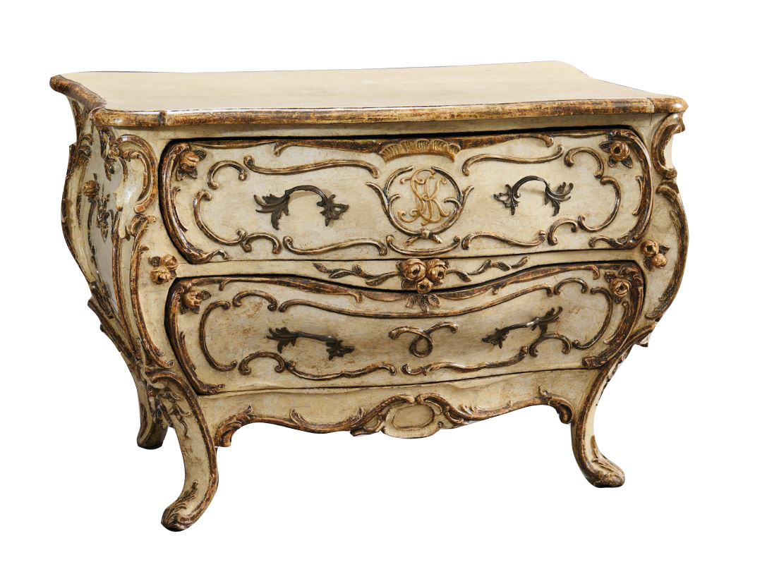 | Wohl nach einem Entwurf des Ferdinand Hundt (1703-1758) mit ligiertem Allianz-Monogramm „JS & CL“ unter Grafenkrone. Weichholz, geschnitzt, schieferweiß gefasst und in Gold und Silber gehöht. Dreiseitig geschweifte, profilierte und frontseitig über den Eckstollen gerundete Platte über virtuos geschweiftem, zweischübigem Korpus auf wellig ausgeschnittener Zarge und nach aussen geschweiften Beinen. Schöne Rokokovoluten in S- und C-Schwüngen umrahmen die schauseitigen Felder, Rosenblüten und Rankenwerk zieren den mehrfach bombierten Korpus. Die mittlereFronttraverse mit drei Rosen unter palmettenumrahmten Allianz-Monogramm, wohl „JS & CL“, darüber eine fünfblätterige Grafenkrone. Die Eckstollen aus drei C-Voluten geformt und fein geschnitzt, die Schmalseiten wiederum mit Rosen und Rankenwerk verziert. Fein ausgeformte florale Bronze-Handhaben.Provenienz: Aus fränkischem Adelsbesitz, mit ligiertem Besitzermonogramm „JS & CL“ (von Seinsheim?); Kunsthandel Fischer-Böhler, München 1950er Jahre;Privatbesitz.Die hier angebotene, in einem prächtigen Originalzustand erhaltene Rokokokommode gehört zu einer kleine Gruppe von besonders seltenen, schieferweiss gefassten Kommodenmöbeln, wie sie in Bamberg in der Zeit um 1755-1765 entstanden sind und wir sie in schönster Form in der aus Schloss Seehof stammenden sogen. «Nacht-Kommode» - ehemals fürstbischöfliches Schlafzimmer - her kennen, einem Prunkmöbel, das sich heute im Metropolitan Museum in New York befindet (Nr. 1974.356.129). In ihrem Buch über das Bamberger Hofschreinerhandwerk, bildet Sigrid Sangl unsere Kommode mit Grafenkrone zusammen mit der Kommode aus demMetropolitan Museum ab und datiert letztere um 1760. Aus stilistischen Gründen, ist eine Datierung unserer Kommode in die Zeit um 1755/60 sinnvoll. Beiden Kommoden gemeinsam sind ihre organische Gestaltung mit ihren wulstartigen Ziervoluten, welche die Kommodenflächen elegant rahmen. Es sind diese Wulstformen, welche wir in so ähnlich dominanter Form etwa an den Kassettenfüllungen der Wandschranktüren im 1. Obergeschoss in Schloss Seehof vorfinden und die in die Zeit um 1755 zu datieren sind, einer Zeit, als die massgeblichen Gestaltungen der fürstbischöflichen Wohnräume unddes Festsaals durch den Bamberger Fürstbischof Johann Philipp Anton von und zu Frankenstein (1695-1753) weitestgehend abgeschlossen und später durch Adam Friedrich von Seinsheim (1708-1779) vervollständigt und besonders in der Parkgestaltung verfeinert wurden. In den 1950er Jahren begann der Ausverkauf der mobilen Ausstattung von Schloss Seehof, bei Bamberg durch den berühmten, aus Bamberg gebürtigen, MünchenerKunsthändler Karl Fischer (1889-1973), Inhaber der Kunsthandlung Fischer-Böhler. Fast die vollständige Möblierung dieses oberfränkischen Schlosses – ein Juwel, welches den Krieg wie ein Wunder im Innern wie im Äussern fast gänzlich unbeschadet überstanden hatte - wurde durch die damals führende Münchener Kunsthandlung an eine bedeutende Kundschaft und hauptsächlich in die USA veräussert. Unter den Möbeln befanden sich etwa die berühmte Treillage-Garnitur des sogen. Frankenstein-Salett, ein eigentlicher Höhepunkt des deutschen Rokokos, aber auch Kommoden, Sitzbänke, Konsolen, Spiegel und sogar ein Grossteil der Gartenskulpturen von Ferdinand Dietz. Der Verkauf der hier angebotenen Kommode an Karl Fischer-Böhler ist in den zeitlichen Zusammenhang mit den Seehof-Verkäufen einzuordnen, welche abcirca 1955 durch Fischer-Böhler abgewickelt wurden. Die Seehof-Verkäufe wurden in den 50er Jahren in der Presse ausführlich kommentiert und von bedeutenden Kunsthistorikern, allen voran Prof. Dr. Heinrich Kreisel (1989-1975), scharf kritisiert. Zukünftiger Forschung wird es gelingen, nachzuweisen, welche fränkische Adelsfamilie als Auftraggeber unserer seltenen und charaktervollen Kommode in Frage kommt. Nach den grossen Verlusten der 50er Jahre, nimmt unsere Bamberger Kommode eine umso herausragendere Stellung unter den wenigen erhaltenen weißgefassten höfischen Kommoden Oberfrankens und Bayerns ein.Vgl. Sigrid Sangl, „Das Bamberger Hofschreinerhandwerk im 18. Jahrhundert“, München 1990, S. 109 mit Abbildung der hier angebotenen Kommode und Abb. 105 für die Seehofer Kommode im Metropolitan Museum of Art, New York;Prof. Dr. Heinrich Kreisel, „Der Untergang der Garten- und Raumausstattung des Schlosses Seehof“, in: Schöne Heimat, Jg. 48, H. 1/ 2 , München 1959; Sigrid Sangl, „Das Bamberger Hofschreinerhandwerk“, München 1990, Nr. 109, id. abgebildet.