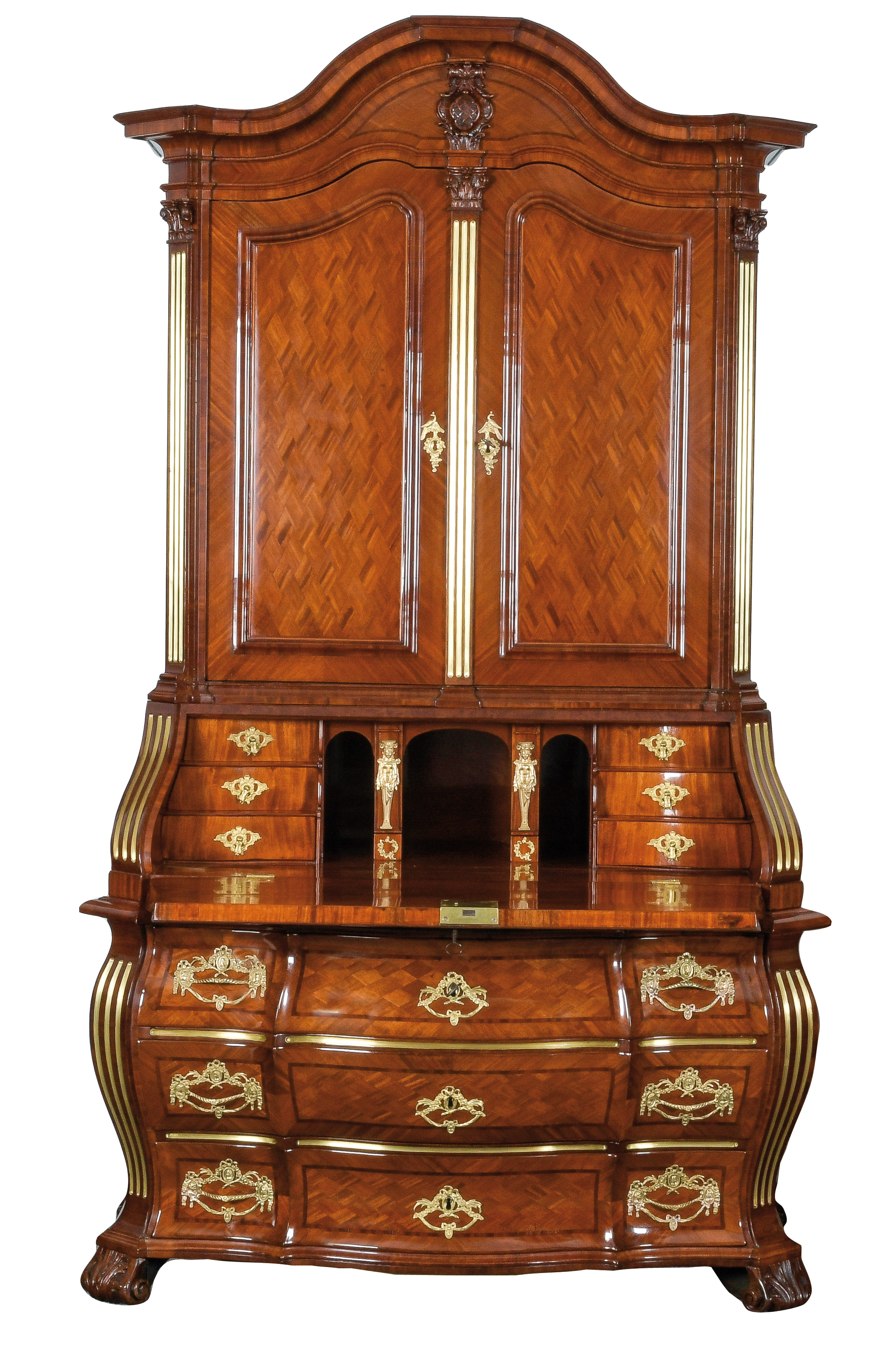 | Dreischübiges, geschweiftes und gebauchtes Kommodenteil mit profiliertem Sockel auf vier nach außen gerollten Füßen stehend. Profilierte Plattenkante mit zurückgesetzter, gewellter Schreibklappe. Dahinter liegende Einteilung mit mittig drei offenen Fächern, flankiert von je drei übereinander liegenden Schüben. Die drei Rundbögen mit integrierten Geheimfächern. Zweitüriger Aufsatz mit abgeschrägten, kannelierten Kanten und in Füllung gearbeiteten Türen, umrahmt von Profilleisten. Gebogenes, verkröpftes Abschlussgesims, meisterlich ausgearbeitet. Eichenkorpus, furniert mit Mahagoni mit Bandintarsien und Würfelmarketerie, teilweise massiv und geschnitzt mit Akanthus, Rocaillen, Kartusche, eingerollten Schnecken und korinthischen Kapitellen; feinstens ausgeformte feuervergoldete Bronzebeschläge mit Akanthus, Rocaillen, Schleifen, Karyatiden, hängenden Tüchern, Blättern und Maskaronen; originale Schlösser. Vgl. H. Kreisel, Bd. II, Nr. 857, Landesmuseum Oldenburg. (hervorragender Zustand mit Schellackpolitur)
