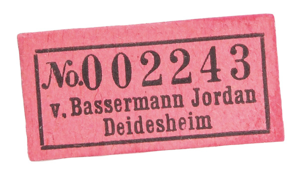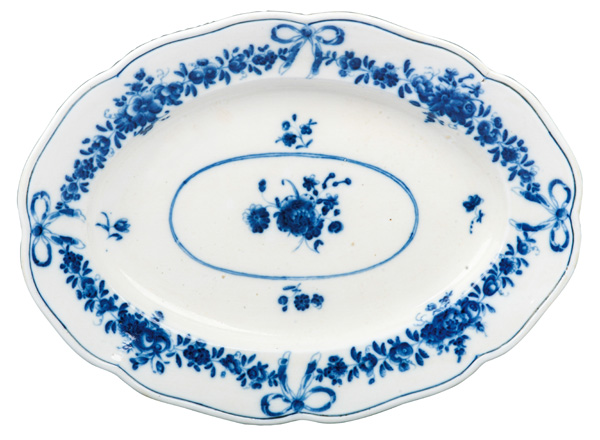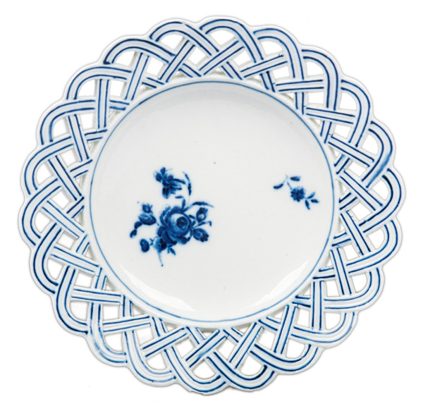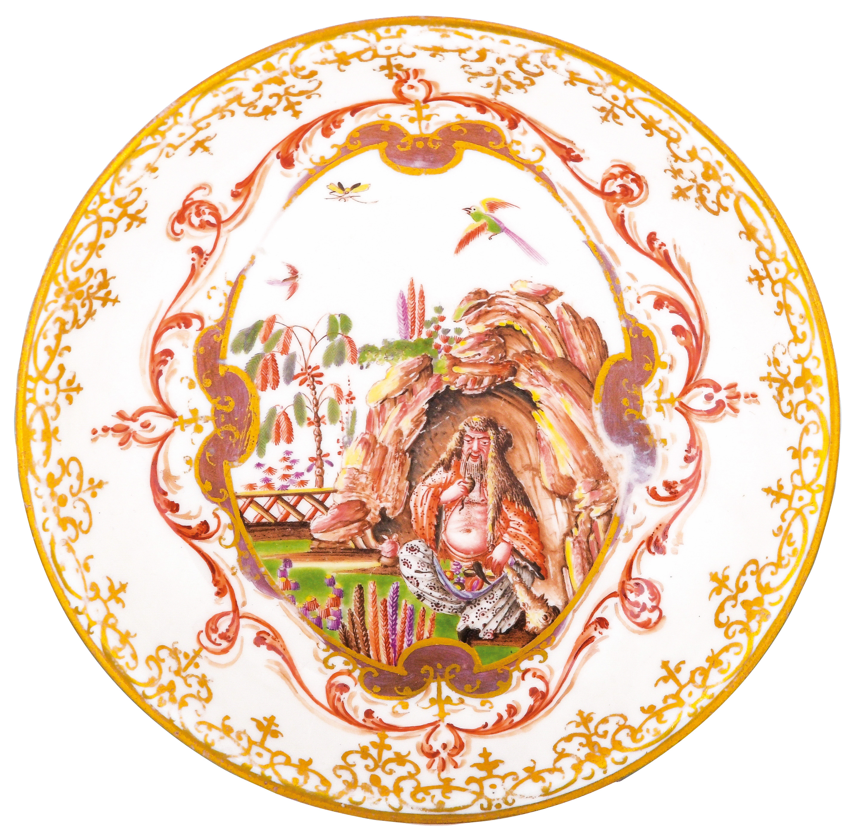 | Gemuldet, mit steigender Fahne und Goldspitzenbordüre. Spiegel mit Goldspitzenkartusche, unterlegt mit Böttgerlüster und umsäumt von korallenroten Blattranken. Reserve exzellent bunt bemalt mit stehendem Afrikaner, Papageien und Insekten in Landschaft. Weißes Böttgerporzellan, ohne Marke, verso Goldziffer „4.“. Vgl. R. Rückert 1966, Taf. 44, Nr.140ff.