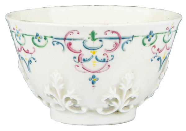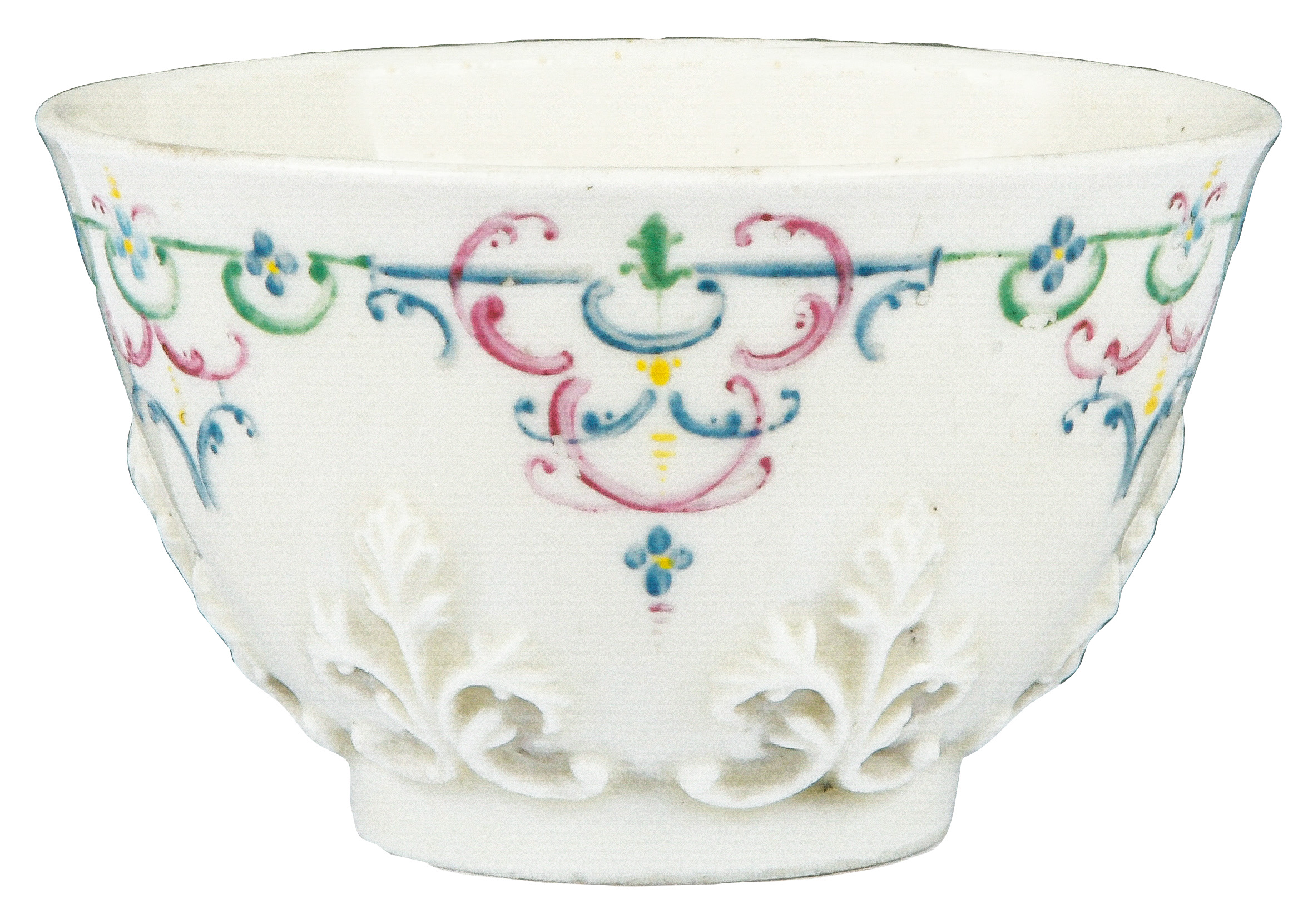 | Walzenförmig, sich nach unten verjüngend. Wandung umlaufend mit geschnittenen Akanthusblättern. Oberhalb bunt in Emailfarben bemalt mit C-förmigen Ornamenten. Weißes Böttgerporzellan, ohne Marke. Modell von Johann Jacob Irminger. Malerei von Johann Georg Funke. Vgl. R. Rückert 1966, Taf. 11, Nr. 27.