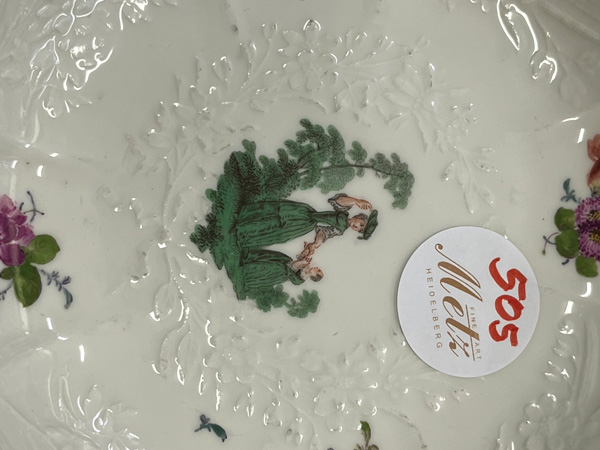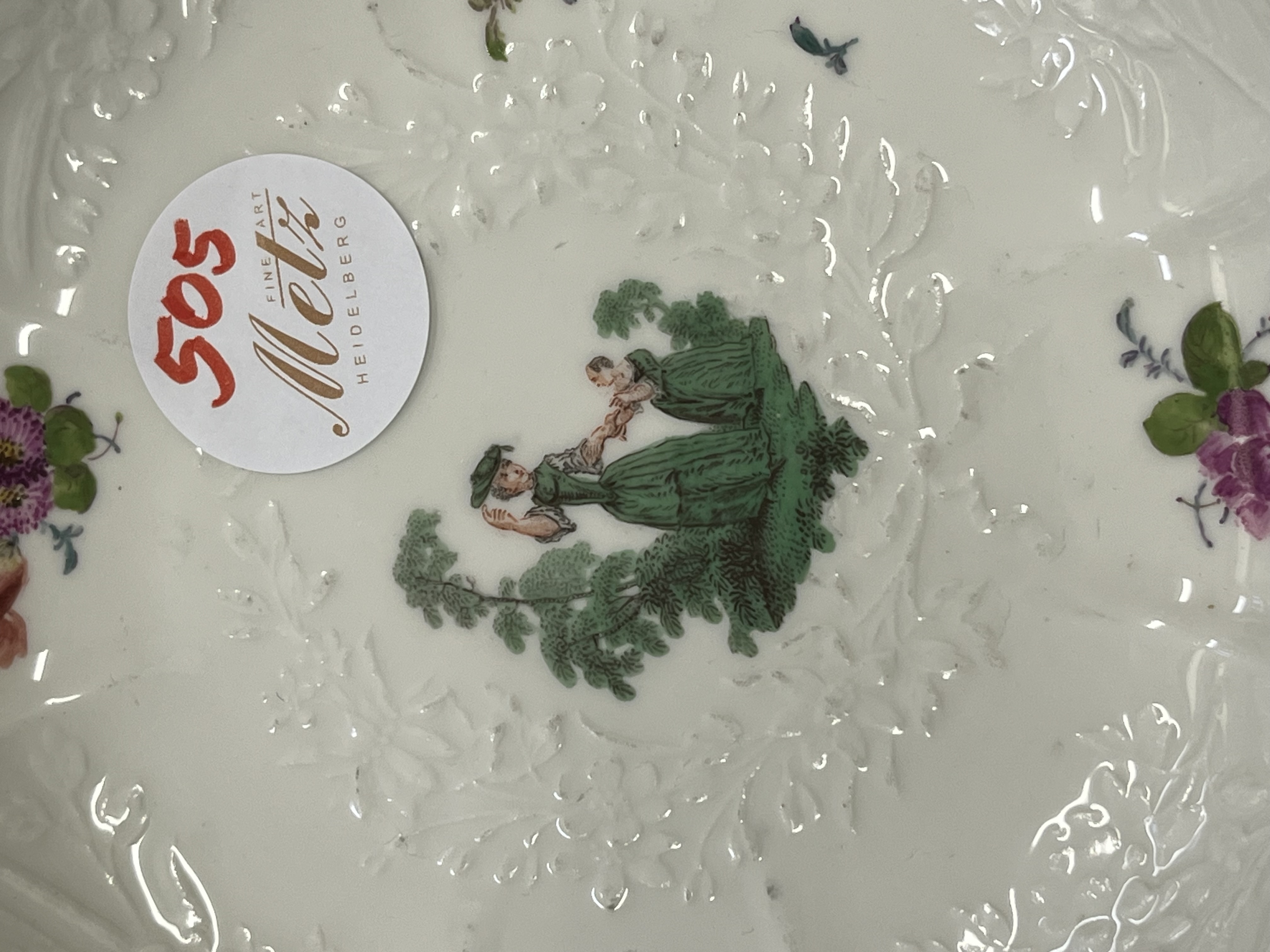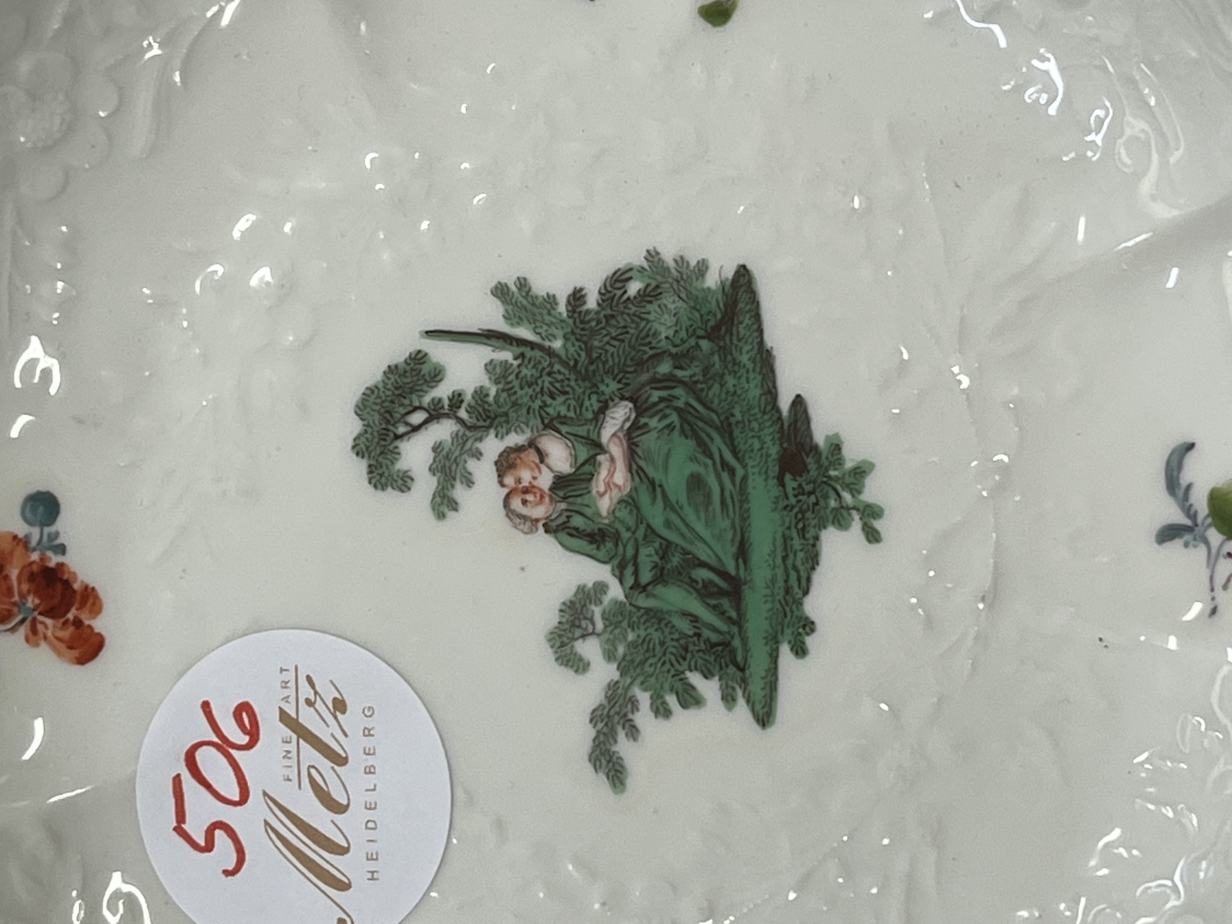 | Schauseiten mit floralem Reliefdekor „Dulong“. Freiräume kupfergrün bemalt mit Watteauszenerie und bunt bemalt mit Streublumen, Ränder gold gesäumt. Porzellan, am Boden unterglasurblaue Schwertermarke sowie purpurn „CHC“ (Cönigliche Hof Conditorei).