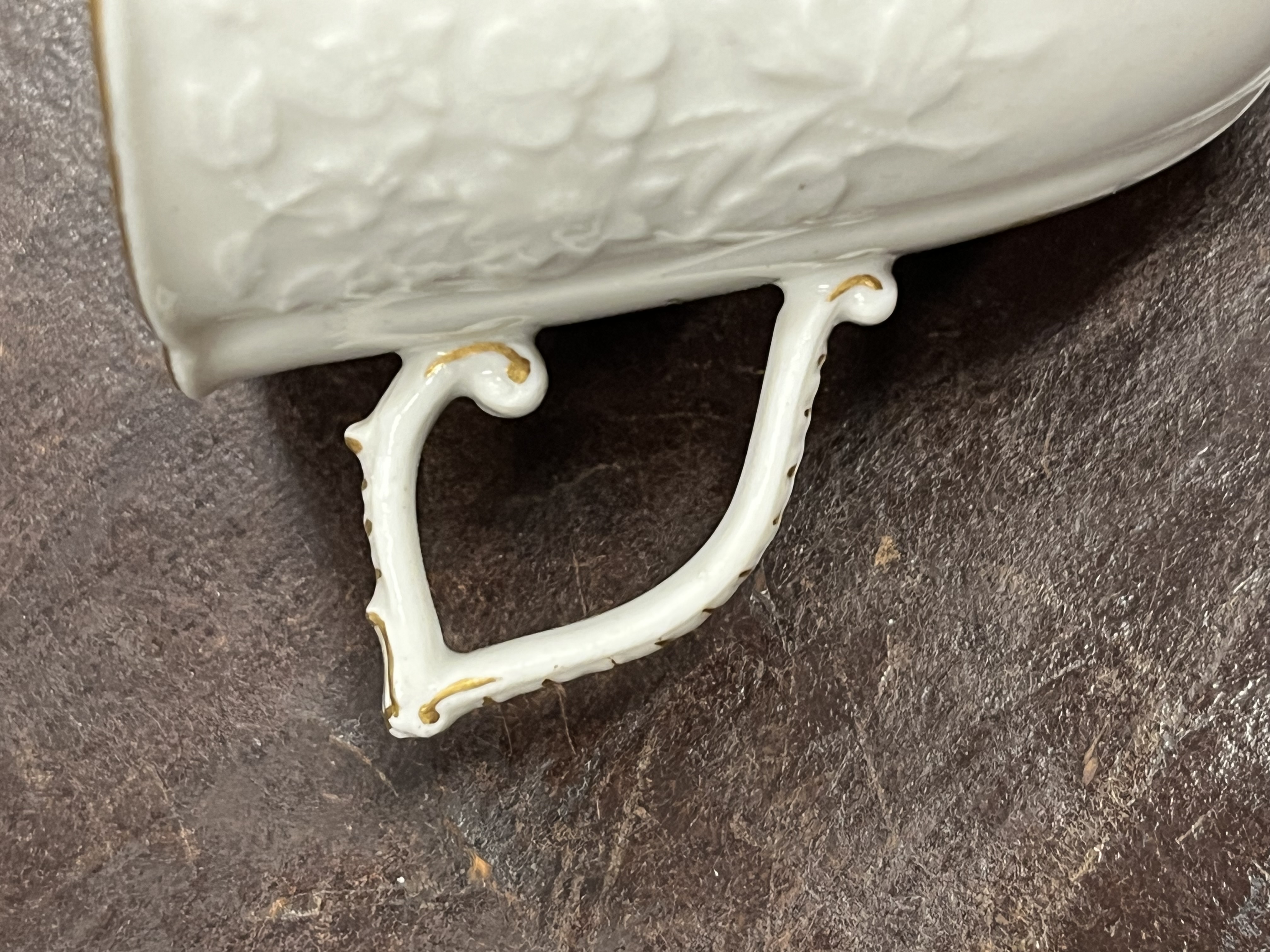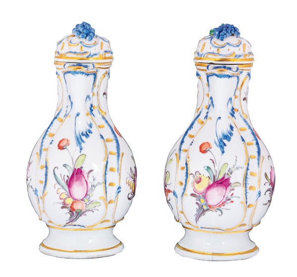 | Je birnförmig, auf rundem, eingeschnürtem Standring. Aufwendig rocaillemodellierter, durchbrochener Henkel und kurze, V-förmige Schnaupe. Gewölbter Deckel, bekrönt von roten Weintrauben. Wandung aufwendig roccaillemodelliert, blau und gold gesäumt. Freiräume bunt bemalt mit Floraldekor. Porzellan, ohne Marke, am Boden Ritzzeichen „9L“ oder „76“. Malerei Umkreis Joseph Zächenberger. (unwesentlich min. best.)