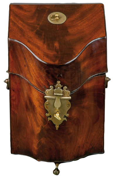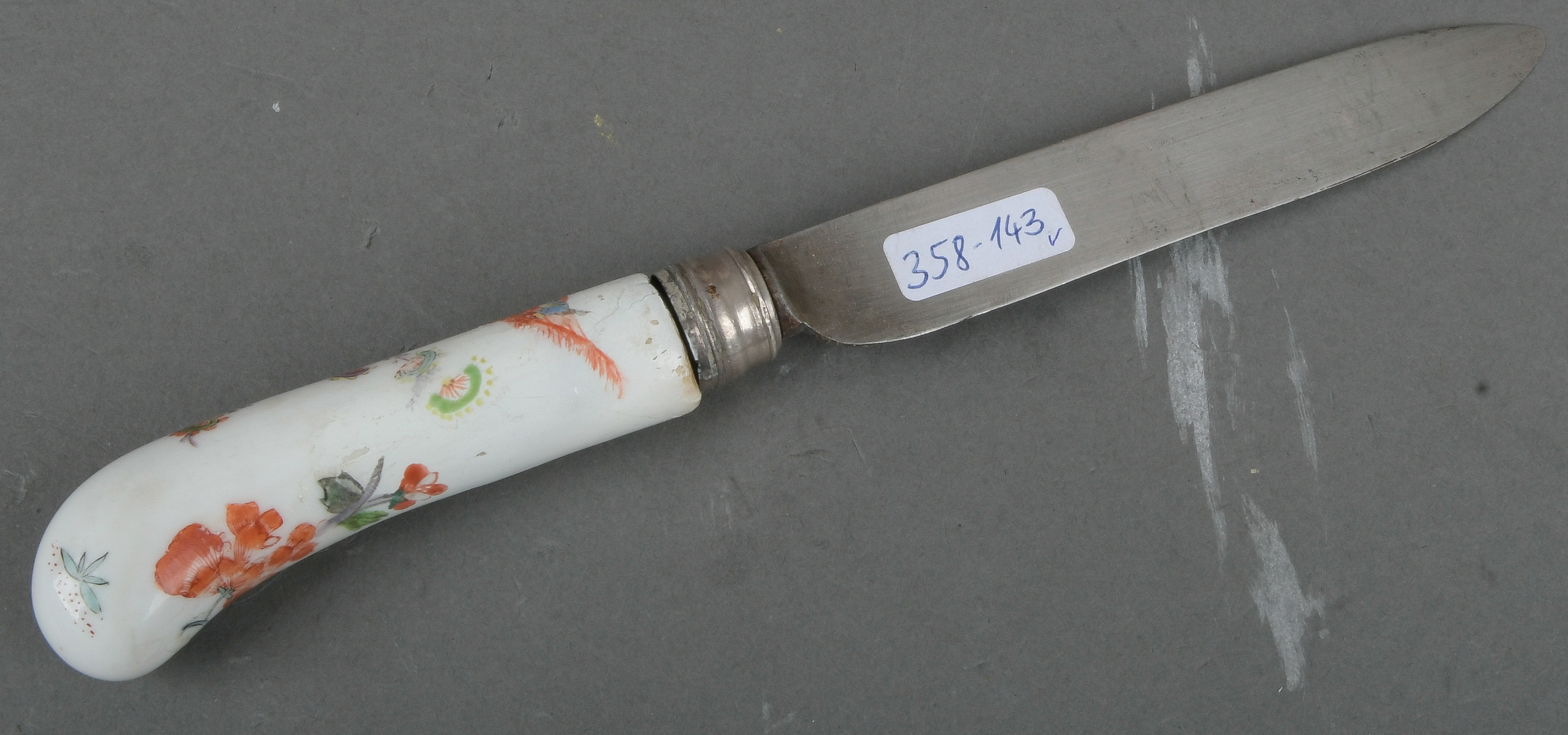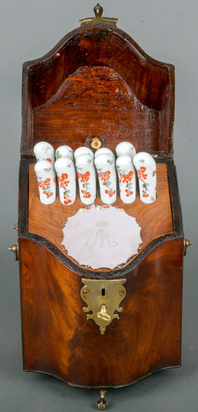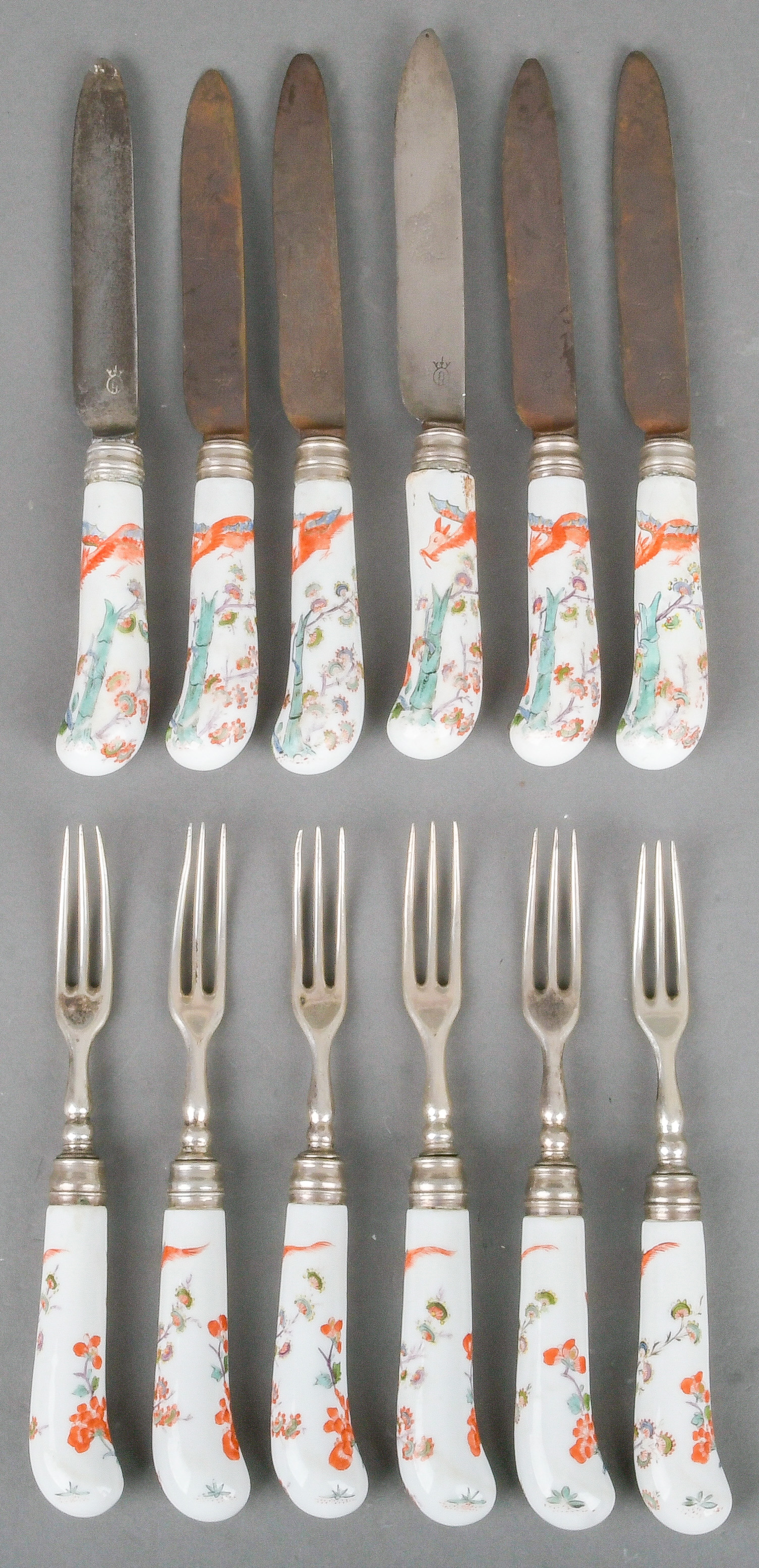 | Je mit Porzellan-Pistolengriff, bunt bemalt mit asiatischen fliegenden Drachen und Kakiemonblütenzweigen. Bestehend aus: Sechs Messer und sechs Gabeln mit Zinken und Klingen aus Eisen und Silbermanschette. Geschweifter Mahagoni-Besteckkasten auf Messingfüßen. Innen die eingesteckten Besteckteile. Unterhalb eine runde Silberplakette mit dem ligierten Monogramm „AR“ mit Krone.