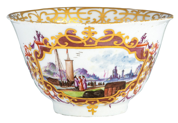 | Walzenförmig, sich nach unten verjüngend mit überlappendem Lipppenrand und Goldspitzenbordüre. Schauseiten bunt bemalt mit Kauffahrteiszenerien in Goldspitzenkartuschen mit Böttgerlüster, korallenrot gesäumt. Verso bunt bemalt mit Kakiemonblütenzweigen. Weißes Böttgerporzellan, unterglasurblaue Schwertermarke, mit Goldziffer „61.“. Malerei Umkreis Johann Gregorius Hoeroldt. Vgl. R. Rückert 1966, Taf. 43, Nr. 133ff. (feiner Haarriss)