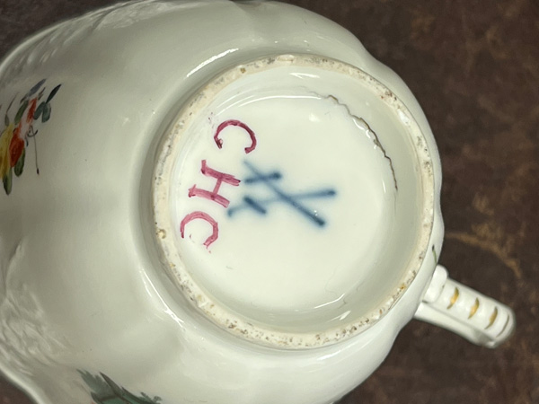 Beide Teile bunt floral bemalt und mit Goldrand. Porzellan, am Boden unterglasurblaue, bekrönte, ligierte CT-Marke, REM Sammlungs-No. 002147.