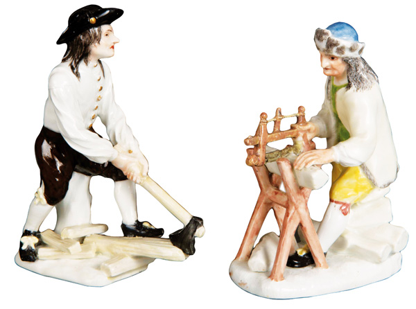 | Je leicht gebeugt stehend, die Arbeit verrichtend, auf ovalem unregelmäßigem Sockel. Porzellan, bunt bemalt. Eine Figur verso am Sockel mit unterglasurblauer Schwertermarke. Modelle von Johann Joachim Kaendler. Auszug aus der Taxa Kaendlers vom 20. November 1745: „...1 Dazu gehöriger Bauer, so das geschnittene Holz hauet oder spaltet, zur Graff Brühl Conditorey.“ Provenienz: Slg. Rockefeller, New York. Vgl. „Inventarliste der Brühl'schen Conditorey vom 1. Oct. 1753, Cap. 16, Nr. 6“; Katalog Dresdner Zwinger 2006, Nr. 41 u. 42. (rest.)