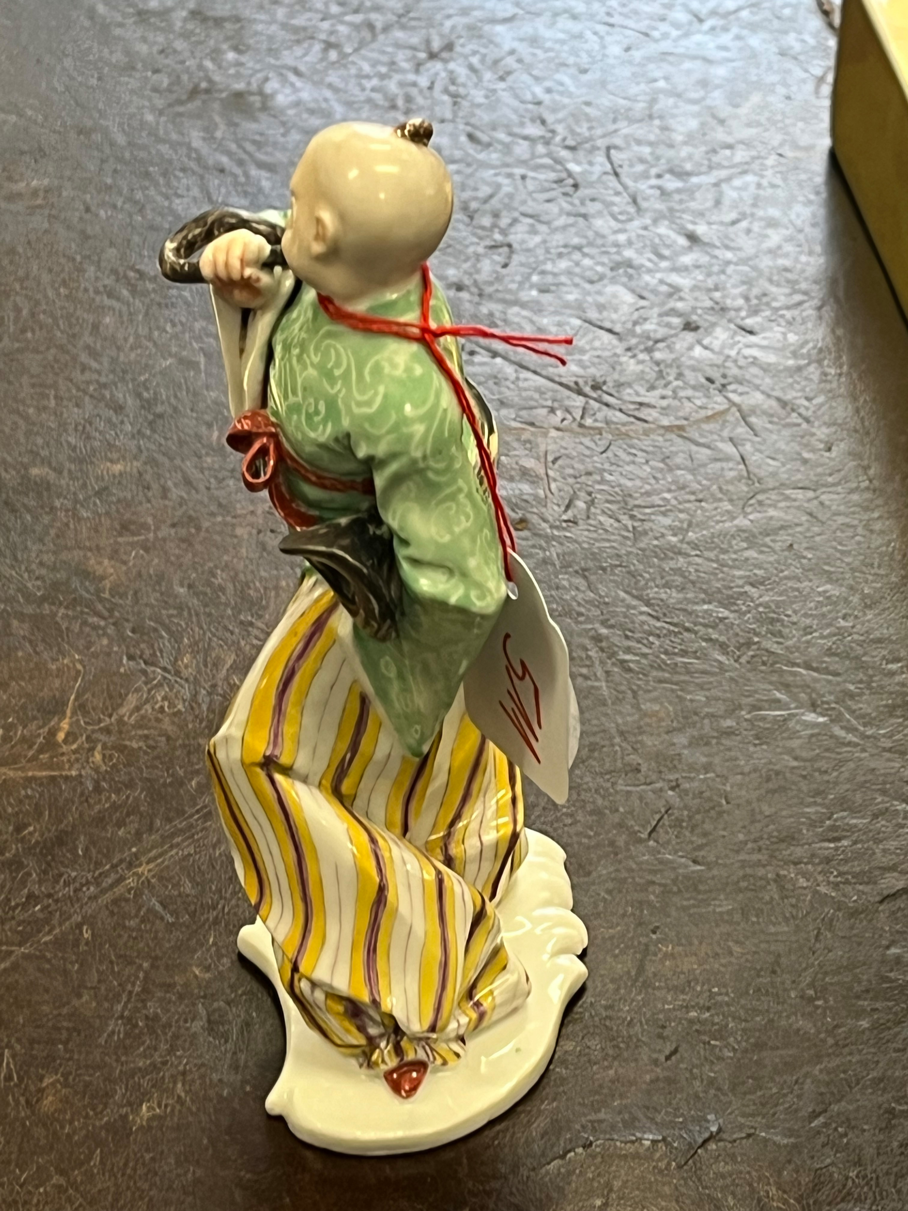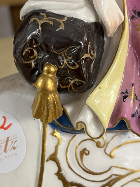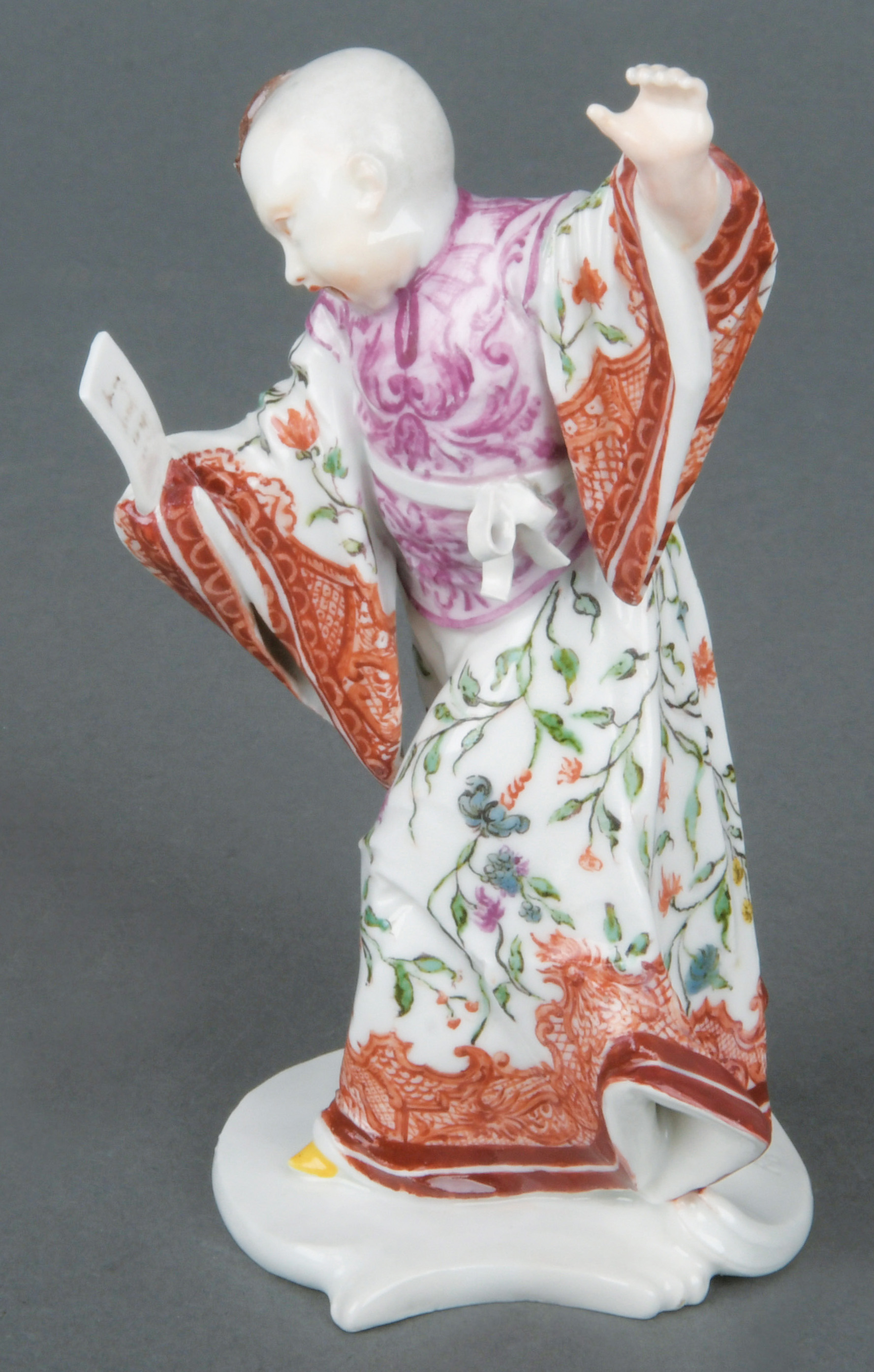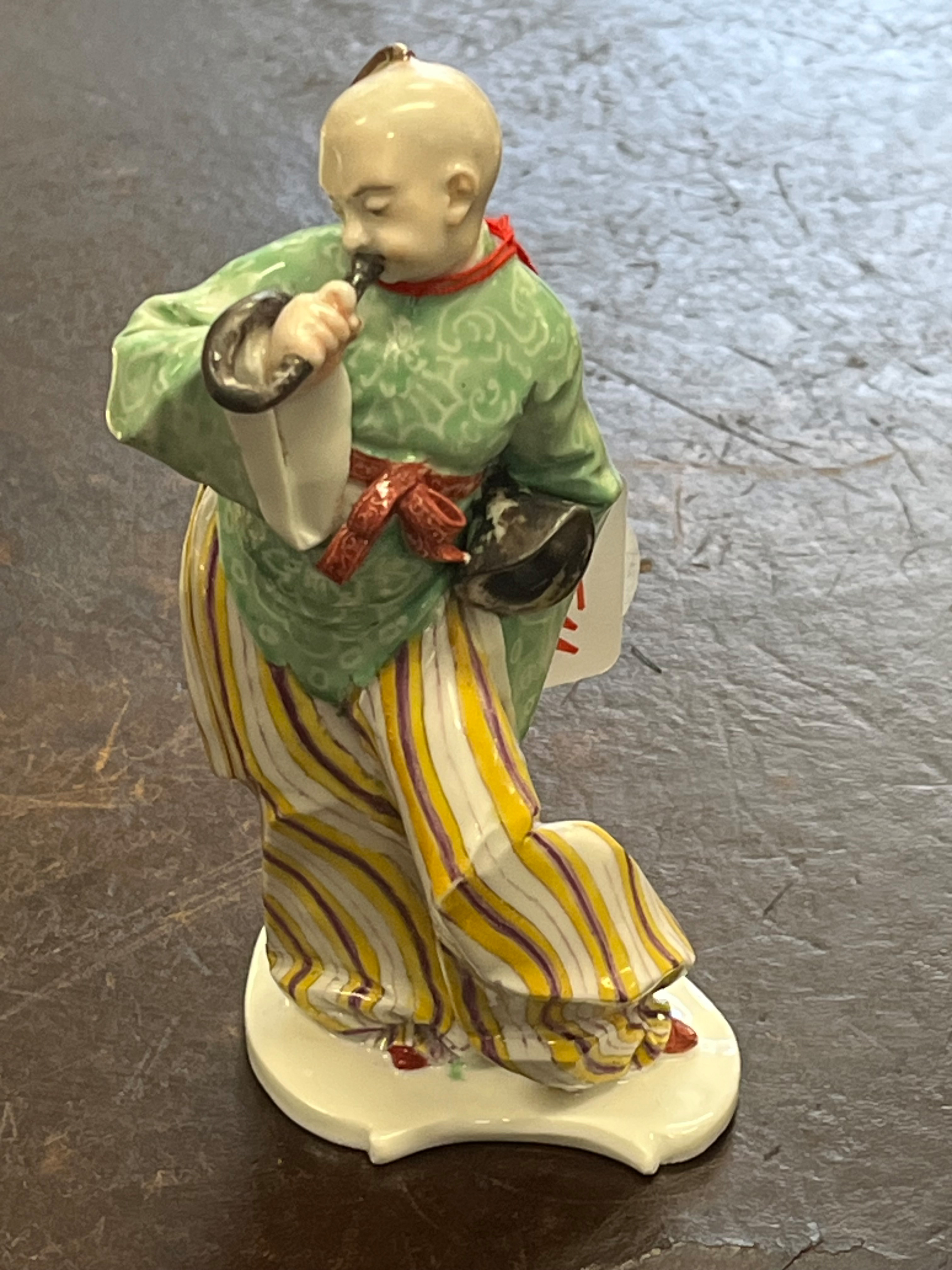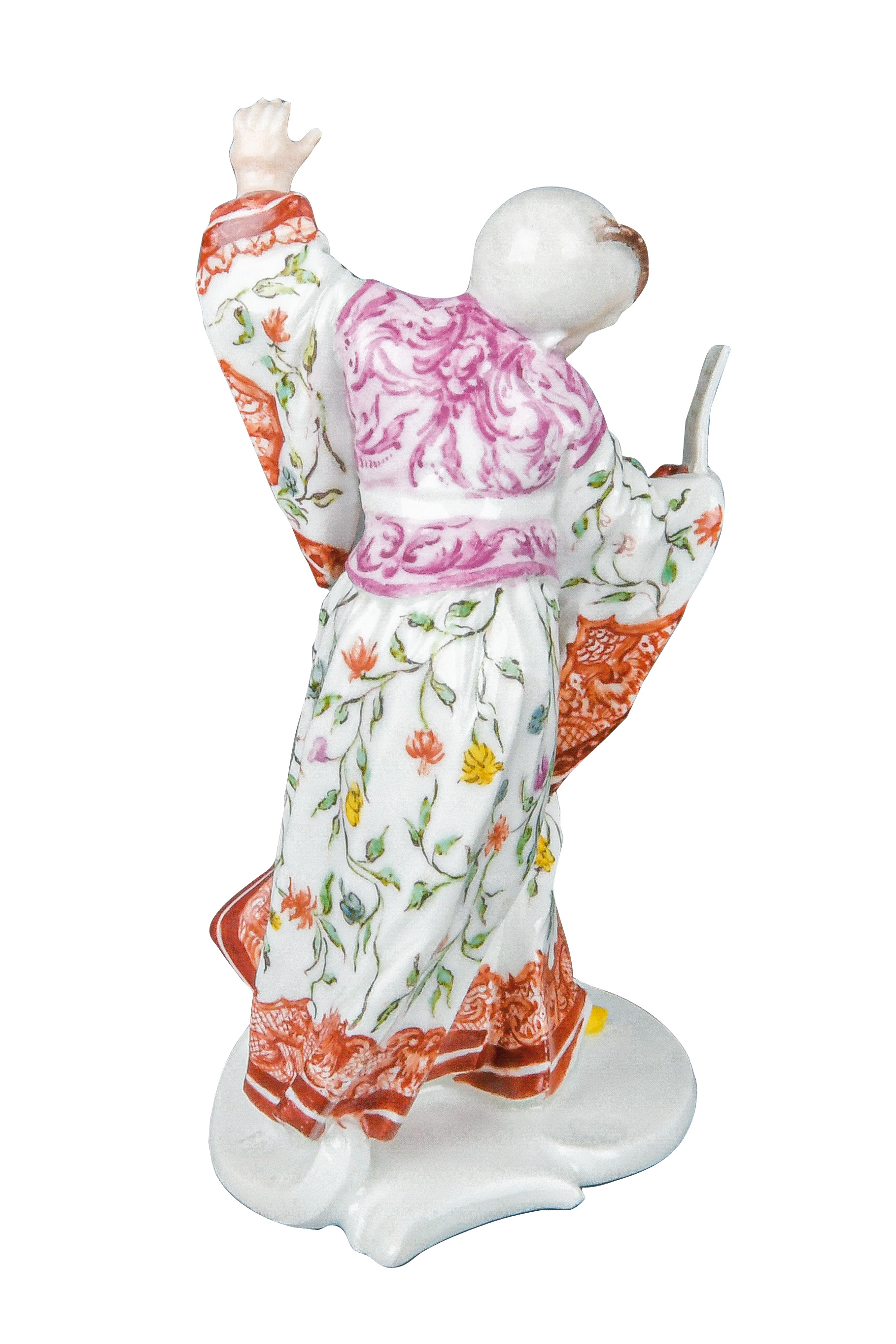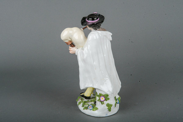 | Auf ovalem, unregelmäßigem Sockel mit aufbossierten Blüten und Blättern stehend. In den Händen das Instrument haltend. Porzellan, bunt bemalt, ohne Marke. Modell von Johann Joachim Kaendler. Vgl. S.-K. Andres-Acevedo, „Die autonomen figürlichen Plastiken“, Stuttgart 2023, S. 114, Nr. 288. (best. mit Rissen)