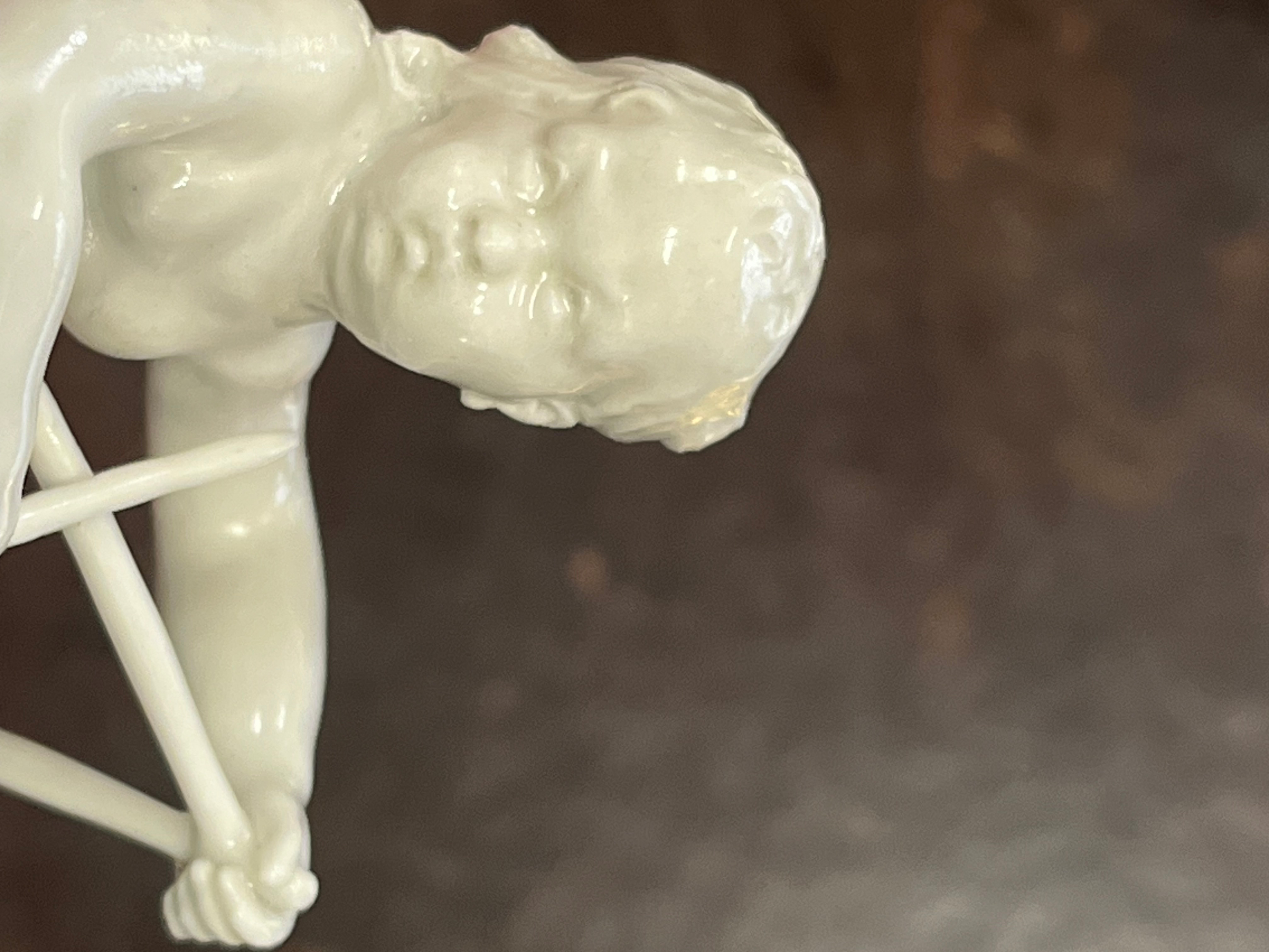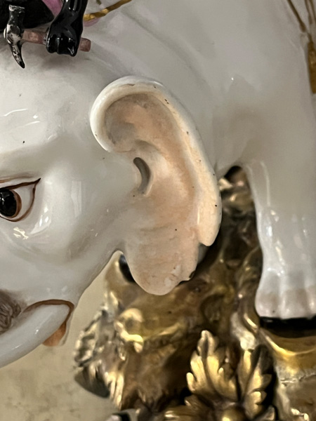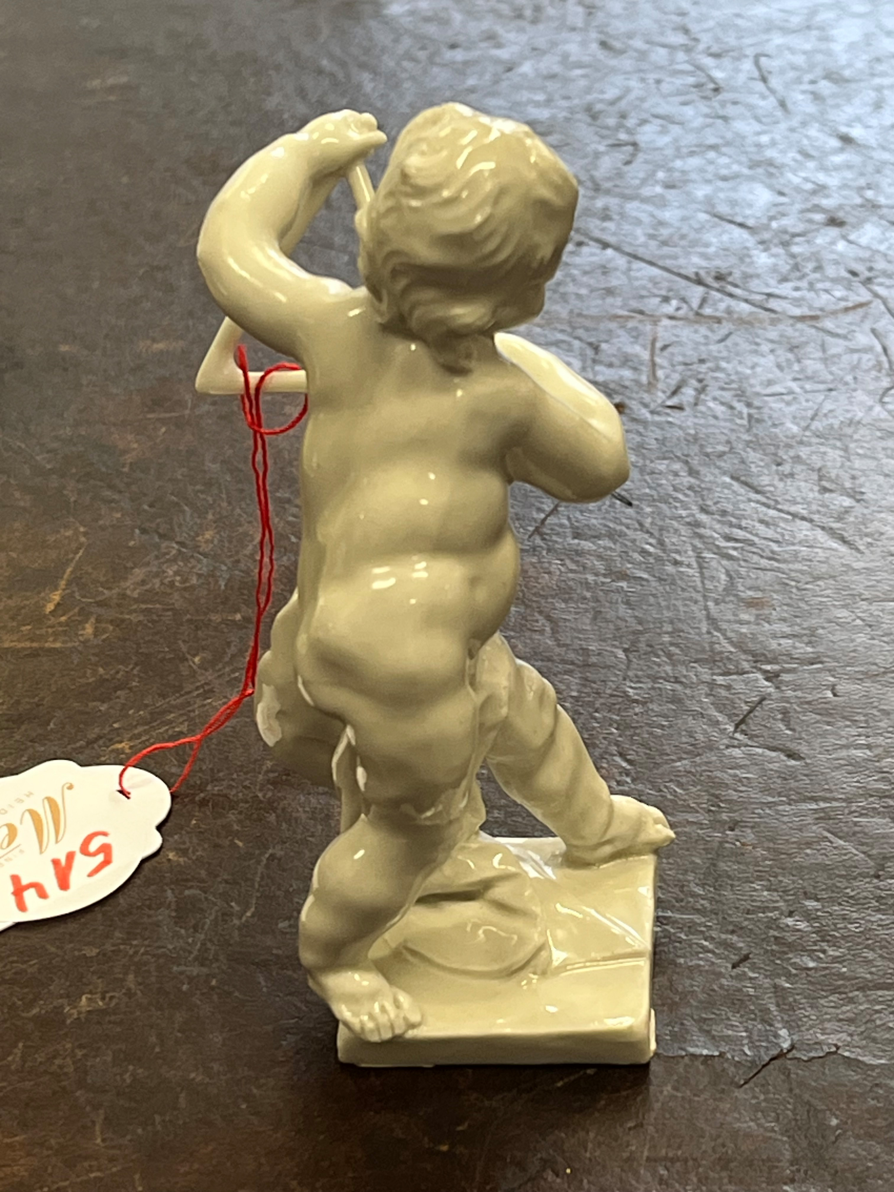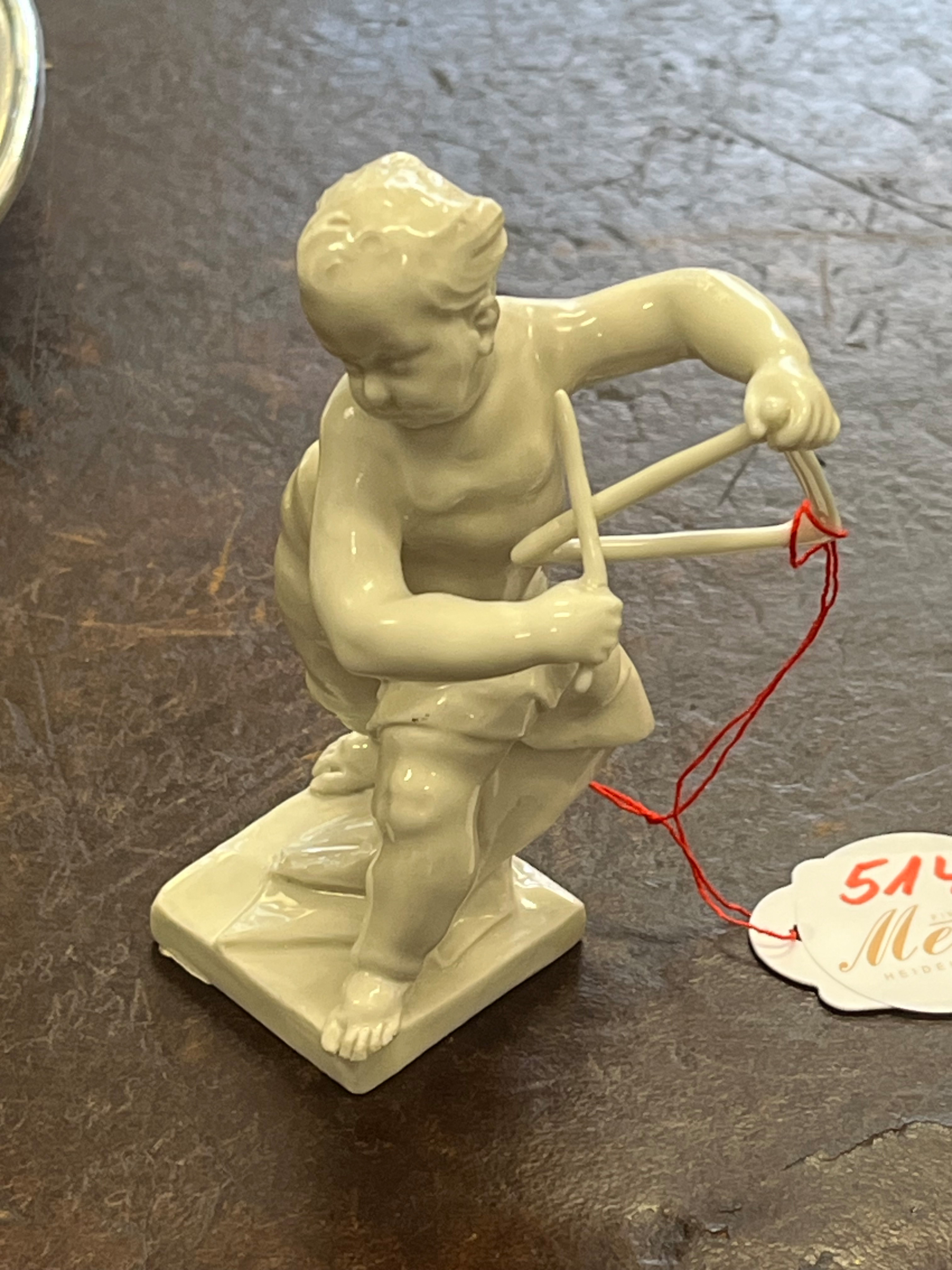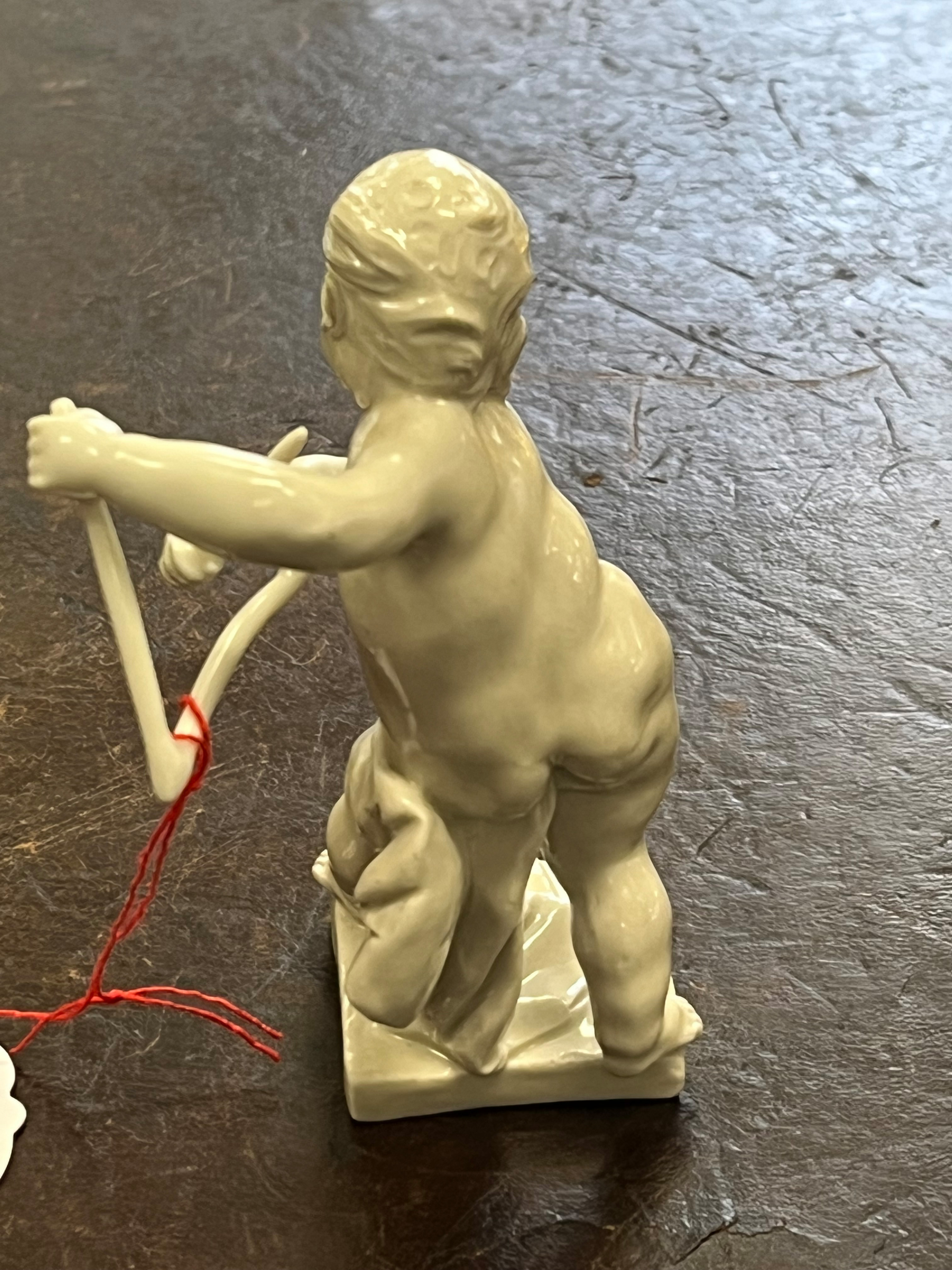 | Auf ovalem, unregelmäßigem Sockel mit aufbossierten Blüten und Blättern stehend. In den Händen das Instrument haltend. Porzellan, bunt bemalt, ohne Marke. Modell von Johann Joachim Kaendler. Vgl. S.-K. Andres-Acevedo, „Die autonomen figürlichen Plastiken“, Stuttgart 2023, S. 114, Nr. 288. (best. mit Rissen)