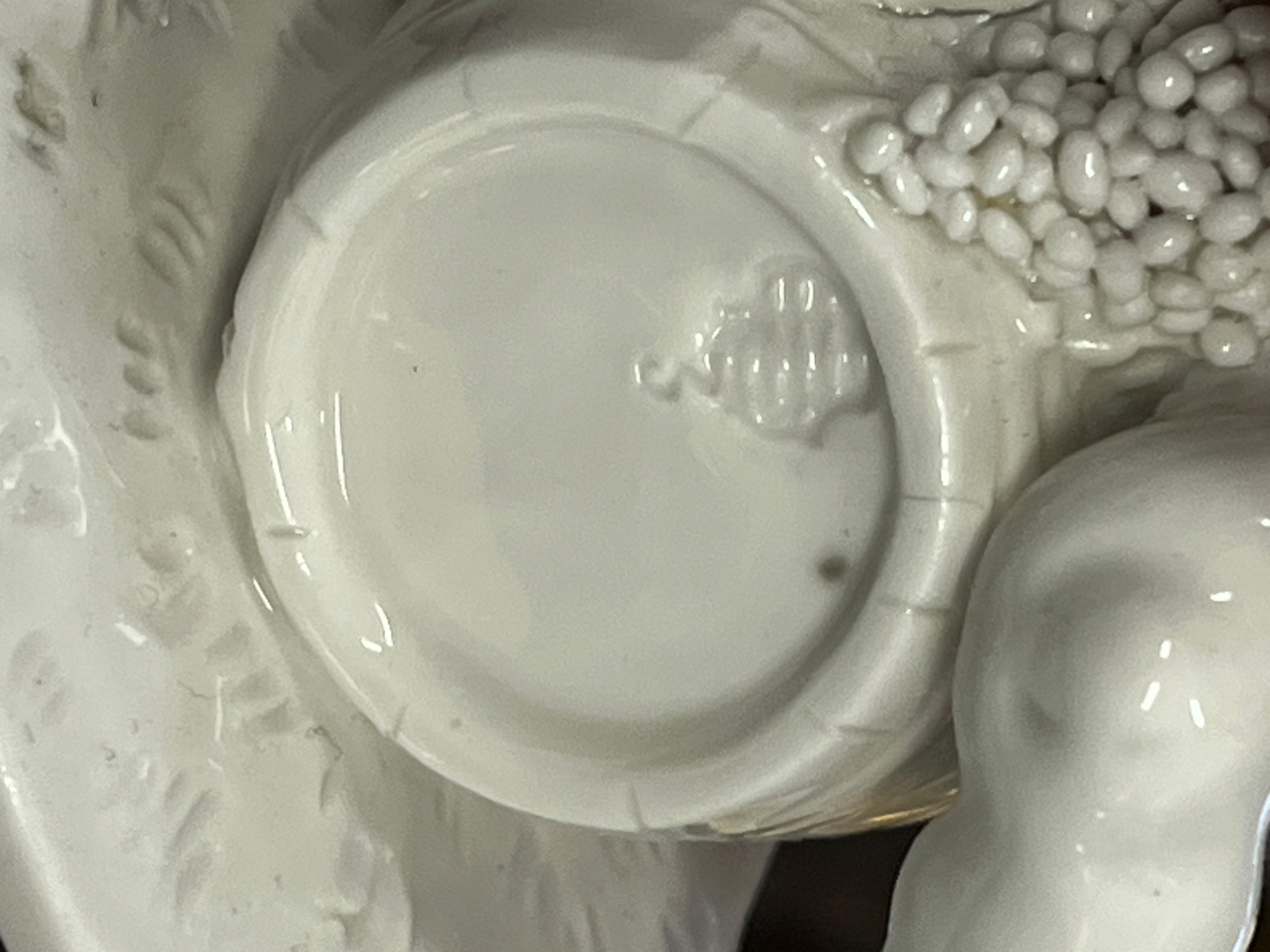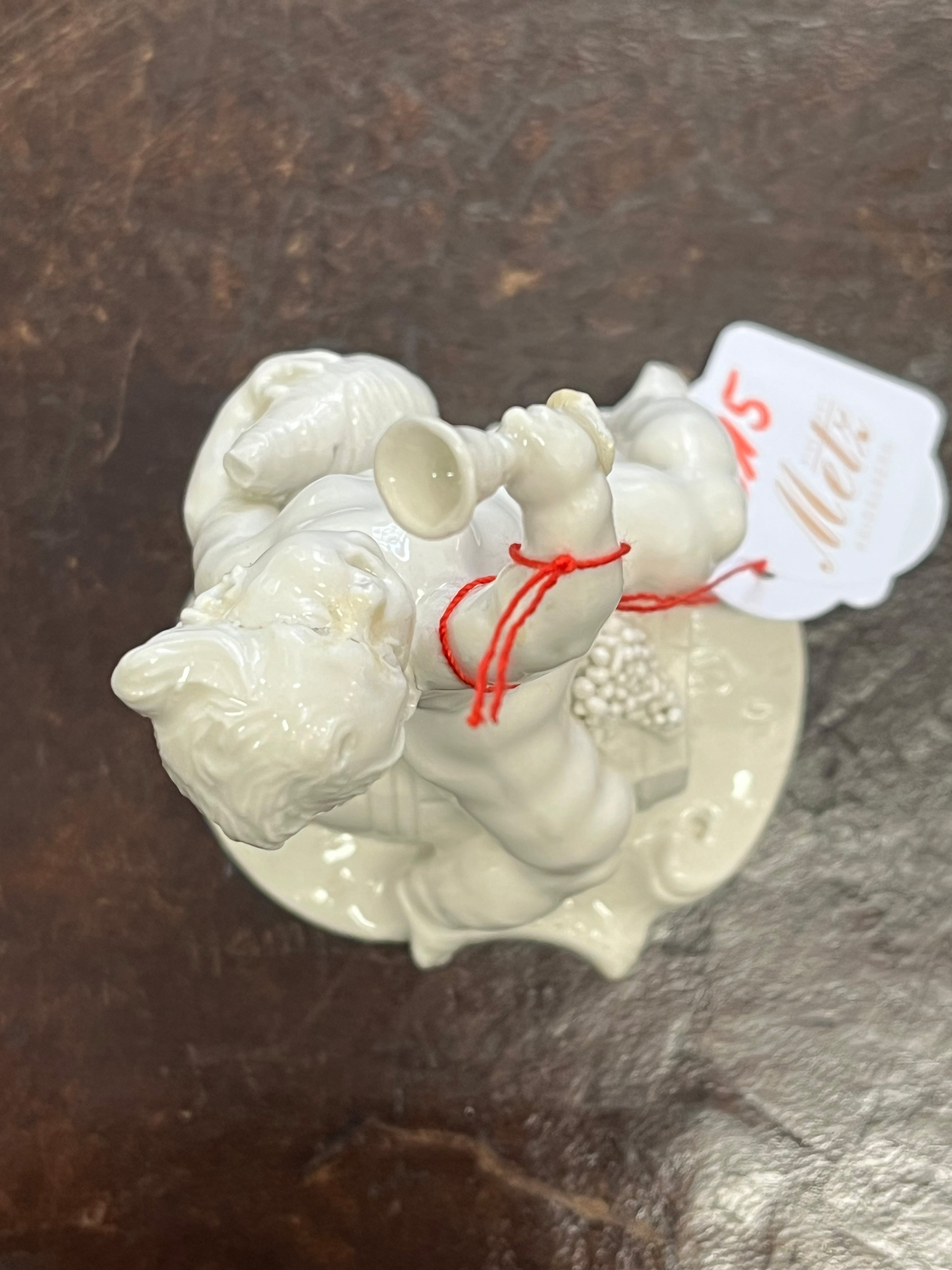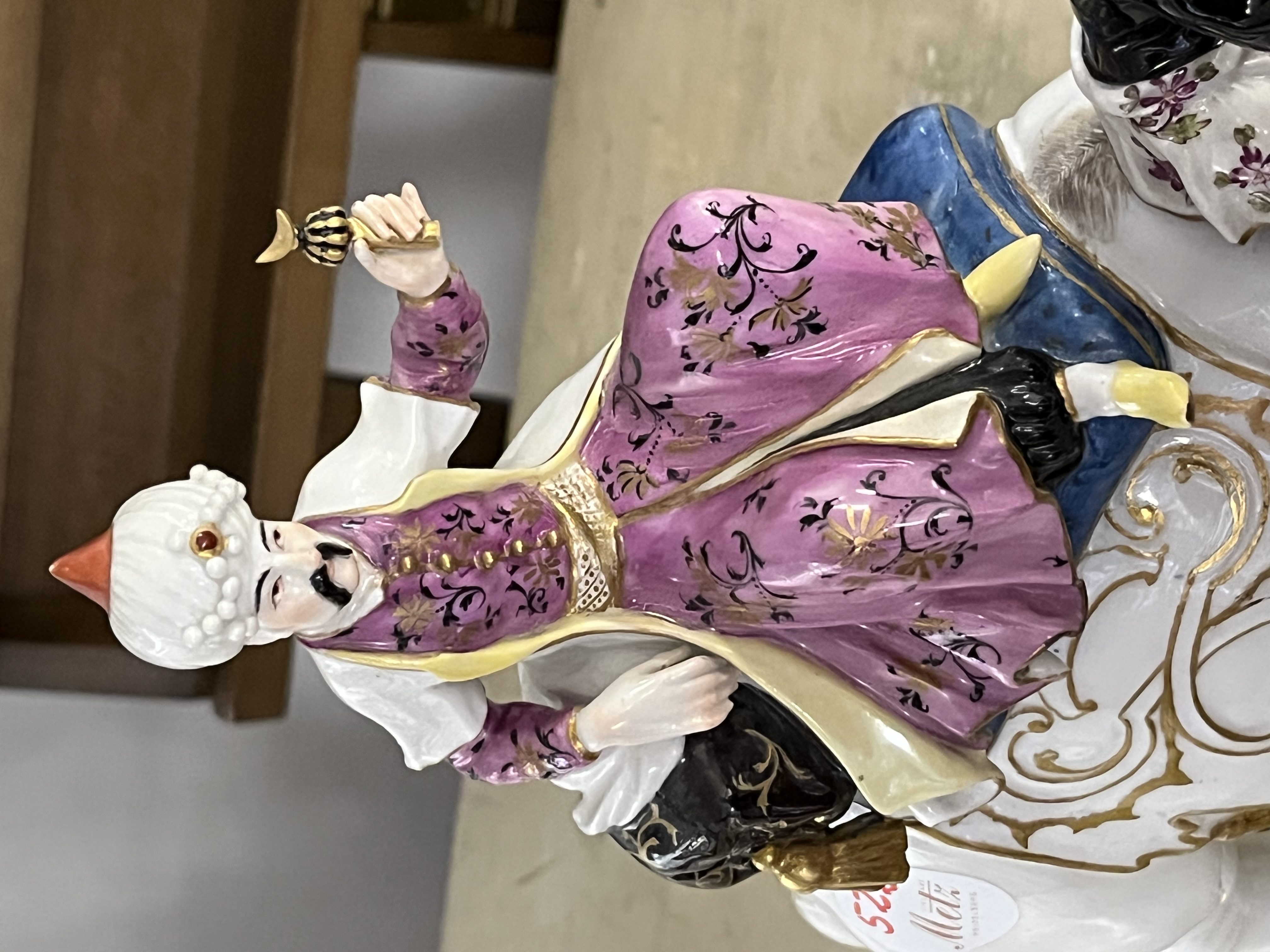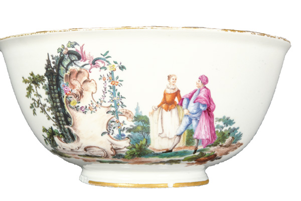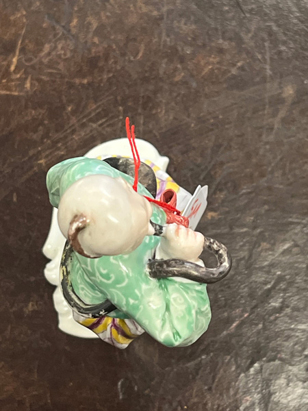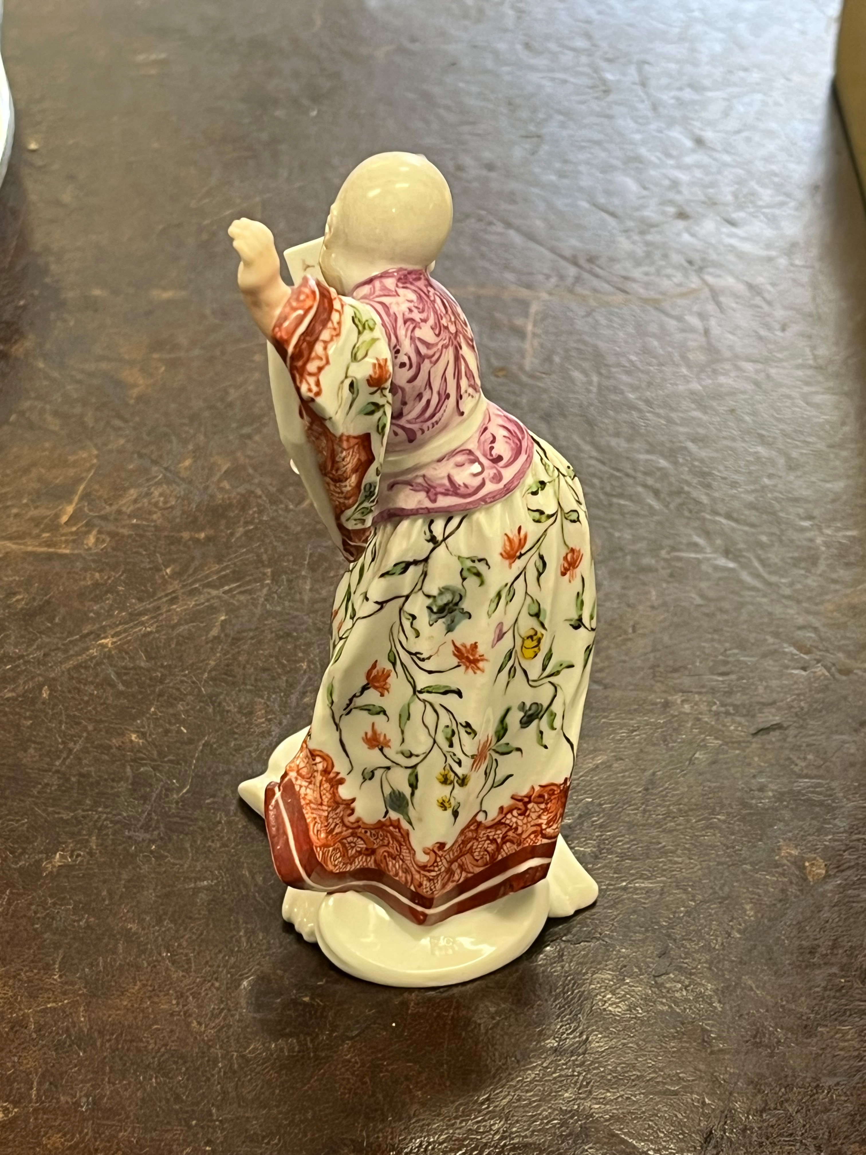 | Auf ovalem, unregelmäßigem Sockel mit aufbossierten Blüten und Blättern stehend. In den Händen das Instrument haltend. Porzellan, bunt bemalt, ohne Marke. Modell von Johann Joachim Kaendler. Vgl. S.-K. Andres-Acevedo, „Die autonomen figürlichen Plastiken“, Stuttgart 2023, S. 114, Nr. 288. (best. mit Rissen)
