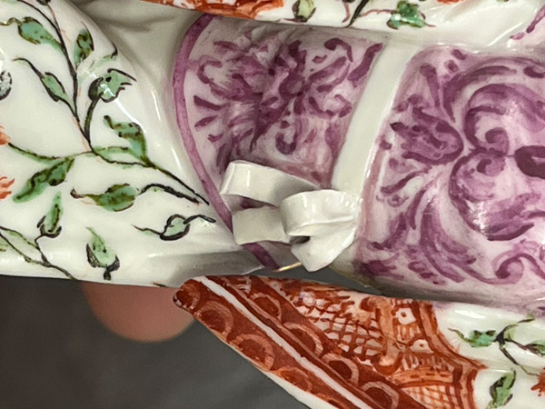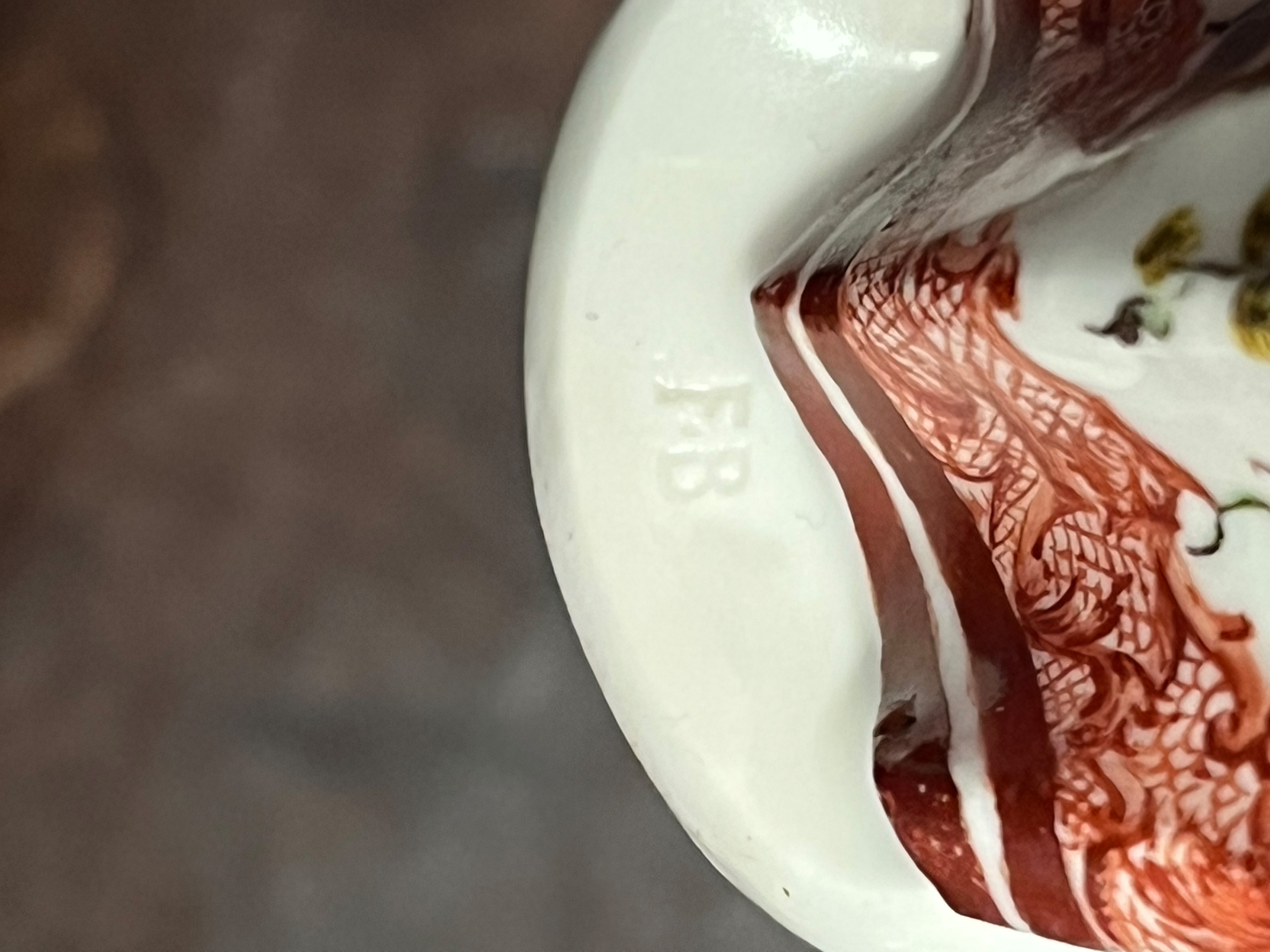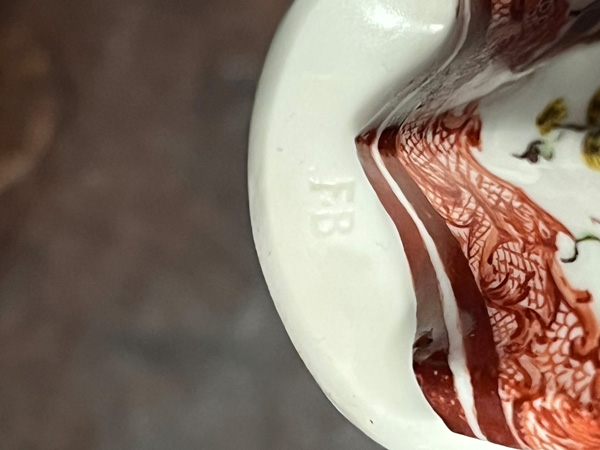 | Beide Teile mit breiter Goldspitzenbordüre. Schauseiten mit Goldspitzenkartuschen und Böttgerlüster, eisenrot gesäumt. Reserven bunt bemalt mit Chinoiserien. Weißes Böttgerporzellan, am Boden unterglasurblaue Schwertermarke, Goldziffer „51.“. Malerei von Johann Gregorius Hoeroldt. Vgl. R. Rückert 1966, Taf. 48ff., Nr. 153ff.