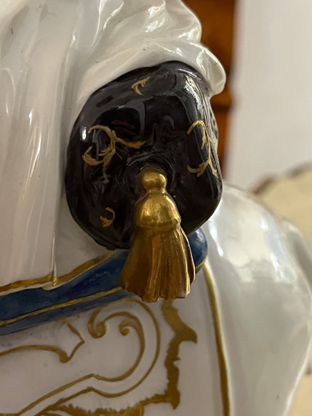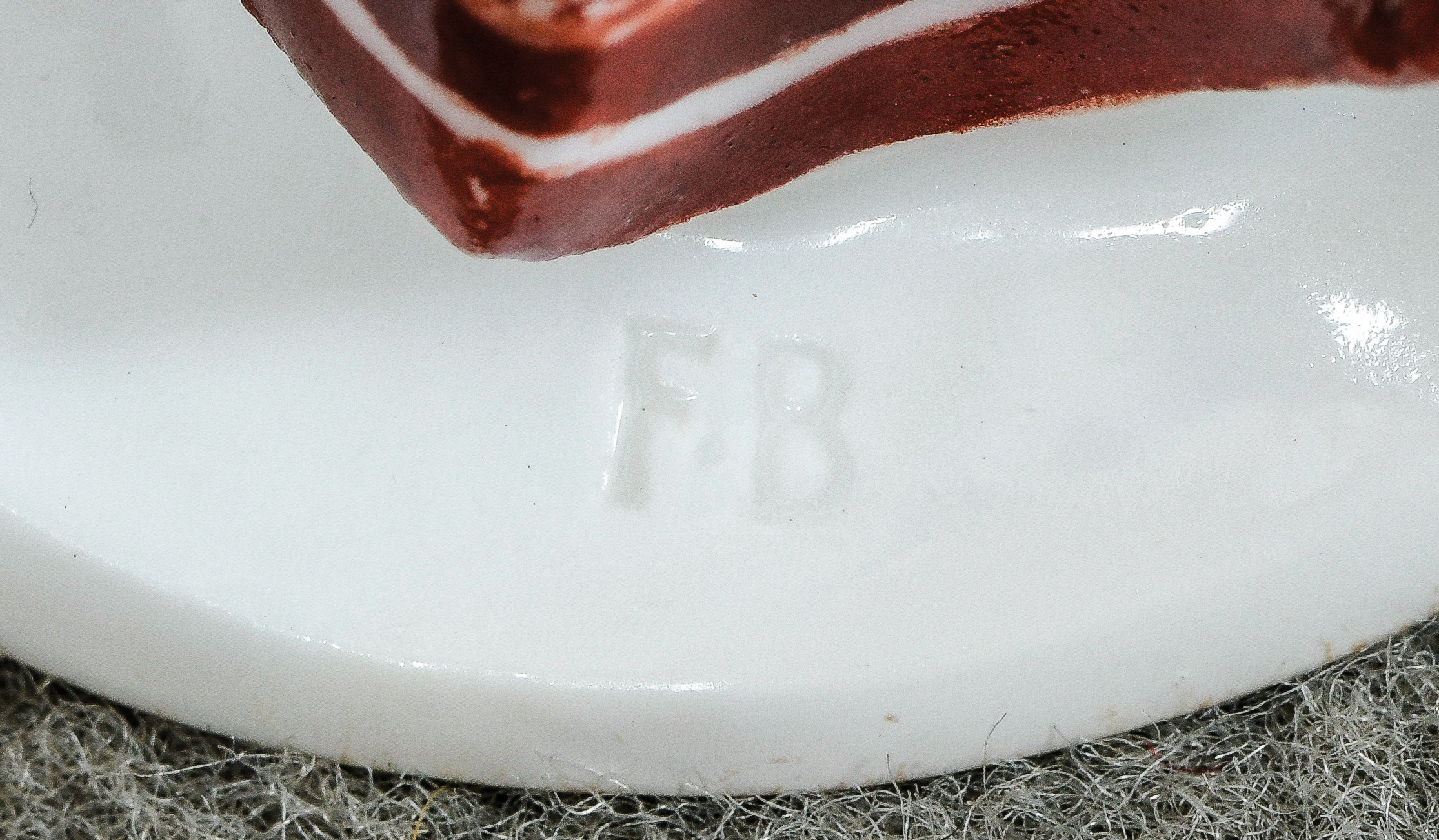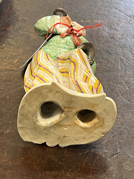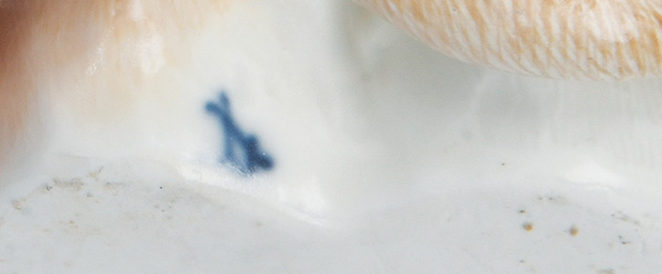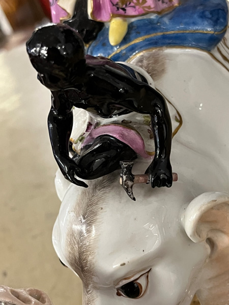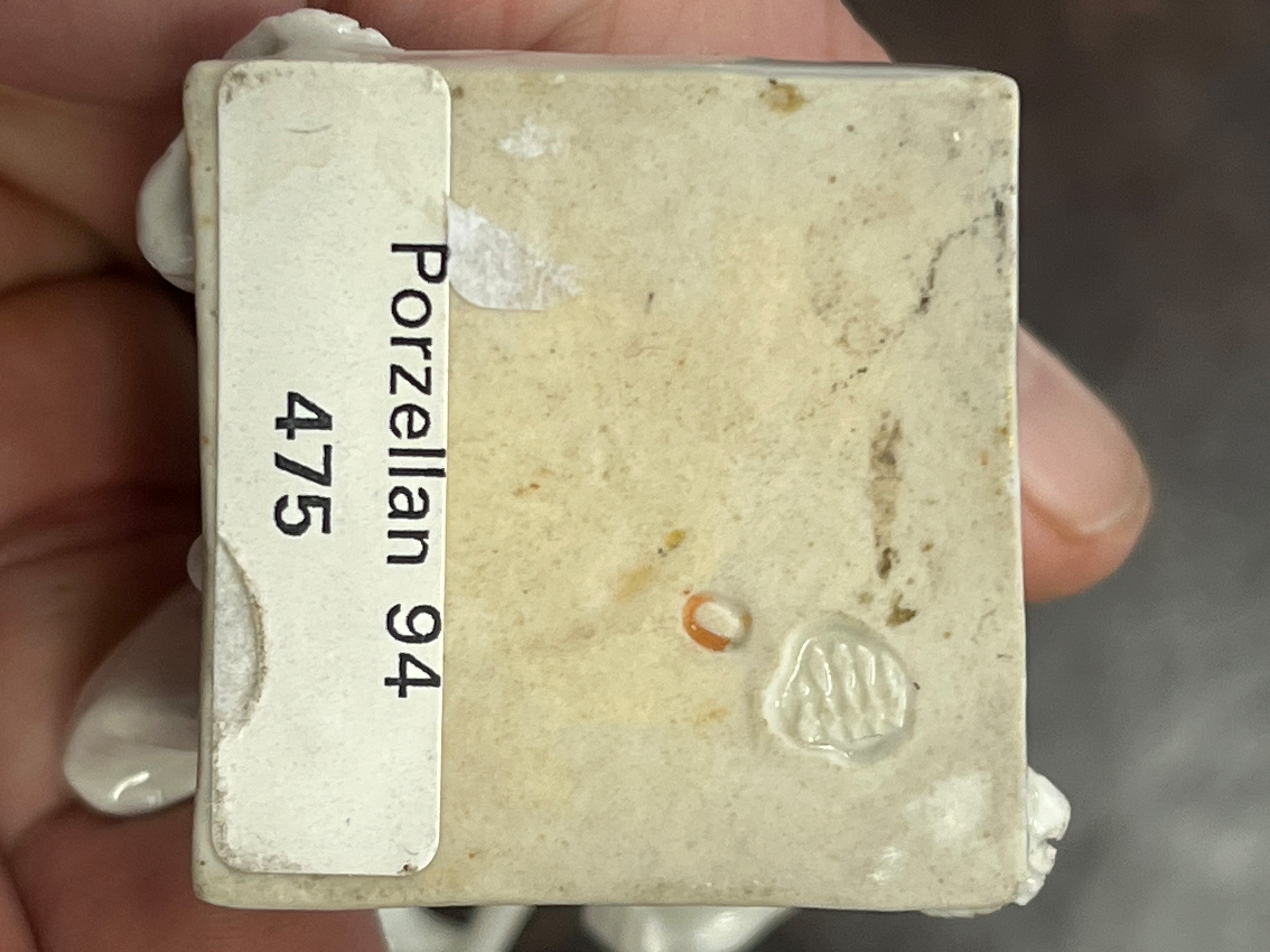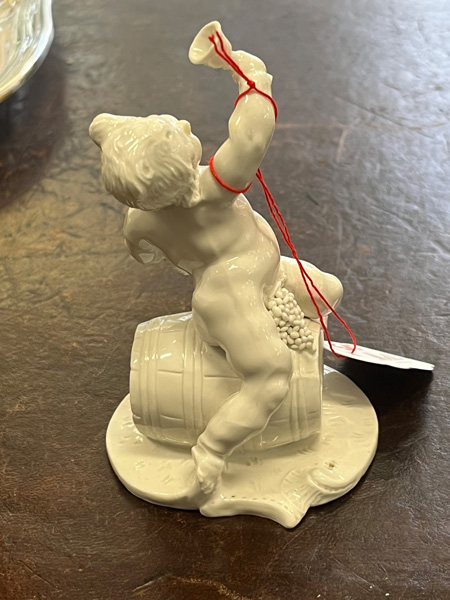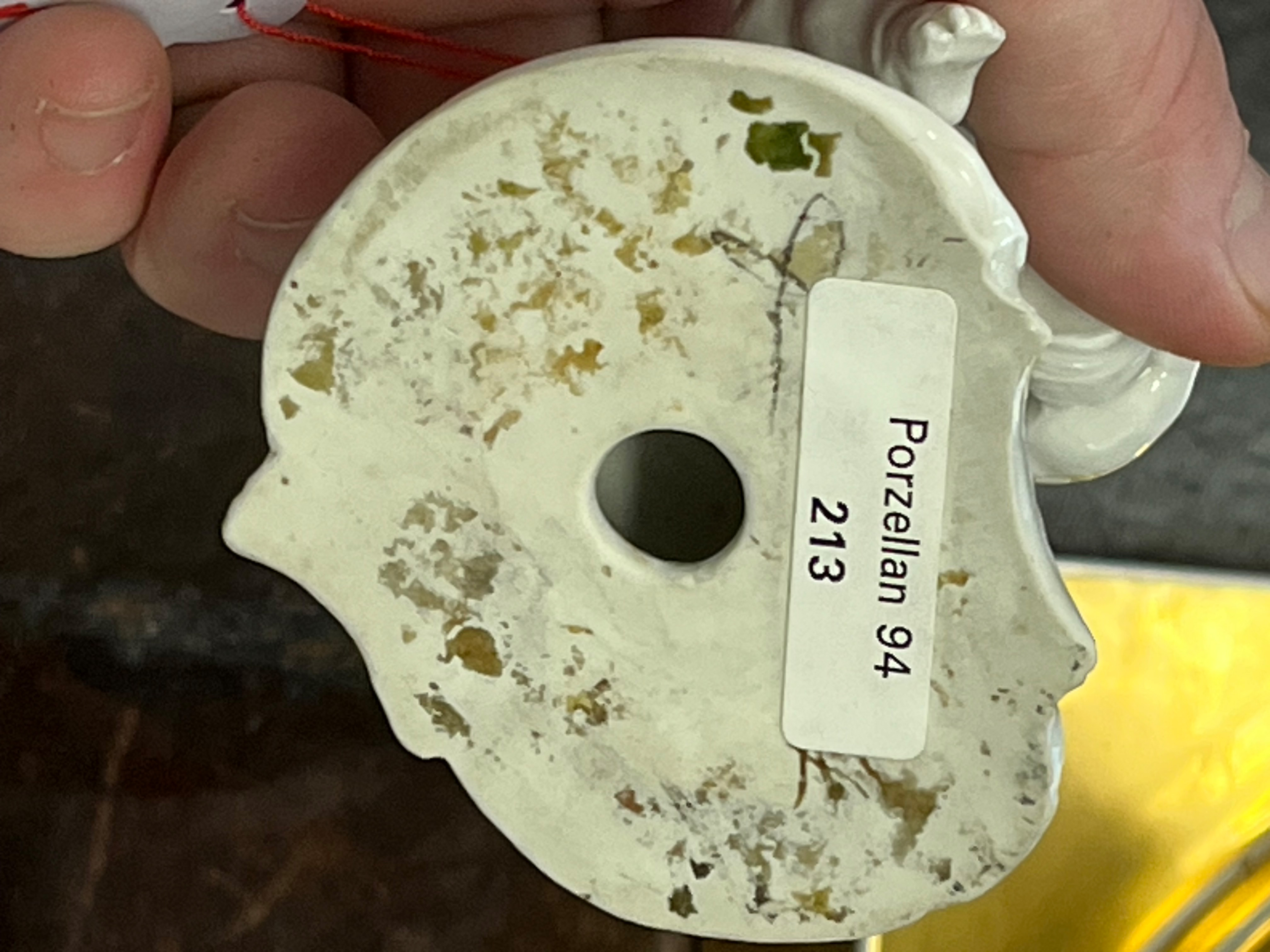 | Auf rundem, unregelmäßigem, kanneliertem Sockel stehend. Seitlich in der Hand eine Heugabel haltend. Porzellan, weiß glasiert, am Boden unterglasurblaue „HC“-Marke. Vgl. M. Wienert, Kasseler Porzellan, Nr. 95; S. Ducret, „Die landgräfliche Porzellansammlung Kassel“, Titelseite. (min. best.)