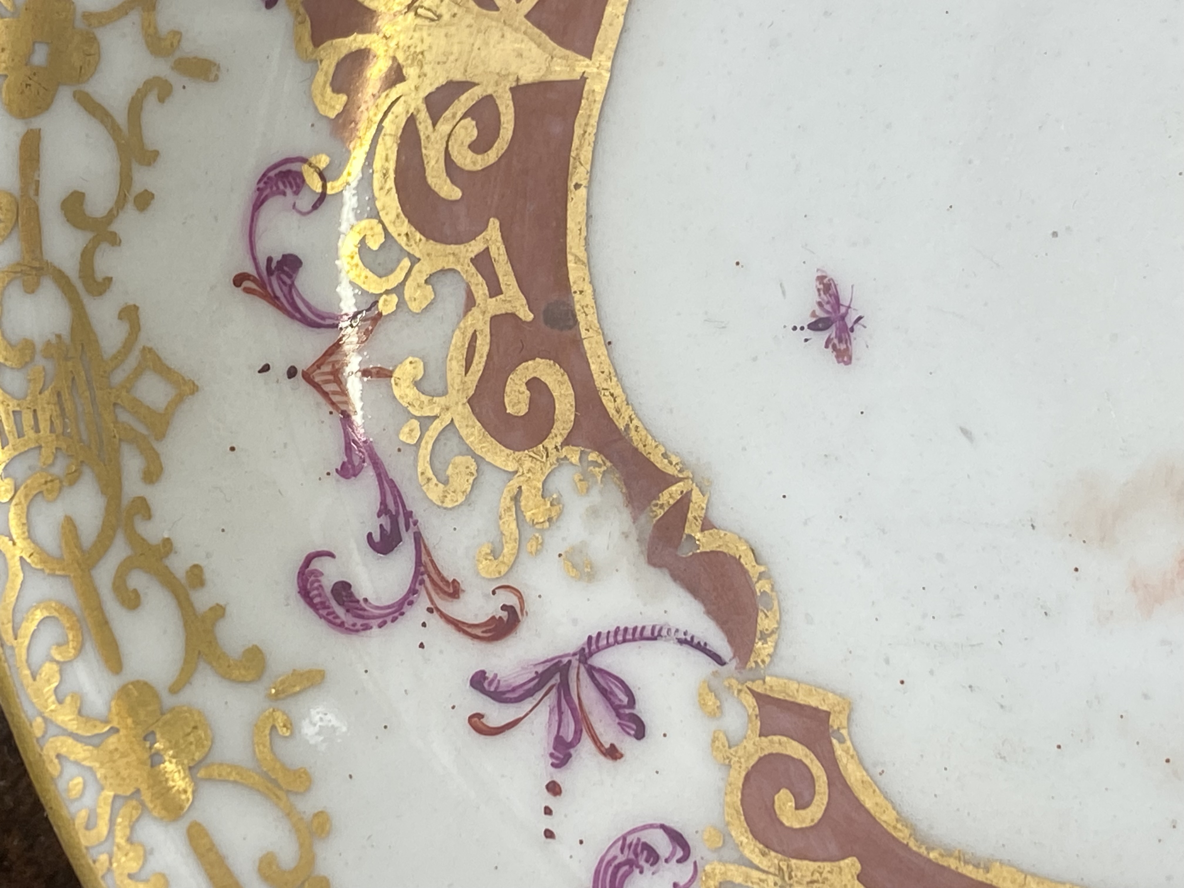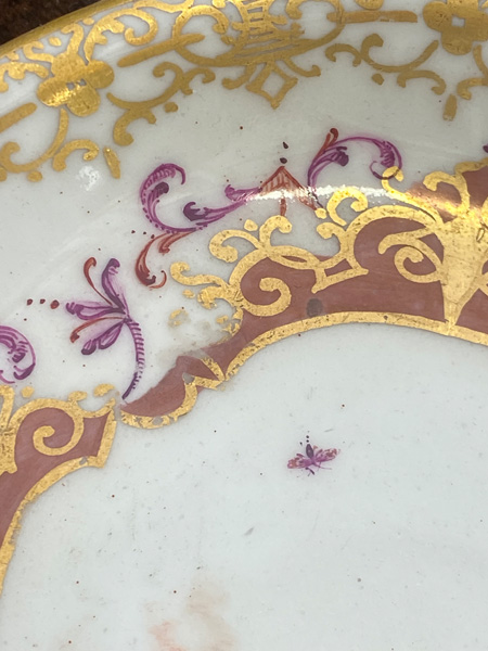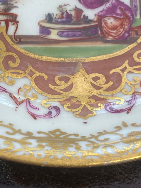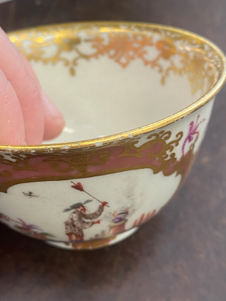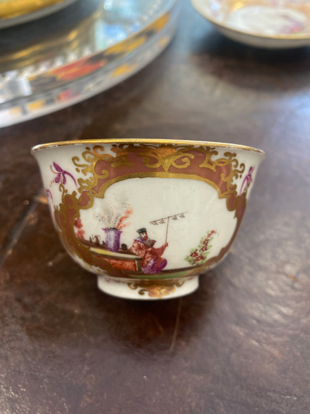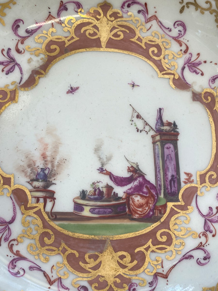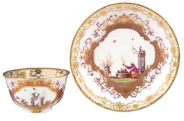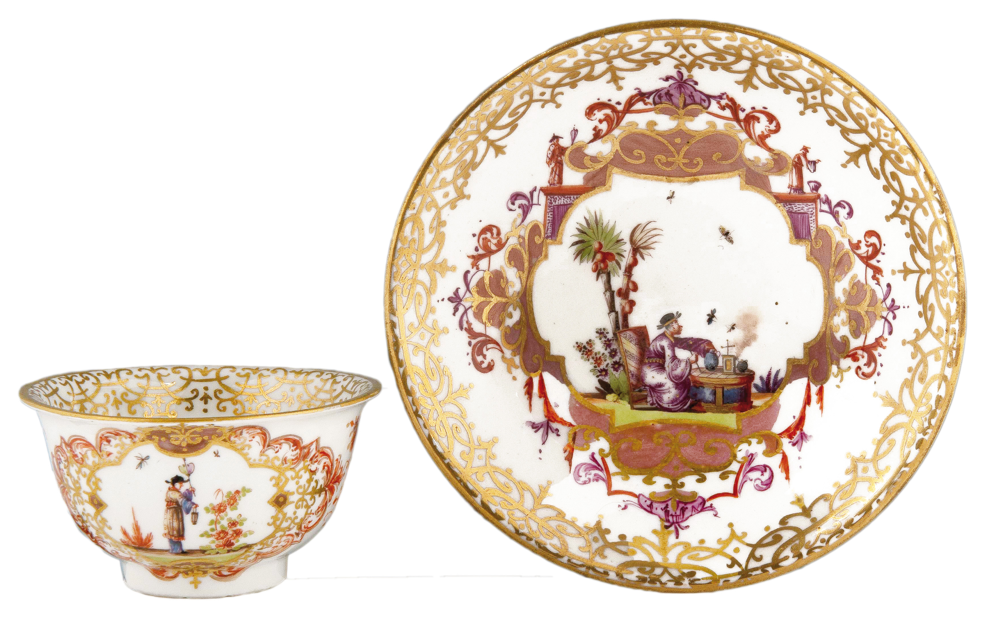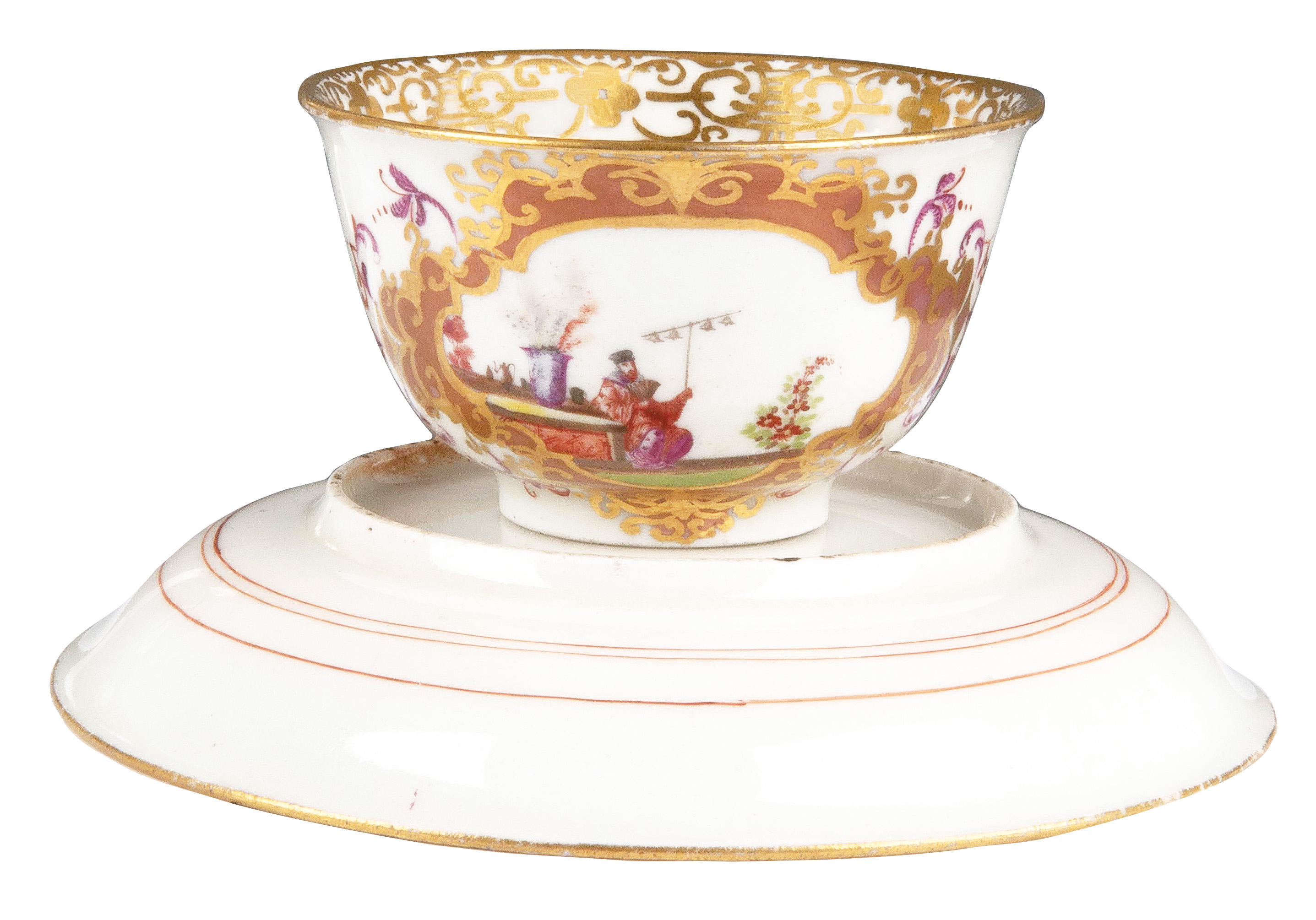 Beide Teile mit breiter Goldspitzenbordüre. Schauseiten mit Goldspitzenkartuschen und Böttgerlüster, eisenrot gesäumt. Reserven bunt bemalt mit Chinoiserien. Weißes Böttgerporzellan, ohne Marke, am Boden Goldziffer „80.“. Malerei von Johann Gregorius Hoeroldt. Vgl. R. Rückert 1966, Taf. 48ff., Nr. 153ff.