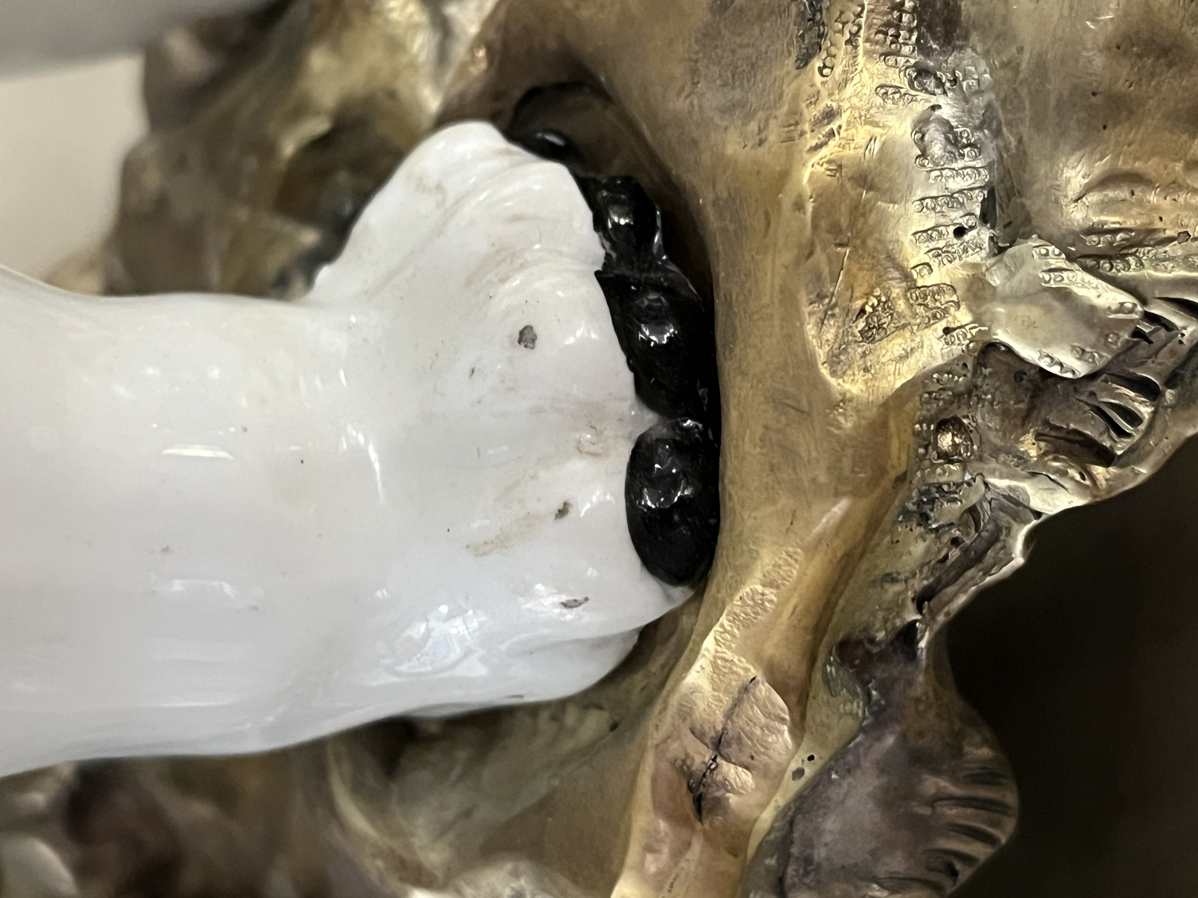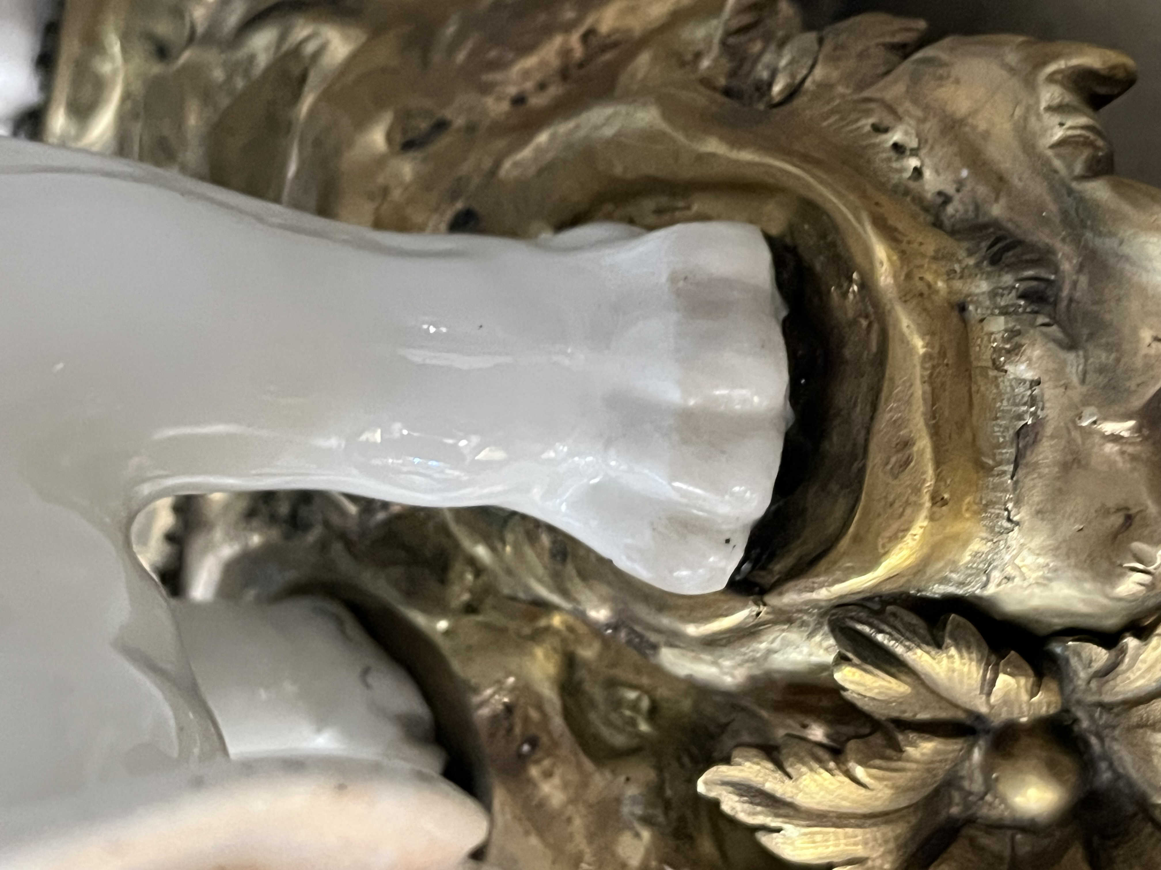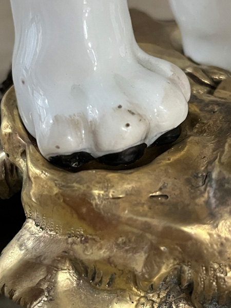 | Meisterhaft im Viernageltypus modelliert. Porzellan, weiß glasiert, ohne Marke. Modell wohl von J. P. Melchior. Im Auftrag gefertigt für denKurfürsten Friedrich Carl Joseph. Dazu neuzeitliche schwarz bezogene Halterung. Vgl. K. Röder / M. Oppenheim, „Das Höchster Porzellan“, Mainz 1925, Nr. 359.