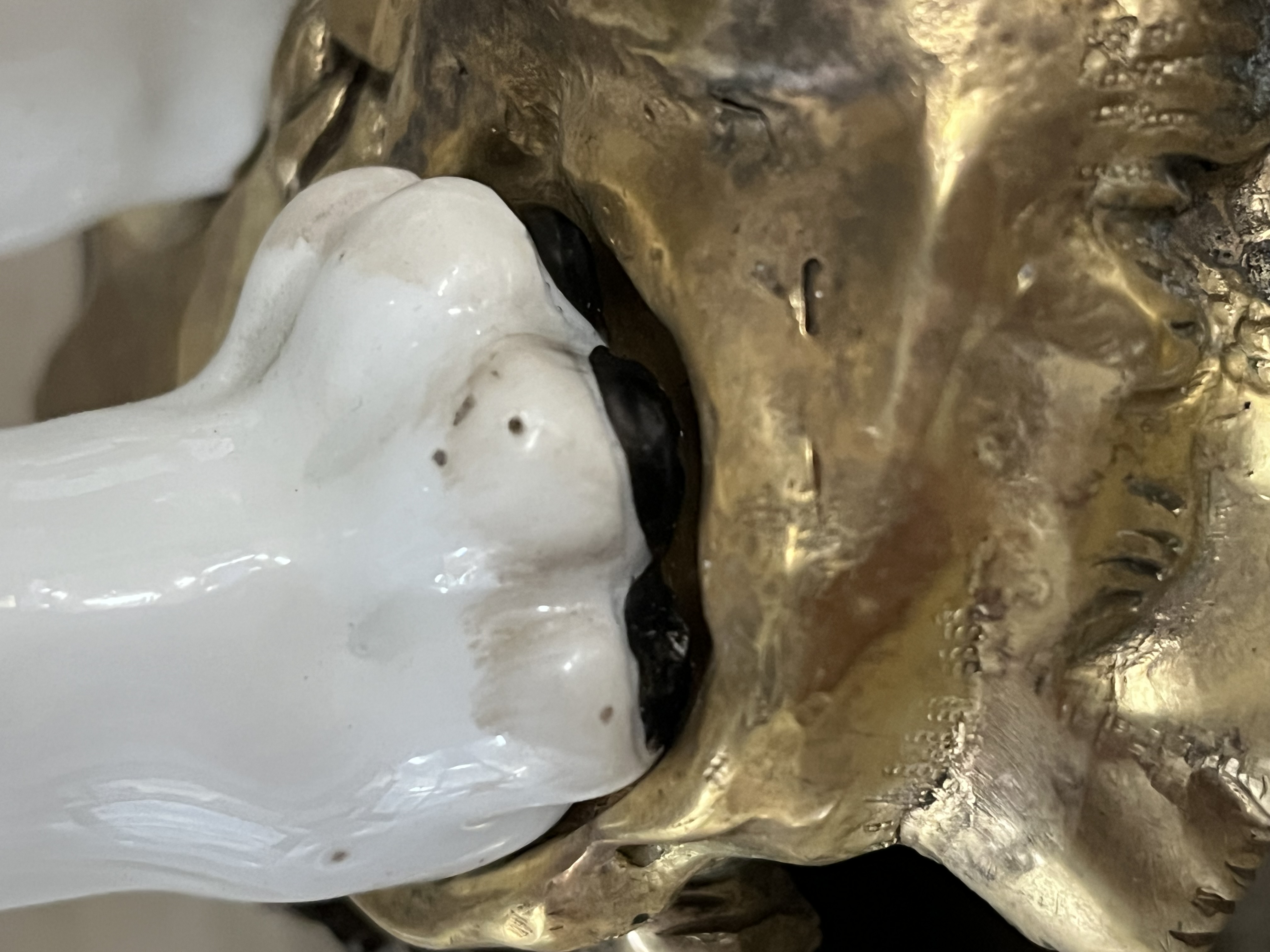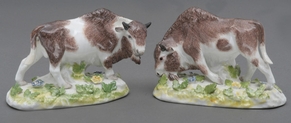 | Je auf ovalem, unregelmäßigem Sockel mit aufbossierten Blüten und Blättern stehend. Naturalistisch modelliert und bunt staffiert. Porzellan, am Boden unterglasurblaue Schwertermarke. Modelle von Johann Joachim Kaendler. Auszug aus der Taxa Kaendlers: „3. Einen bereits angefangenen Auer-Ochsen,auf der Flucht vorgestellet, in Thon vollends verfertigt“. Vgl. S.-K. Andres-Acevedo, „Die autonomen figürlichen Plastiken“, Stuttgart 2023, S. 225, Nr. 658. (nicht sichtbar, unwesentlich best.)