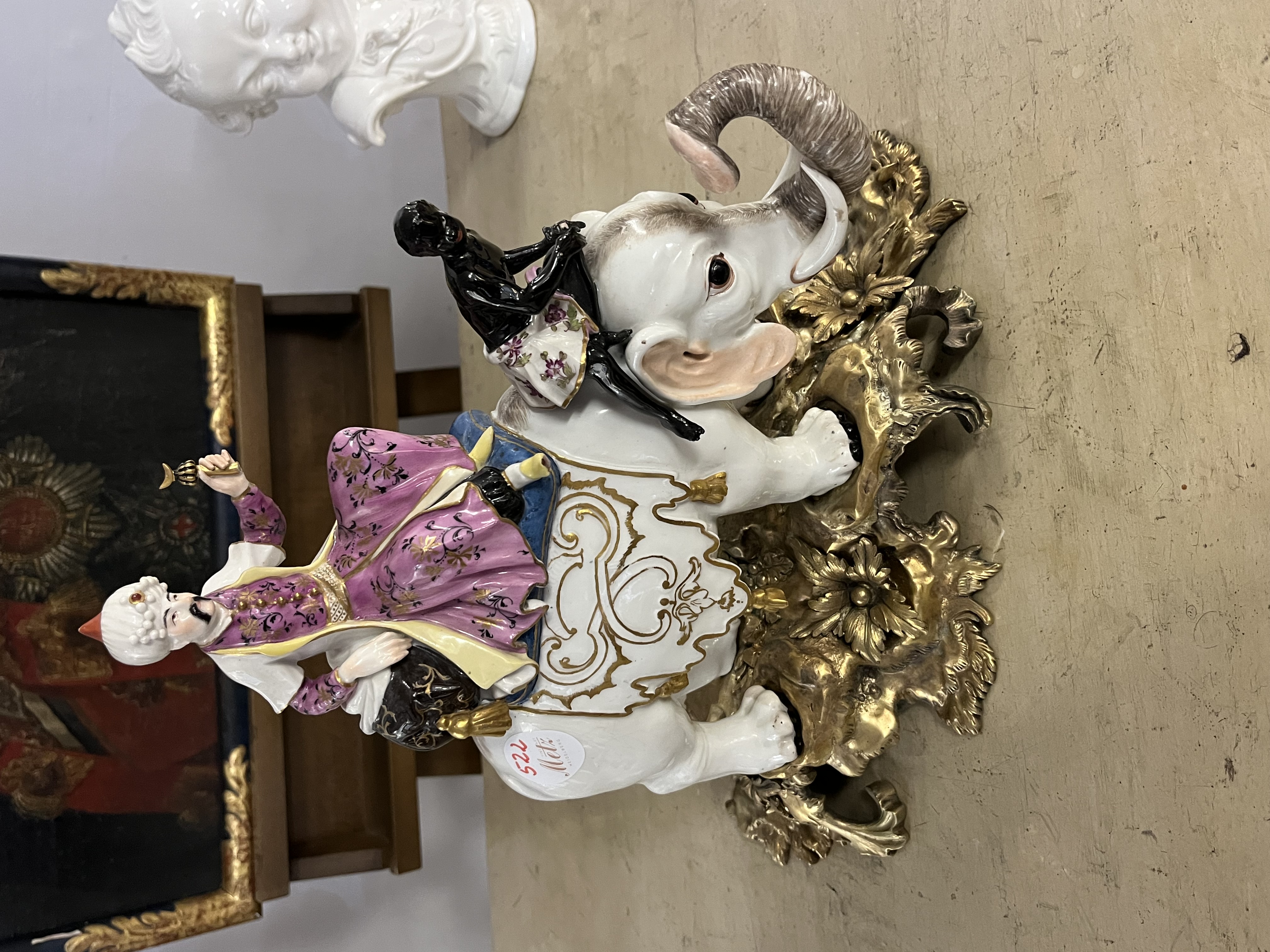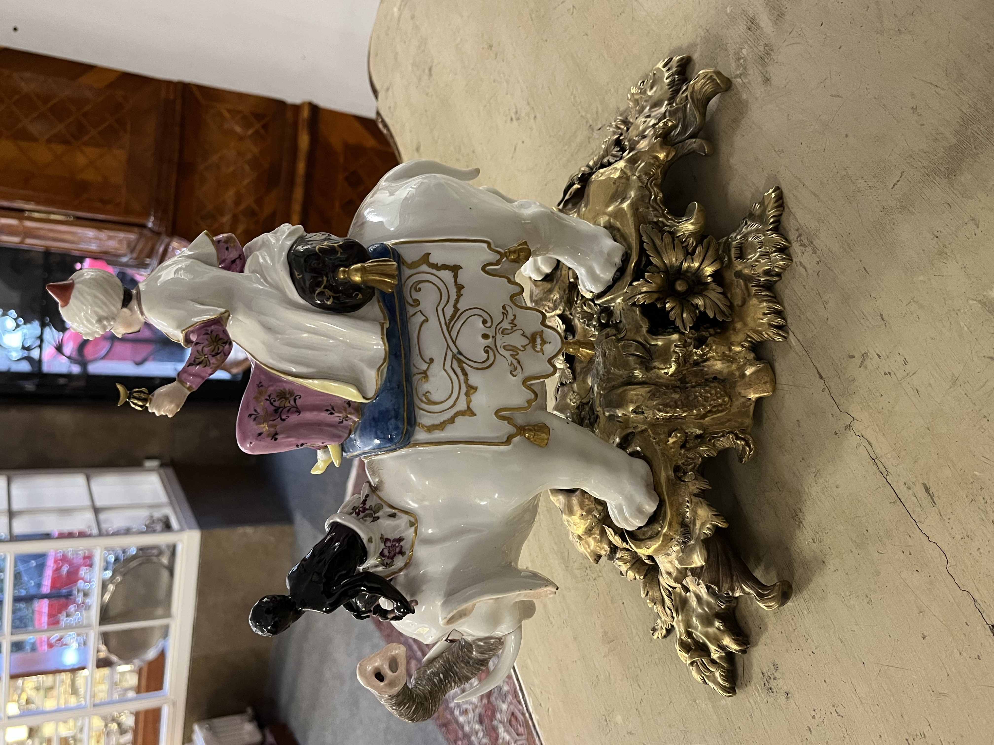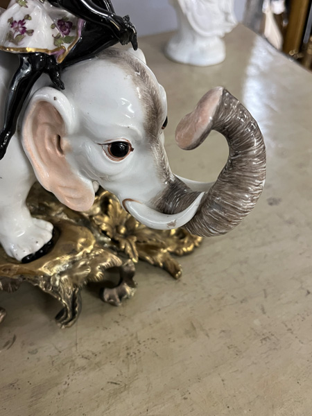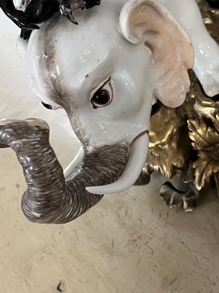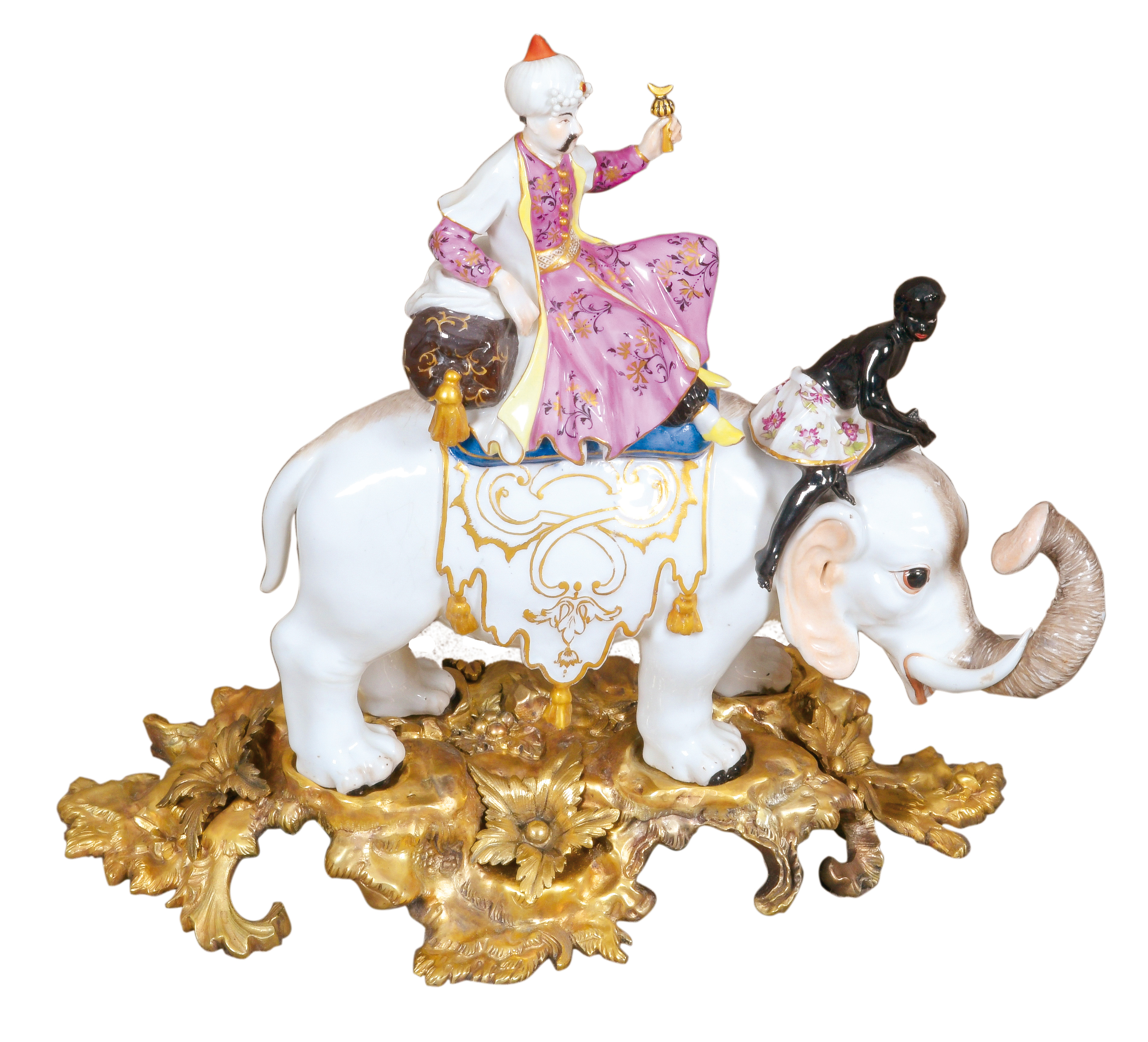 | Naturalistisch modellierter Elefant mit erhobenem Rüssel. Auf seinem Rücken thronender Sultan in Sänfte, gestützt auf Rollkissen und in der Hand ein Zepter haltend. Im Genick reitend der Elefantenführer als Afrikaner in ein Lendentuch gehüllt. Bunt bemalt, teilweise mit indianischem Floraldekor, Ränder gold gesäumt. Porzellan, am Boden unterglasurblaue Schwertermarke. Modell von Johann Joachim Kaendler und Peter Reinicke. Auf feuervergoldeten und mit Blättern und Blüten geschmücktem Bronzesockel. Provenienz: Kunsthandel Gerhard Röbbig, München 1999, für DM 120.000,00. Vgl. R. Rückert 1966, Taf. 263, Nr. 1061.