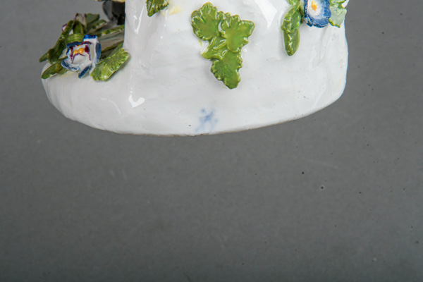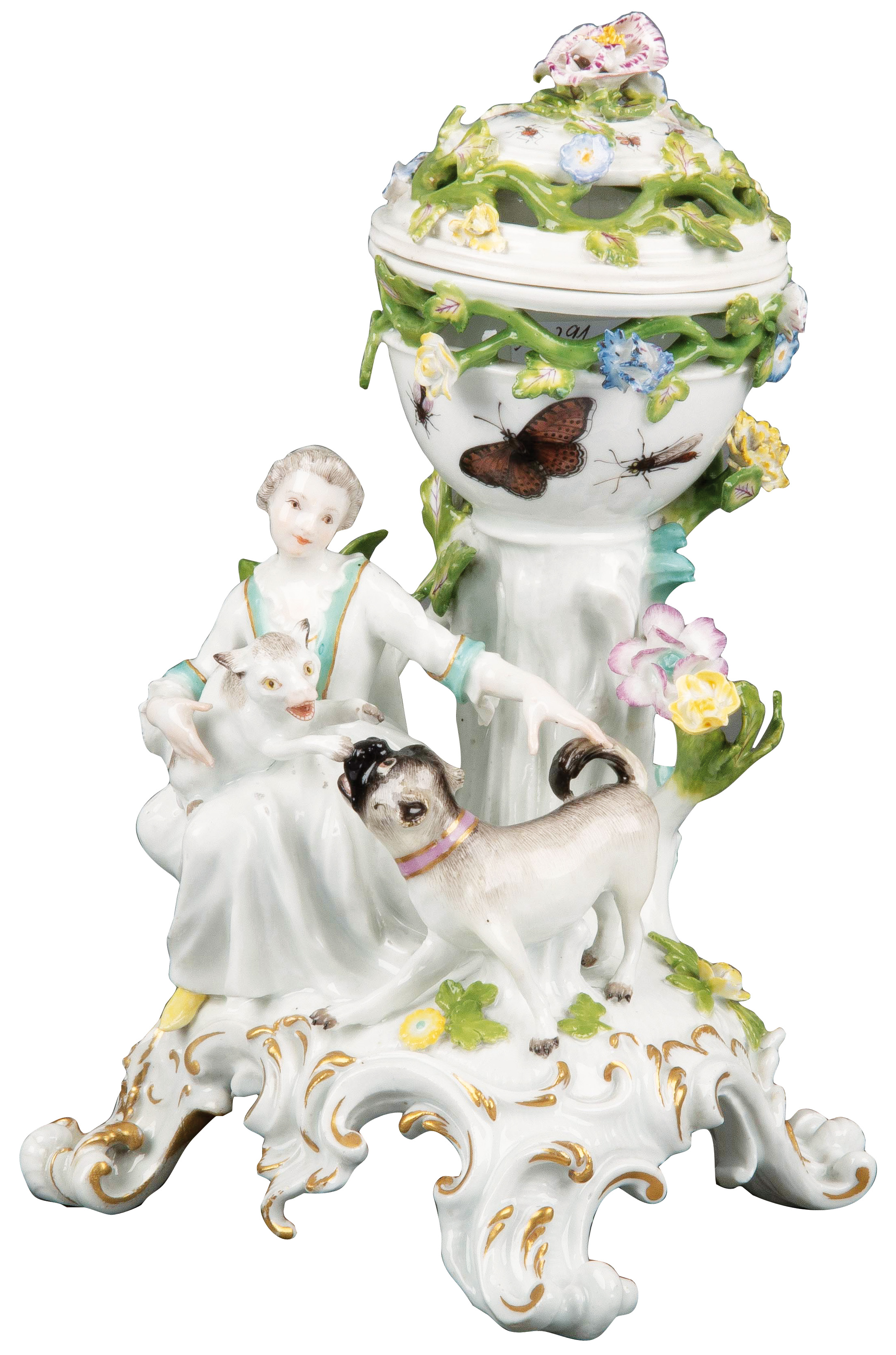 | Vierpassiger, rocaillereliefierter Sockel. Darauf sitzend eine Dame mit Katze. Seitlich ein die Zähne fletschender Mops. Im Hintergrund ein Baumstumpf mit durchbrochenem Deckelgefäß. Teilw. bunt bemalt mit Insekten, gold gesäumt. Porzellan, am Boden unterglasurblaue Schwertermarke, Pressziffer „34“. Modell von Johann Joachim Kaendler und Peter Reinicke. (min., nicht sichtbar rest.)