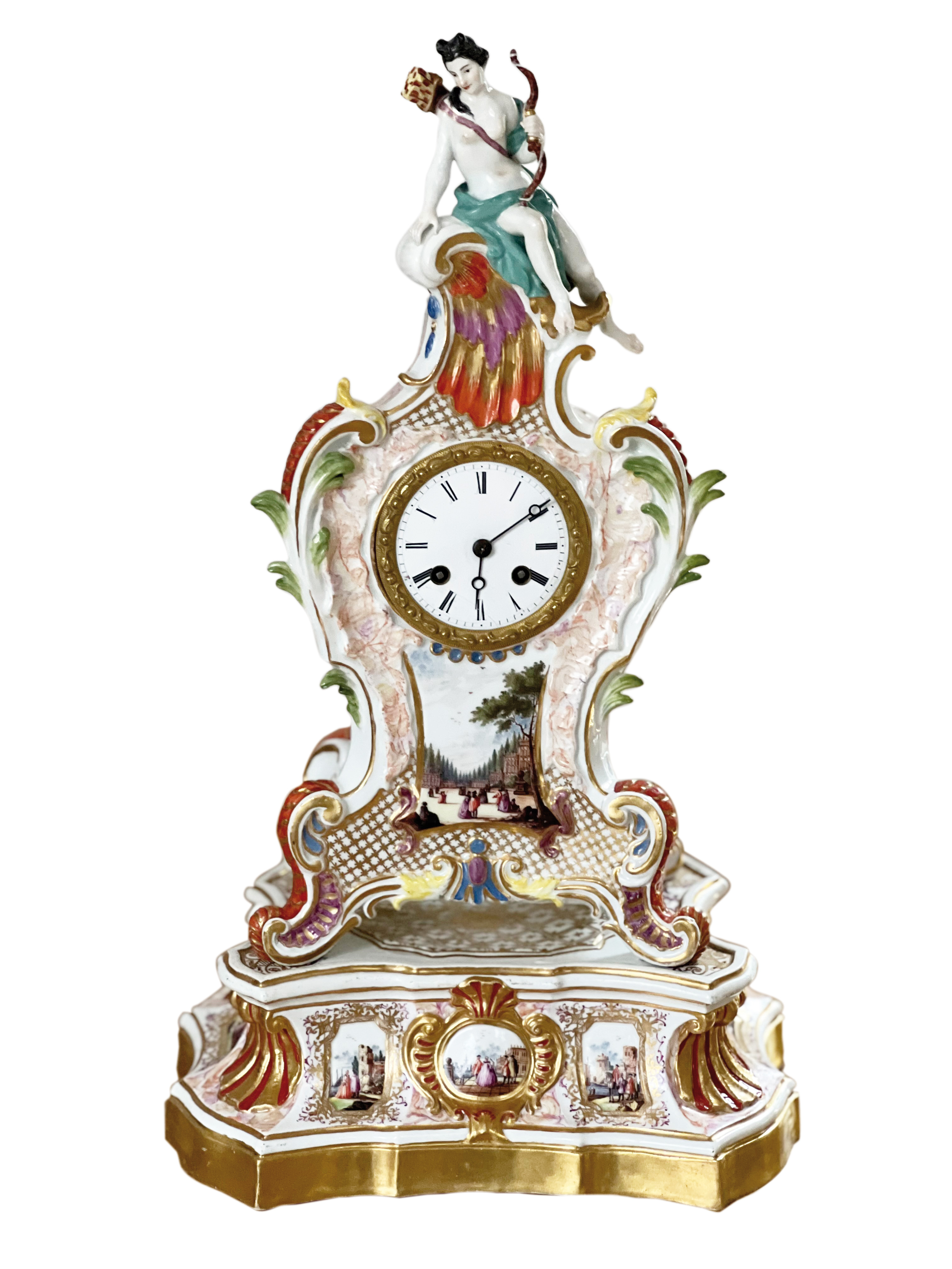 | Rechteckiger, erhöhter Sockel, sich nach oben verjüngend. Abgeschrägte Ecken mit gebogtem Muschelrelief. Darauf das geschweifte, rocaillereliefierte und auf Volutenfüßen stehende Uhrengehäuse mit muschelförmig modelliertem Giebel. Dieser bekrönt von sitzender Diana mit Bogen und gefülltem Köcher. Dreiseitig exzellent bunt bemalt mit Architekturen, Personenstaffagen und Baumallee. Ränder und Reliefkartuschen gold und purpurn gesäumt. Porzellan, am Boden unterglasurblaue Schwertermarke. Modell von Johann Joachim Kaendler. Rundes Uhrwerk mit Emailzifferblatt und doppeltem Schlüsselaufzug. (Funktion ungeprüft)