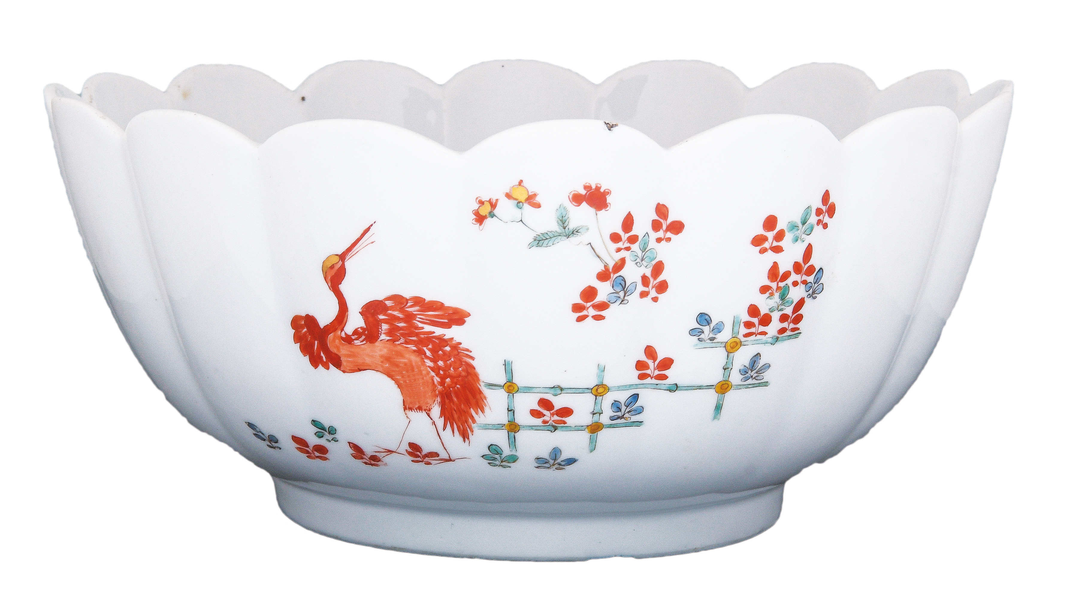 | Walzenförmig, sich nach unten verjüngend, auf eingeschnürtem Standring. Umlaufend mit gefächerter, gewellter Wandung und Lippenrand. Schauseiten bunt bemalt mit Kranichen und Kakiemonblütenzweigen, teilw. gold überdekoriert. Porzellan, am Boden unterglasurblaue Schwertermarke. Vgl. R. Rückert 1966, Taf. 75, Nr. 294 (Dekor) und Taf. 105, Nr. 415 (Form). (min.best.)
