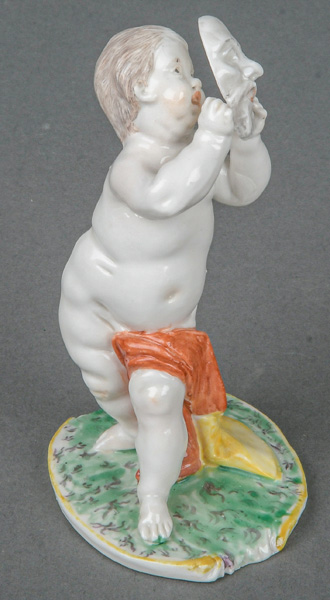 | Stehend auf quadratischem, unregelmäßigem Sockel. In den Händen einen mit Pilzen gefüllten Topf haltend. Porzellan, bunt bemalt, ohne Marke. Modell von Johann Joachim Kaendler.