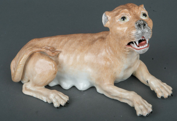 | Liegend, naturalistisch modelliert und staffiert. Porzellan, verso unterglasurblaue Schwertermarke. Modell von Johann Joachim Kaendler. Taxa: „1 Löwe, mittelmässiger Grösse, liegend mit offenem Rachen, vor Ihro Königl. Maj.“. Vgl. C. Albiker, „Die Meissner Porzellantiere im 18. Jahrhundert“, Berlin 1959, Nr. 159.