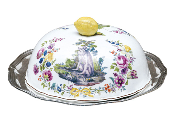 | Große halbkugelförmige Glocke mit wulstigem, gewelltem, kapuzinerbraun staffiertem Lippenrand und naturalistisch modellierter Zitrone als Knauf. Beidseitig bunt bemalt mit Hund bzw. Affe in Landschaft, umrahmt von Blumengirlanden mit Schlupfwerk. Porzellan, ohne Marke. August III. schenkte dem englischen Gesandten am Dresdener Hof, Sir Charles Hambury-Williams, das Service mit dieser Wärmeglocke im Jahr 1747. Vermutlich ist sie das einzige nachweisbare Formteil aus diesem Service. Insgesamt sind nur 44 Serviceteile überliefert, die in Alnwick Castle aufgewahrt werden. Weitere fünf Teile befinden sich in Museen. (nicht sichtbar rest.)