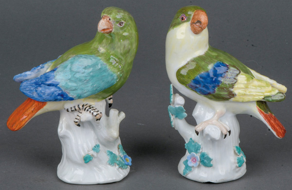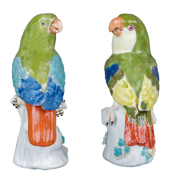 | Je sitzend auf Baumstamm, reliefiert mit Blüten und Blättern. Naturalistisch modelliert und staffiert. Porzellan, am Boden unterglasurblaue Schwertermarke. Modelle von Johann Joachim Kaendler. Auszug aus der Taxa Kaendlers: „Einen Neuen Pappagoy mittlerer Sorte in Thon poussiret welcher gegen den schon im Waaren Laager befindl. Pappagoy siehet“. Vg. S.-K. Andres-Acevedo, „Die autonomen figürlichen Plastiken“, Stuttgart 2023, S. 121, Nr. 310.