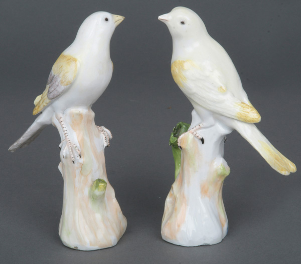 | Je sitzend auf Baumstamm mit reliefiertem Blattdekor. Naturalistisch modelliert und staffiert. Porzellan, am Boden unterglasurblaue Schwertermarke. Modelle von Johann Joachim Kaendler. Auszug aus der Taxa Kaendlers: „1. Vor Ihro Majs. die Königin ... einen Canarien-Vogel nach dem gemahlten in Thon bossirt“. S.-K. Andres-Acevedo, „Die autonomen figürlichen Plastiken“, Stuttgart 2023, S. 200, Nr. 571. (best.)