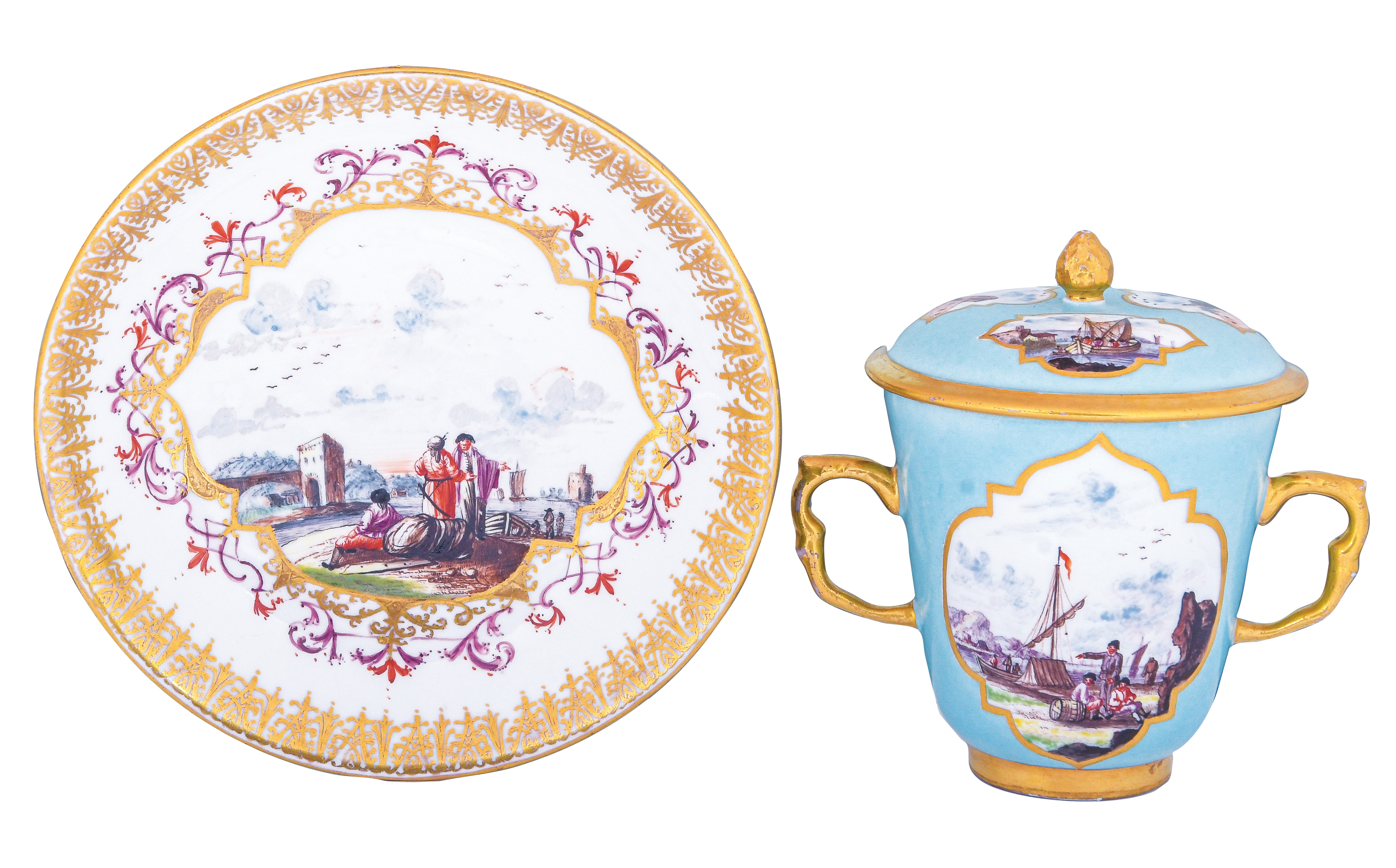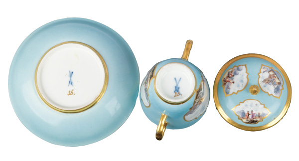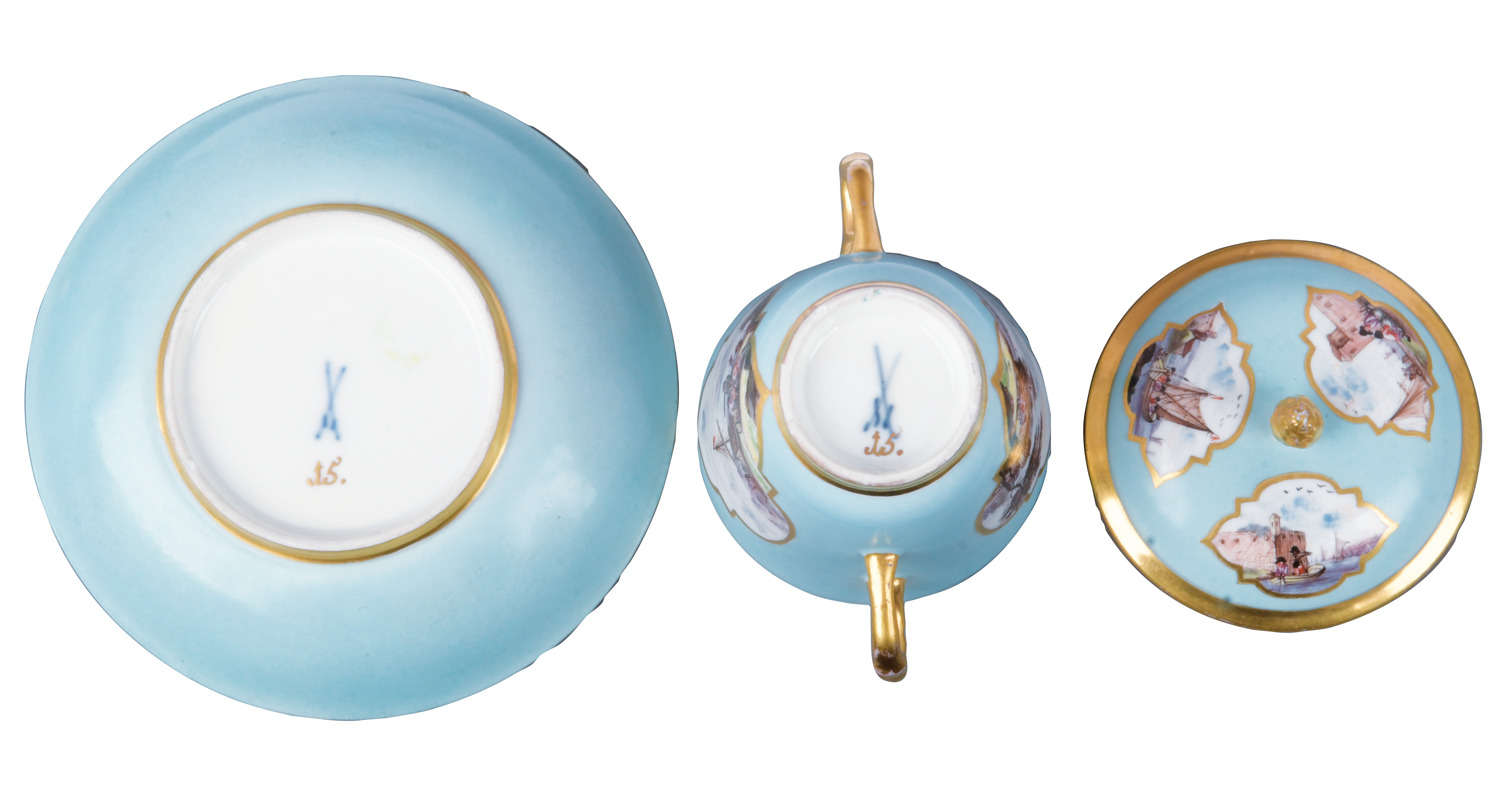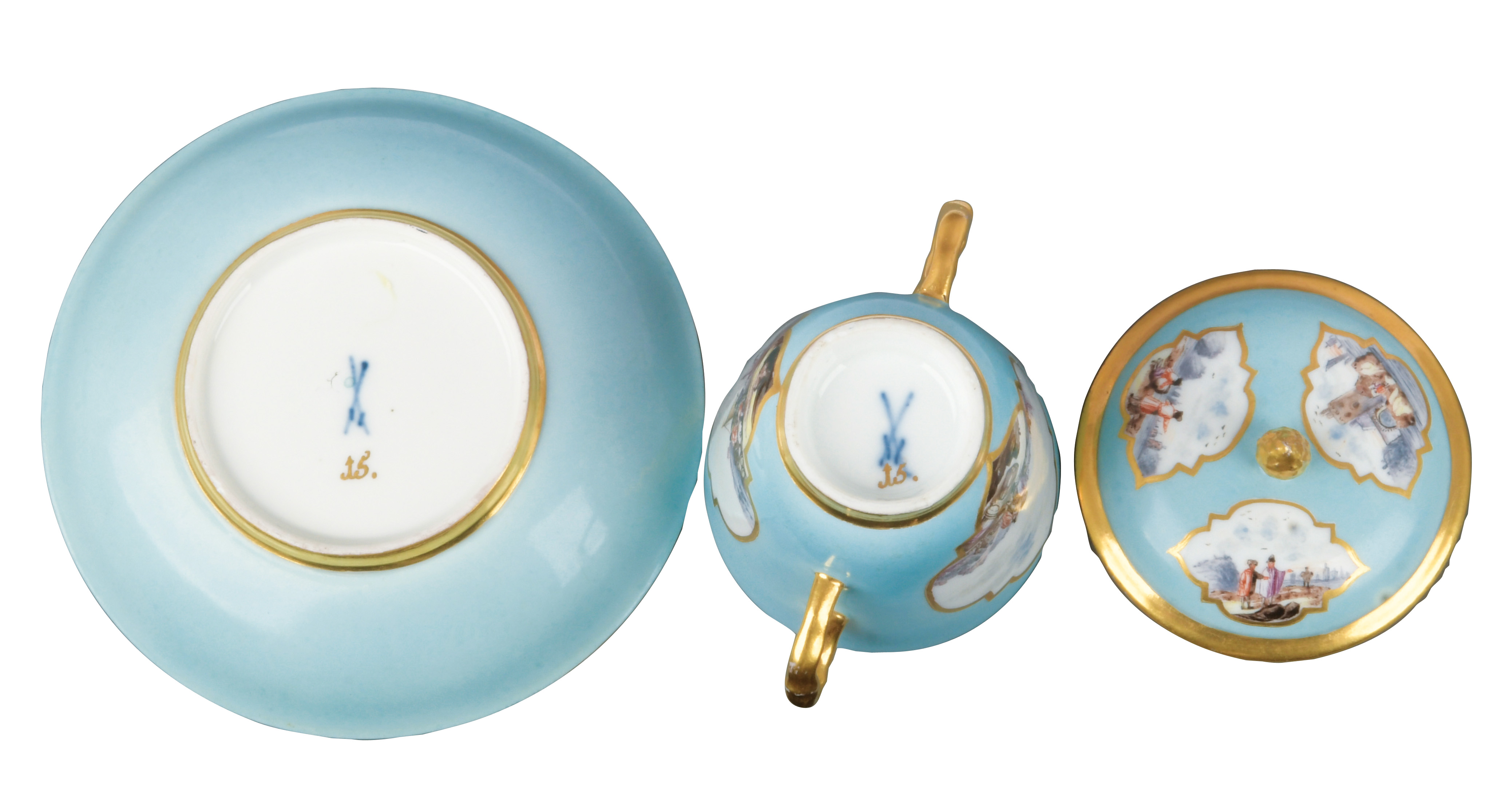 Alle Teile mit türkisfarbenem Fond, Goldrändern und Goldkartuschen. Reserven bunt bemalt mit Uferlandschaften, Figurenstaffagen und Segelbooten. Porzellan, am Boden unterglasurblaue Schwertermarke mit Goldziffer „15.“. Malerei Umkreis Christian Friedrich Herold. Vgl. R. Rückert 1966, Taf. 109, Nr. 421 (Dekor).