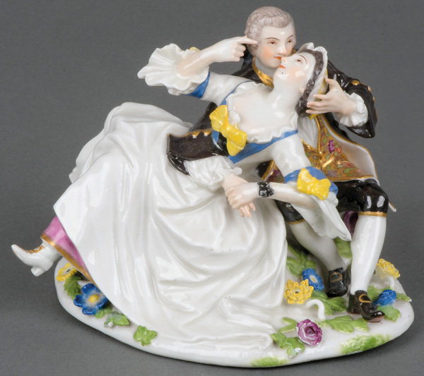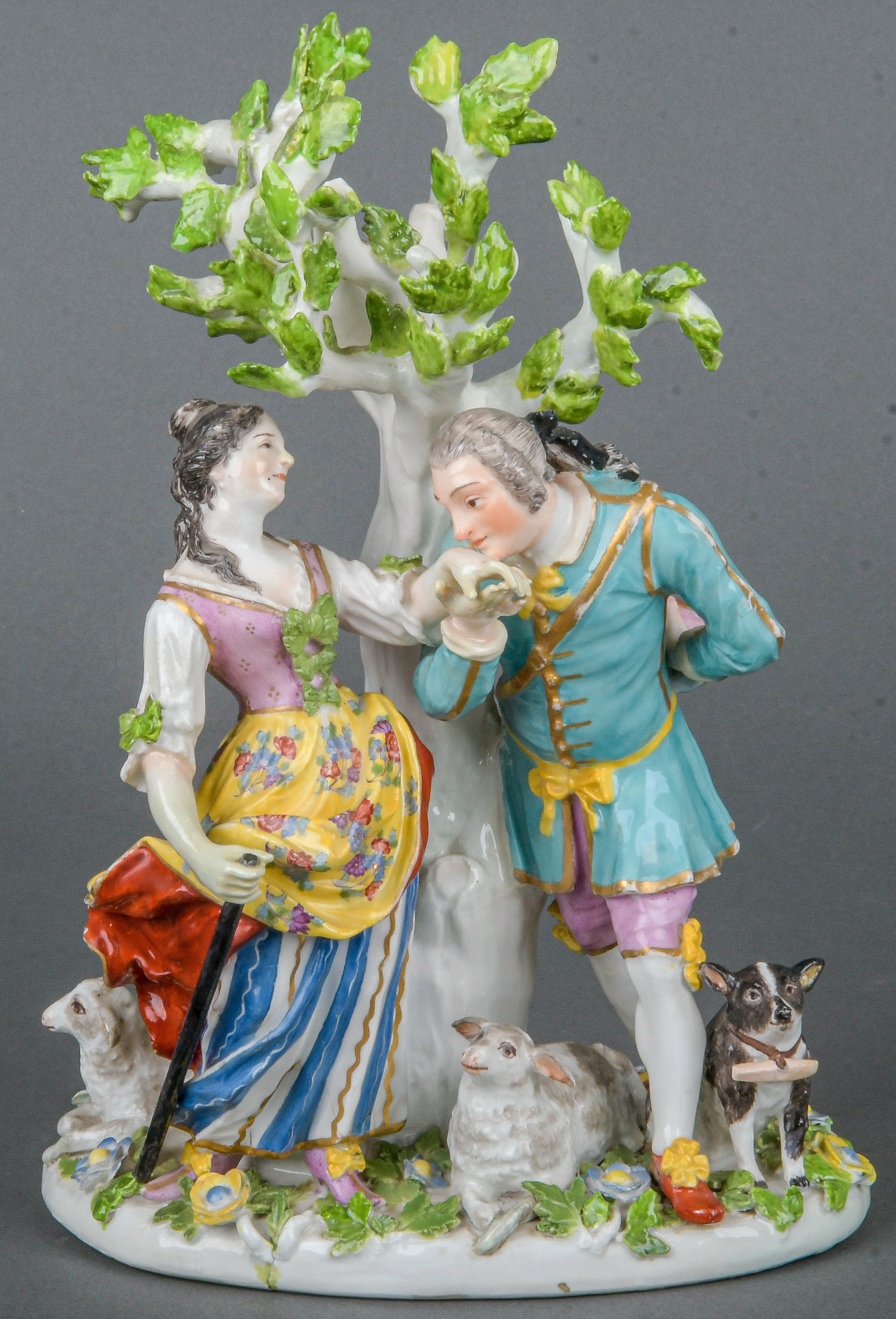 | Kavalier und Schäferin, auf ovalem Sockel mit üppigem Blatt- und Blütenreliefdekor stehend. Seitlich zwei Schafe und ein Hund, im Hintergrund ein aufragender Baum. Bunt bemalt, teilw. mit indianischem Floraldekor. Porzellan, ohne Marke. Modell von Johann Joachim Kaendler und Peter Reinicke. Vgl. M. Kunze-Köllesperger, „Slg. F. Burda“, Augsburg 1997, Taf. 161, Nr. 90. (rest.)