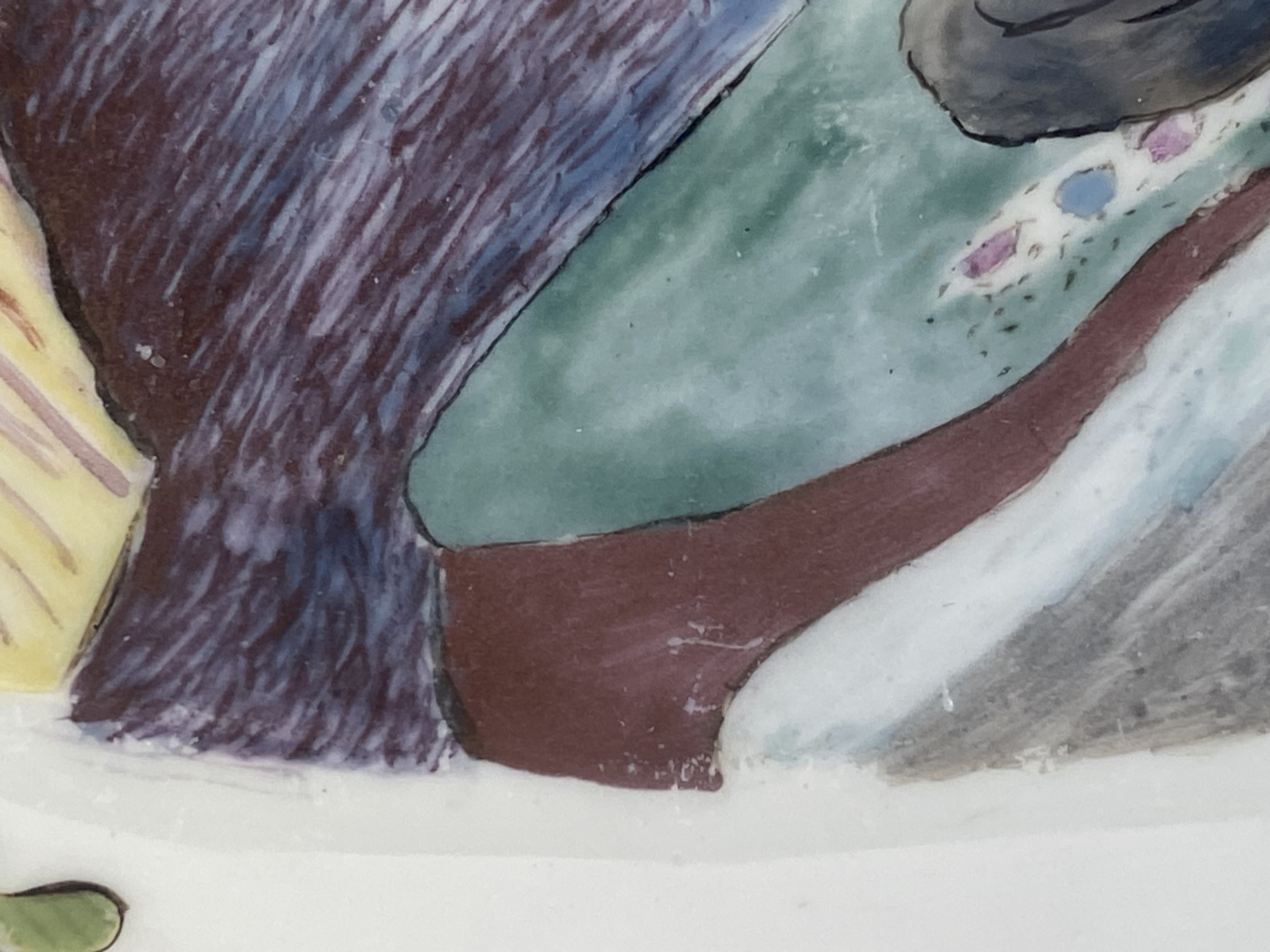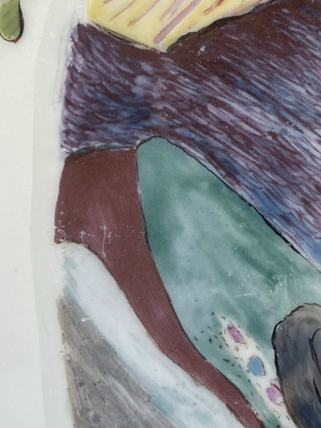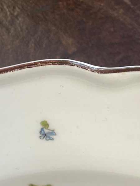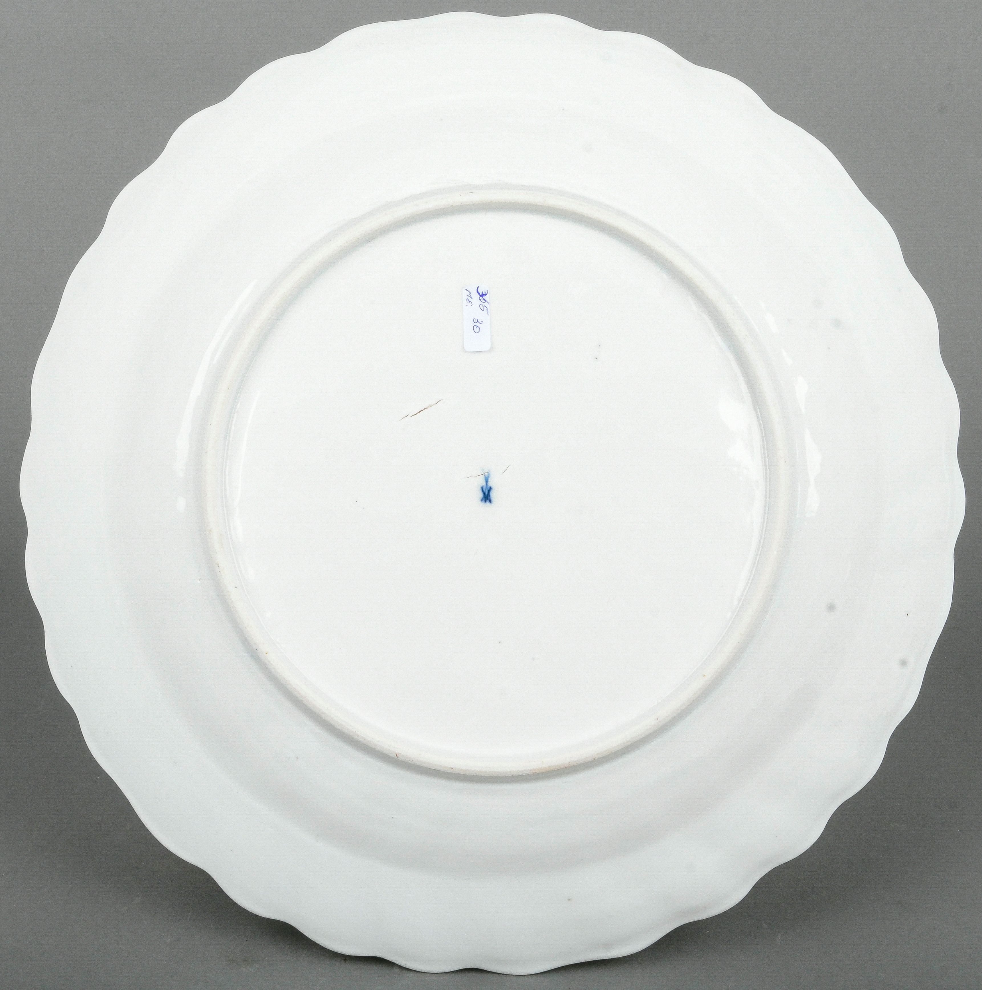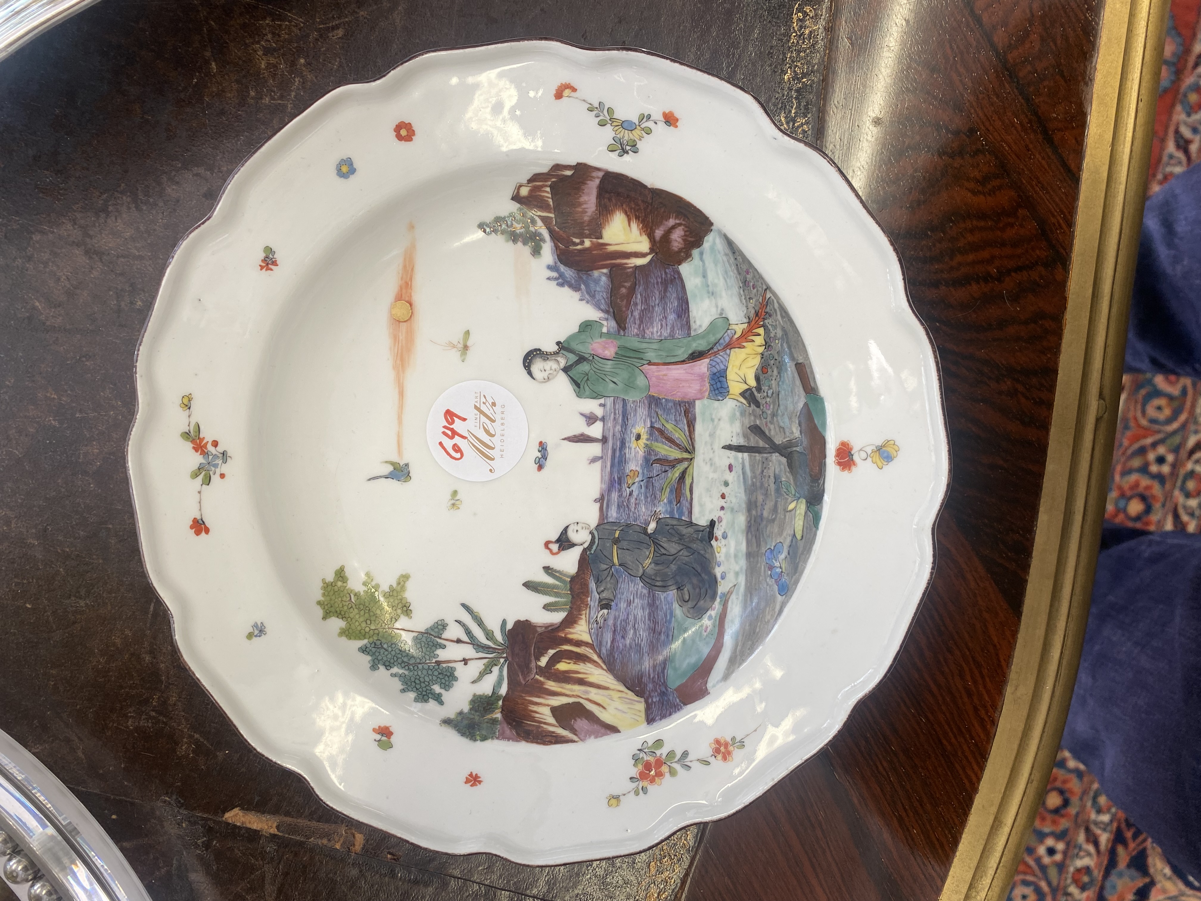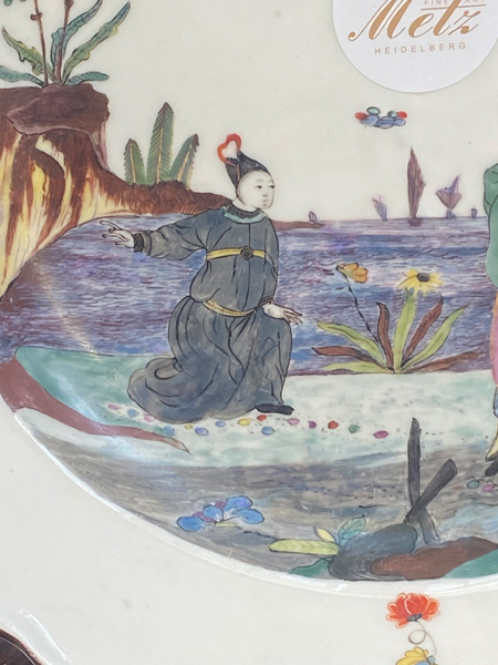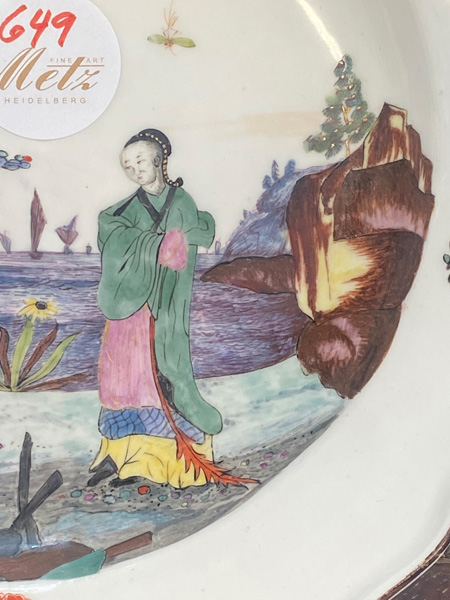 | Rund gemuldet. Steigende Fahne mit umlaufend gewelltem, wulstigem, kapuzinerbraun staffiertem Lippenrand. Spiegel fein bunt bemalt mit Chinoiserie in Uferlandschaft, umgeben von Streublumen. Porzellan, verso unterglasurblaue Schwertermarke, Pressziffer „16“. Malerei in der Art von Adam Friedrich von Löwenfinck. (nicht sichtbar rest.) Erworben: Sotheby's, London 24. Nov. 1998, Nr. 65. Vgl. Slg. Gebr. Hoffmeister, S. 88, Nr. 47.