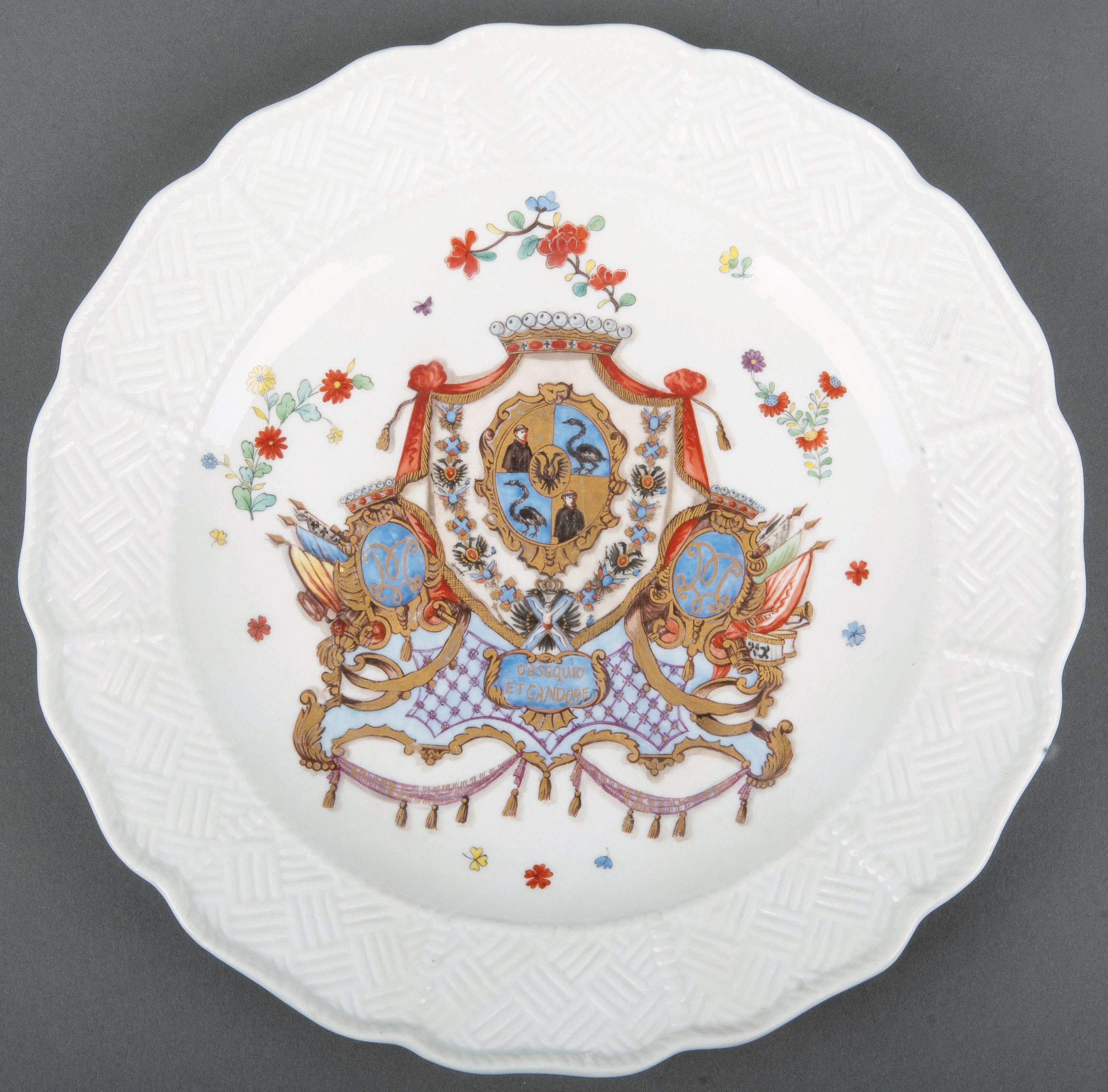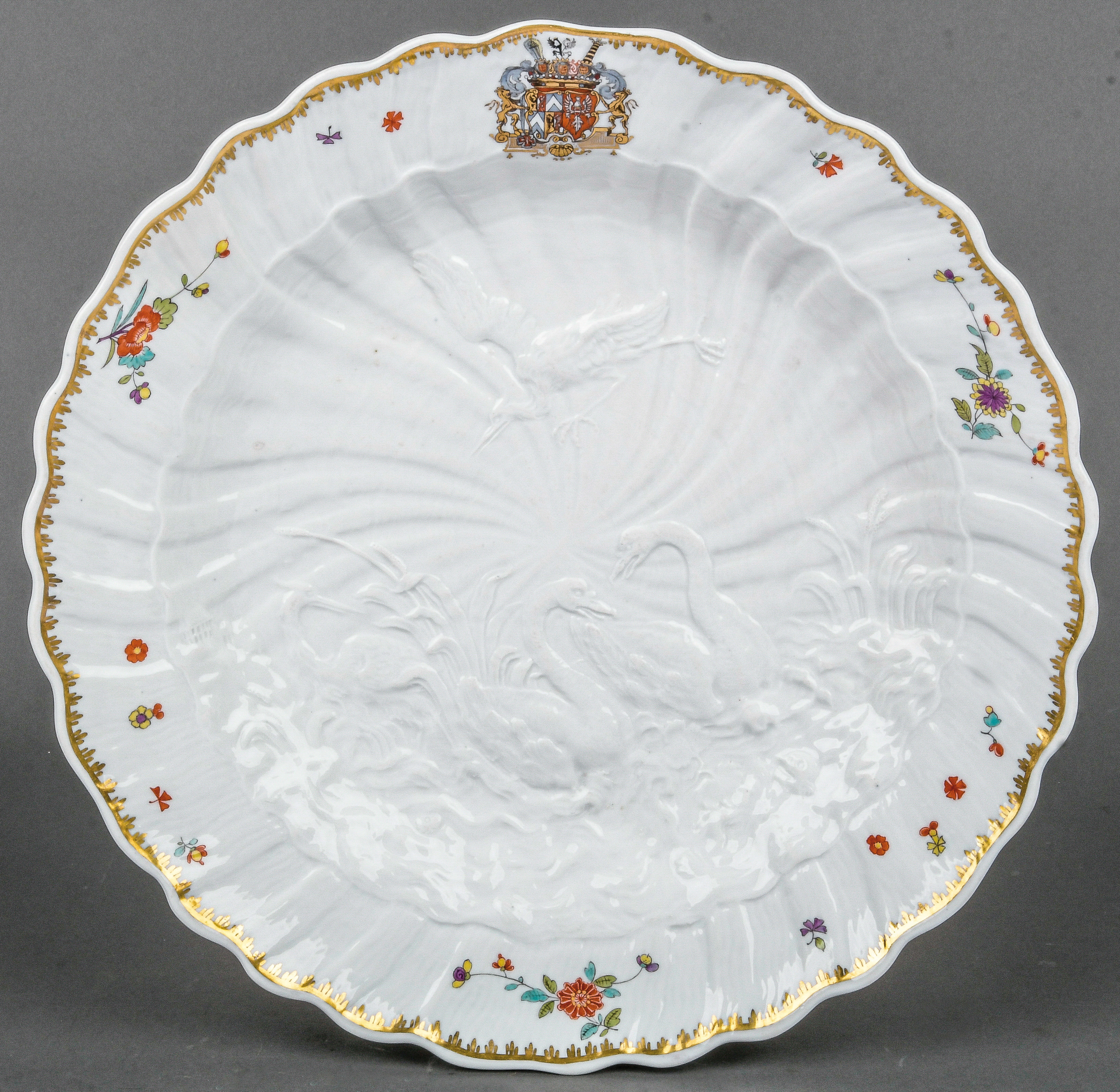| Rund gemuldet, mit muschelförmig ausmodellierter Fahne, bunt bemalt mit asiatischem Floraldekor sowie dem Allianzwappen des Grafen von Brühl und seiner Gemahlin Kolowrat-Krakowský. Spiegel reliefiert mit dem namensgebenden Dekor. Porzellan, verso unterglasurblaue Schwertermarke, Drehermarke „4“ für Friedrich August Albrecht. Modell von Johann Joachim Kaendler und Johann Friedrich Eberlein. Provenienz: Kunsthandel Röbbig, München 1999; davor Sotheby's New York 1999. Vgl. U. Pietsch, „Schwanenservice - Meissener Porzellan für Heinrich Graf von Brühl“, Dresden 2000, S. 159, Nr. 29.