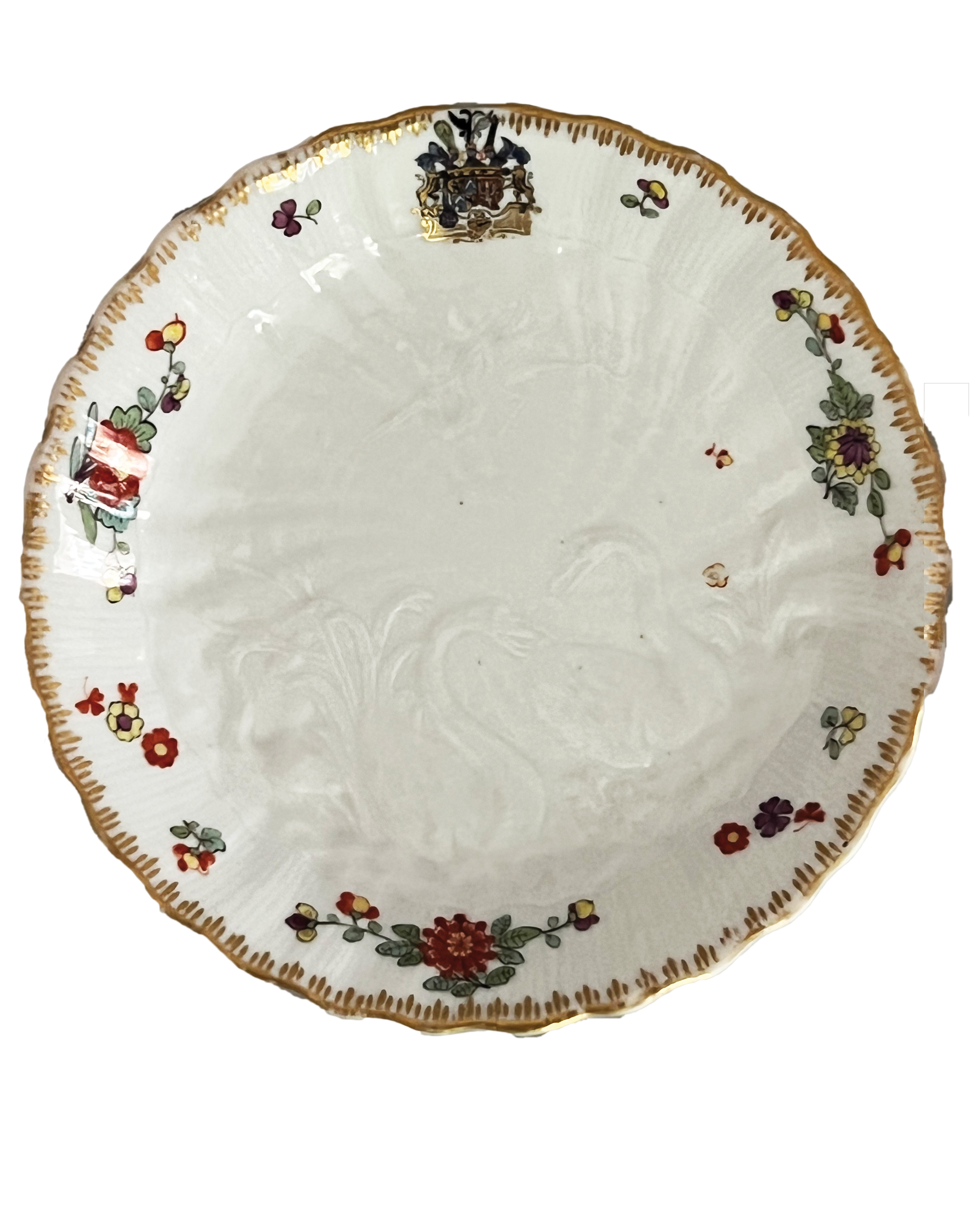 | Rund gemuldet, mit steigender Sulkowskirelief-Fahne und wulstigem, gewelltem Lippenrand. Im Spiegel das prachtvolle bunt gemalte Wappen, umgeben von Kakiemonblüten. Porzellan, verso unterglasurblaue Schwertermarke mit Drehermarke „E“ für Johann Gottfried Eckoldt. Modell von Johann Joachim Kaendler. Vgl. R. Rückert 1966, Taf. 120, Nr. 479ff. (nicht sichtbar rest.)