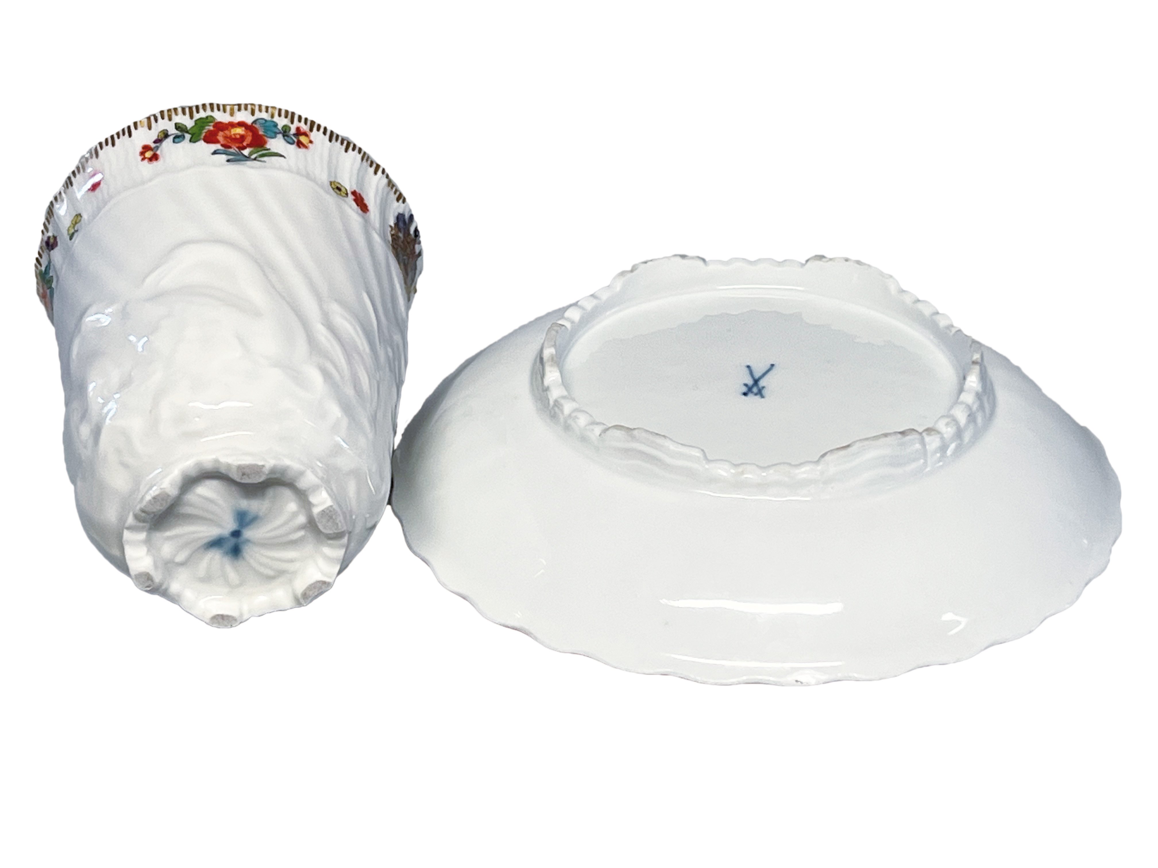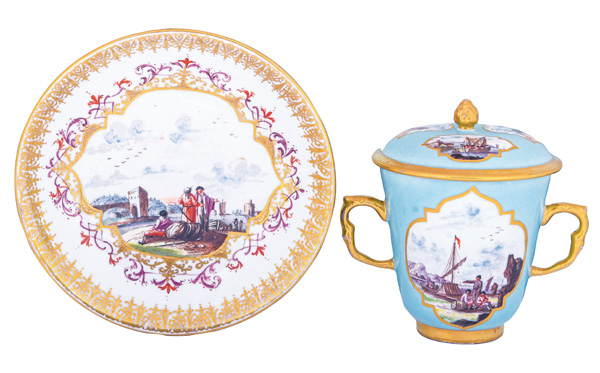 | Beide Teile mit Goldrändern. Schauseiten bunt bemalt mit dem namensgebendem Wappen, umgeben von Streublumen. Außenwandung des Koppchens verso bunt bemalt mit Kauffahrteiszene. Porzellan, am Boden unterglasurblaue Schwertermarke. Vgl. Slg. Hoffmeister, S. 500, Nr. 322.