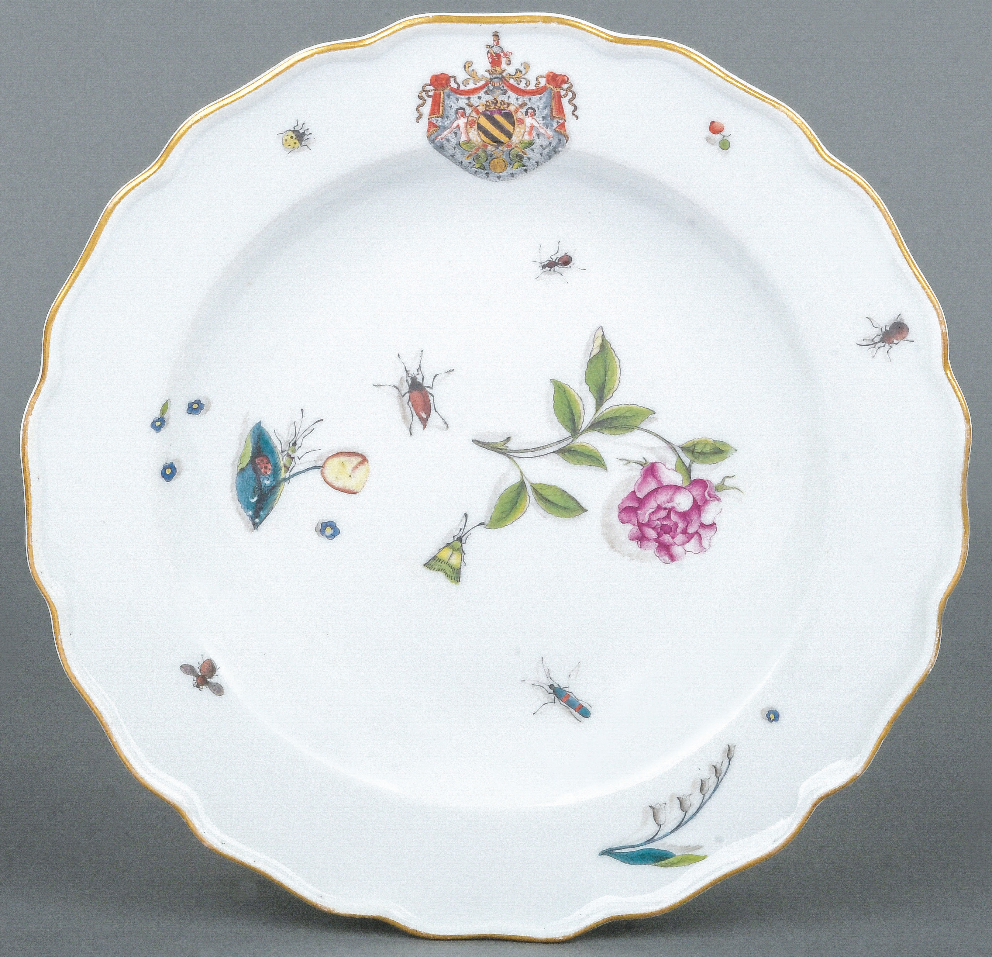 | Rund gemuldet, mit steiler Wandung und wulstigem, gewelltem, gold gesäumtem Lippenrand. Oberhalb bunt bemalt mit dem Wappen. Spiegel bunt bemalt mit Holzschnittblumen und Insekten. Porzellan, am Boden unterglasurblaue Schwertermarke, Pressziffer „16.“. Vgl. Slg. Hoffmeister, Bd. II, Nr. 360.