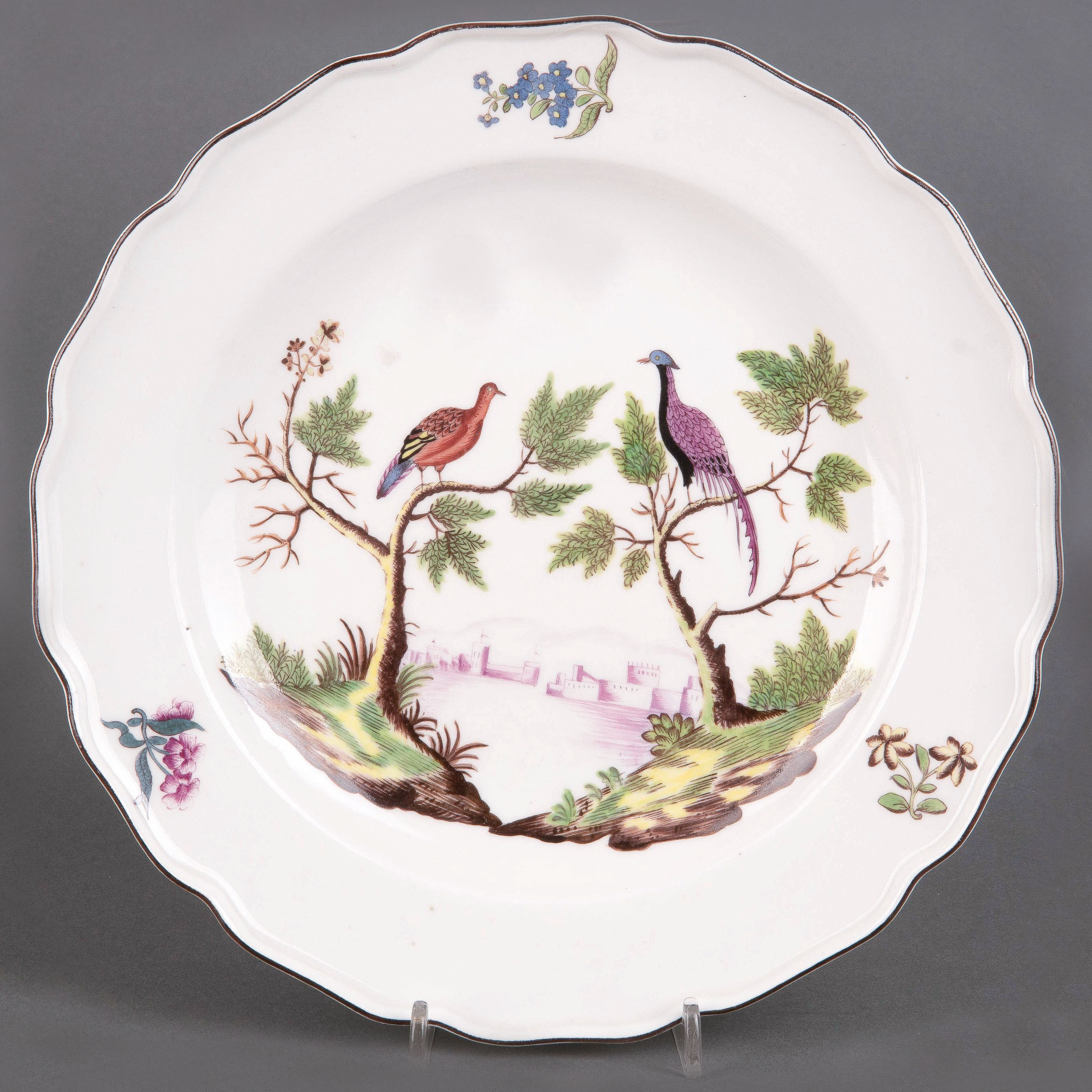 | Rund gemuldet. Steigende Fahne mit umlaufend gewelltem, wulstigem, kapuzinerbraun staffiertem Lippenrand. Spiegel bunt bemalt mit Fasanenpaar, je auf einem Baum sitzend in bunt gemalter Landschaft vor purpur staffierter Uferlandschaft. Porzellan, verso unterglasurblaue Schwertermarke. Vgl. Slg. Hoffmeister, Bd. I, S. 306ff, Nr. 195.