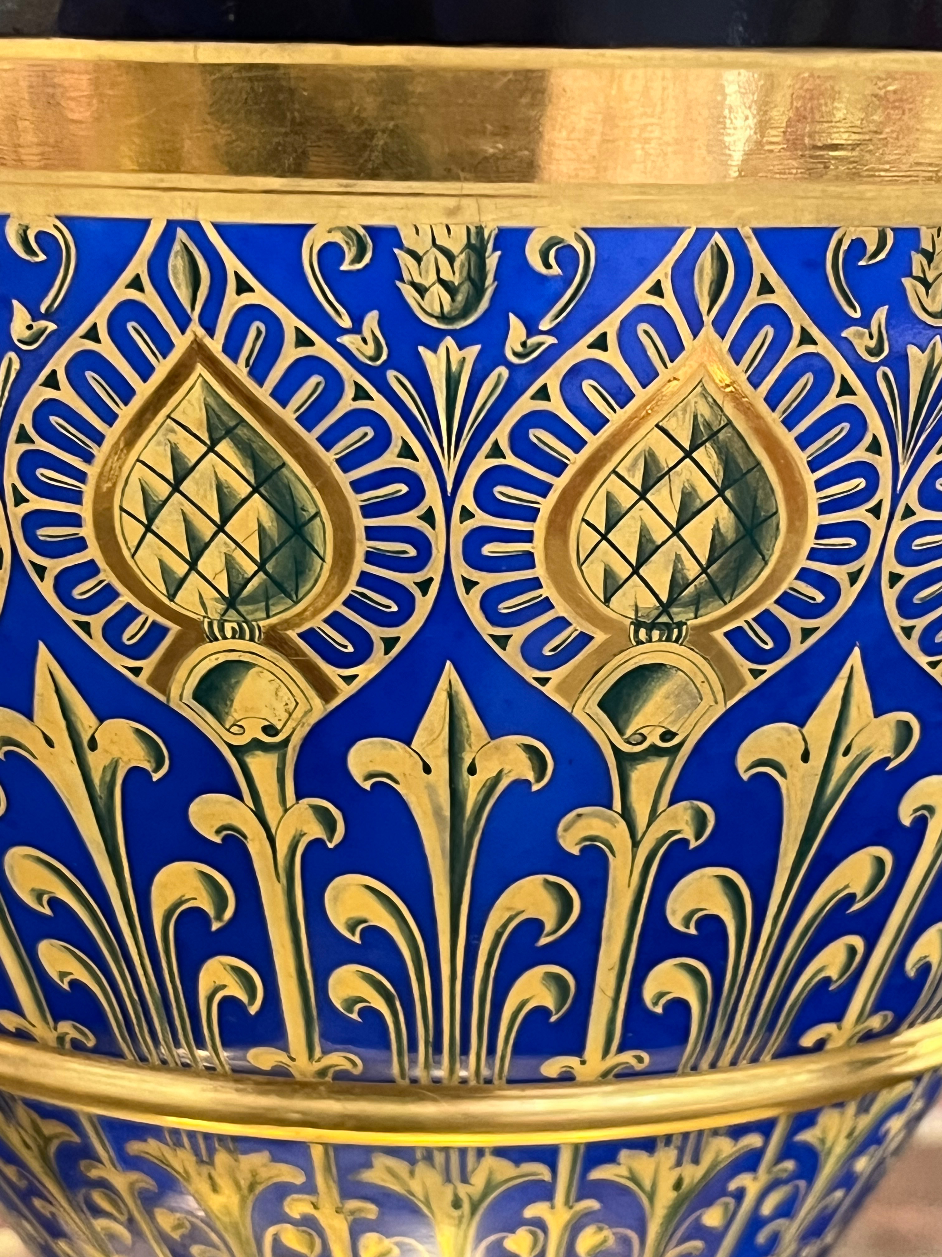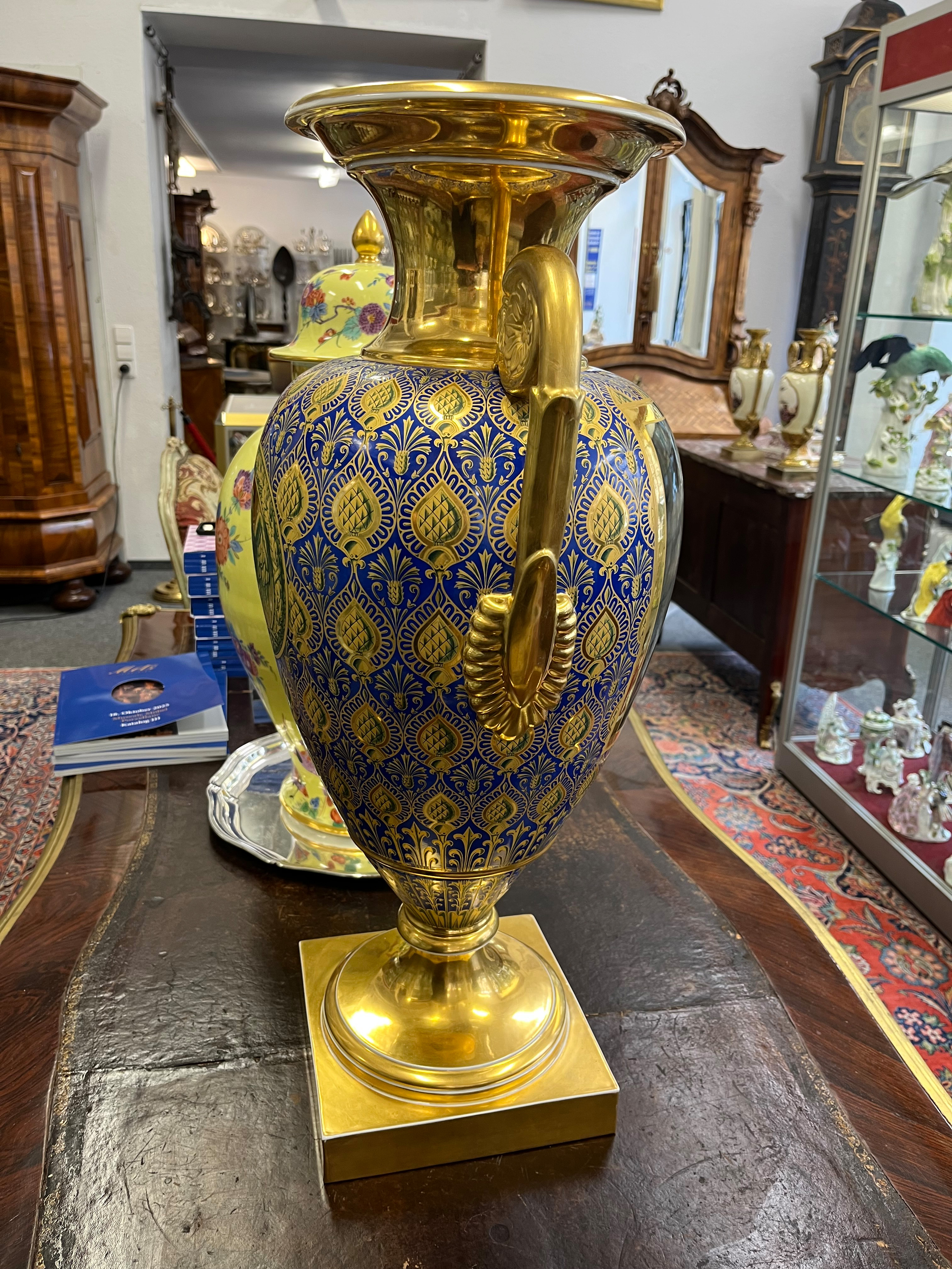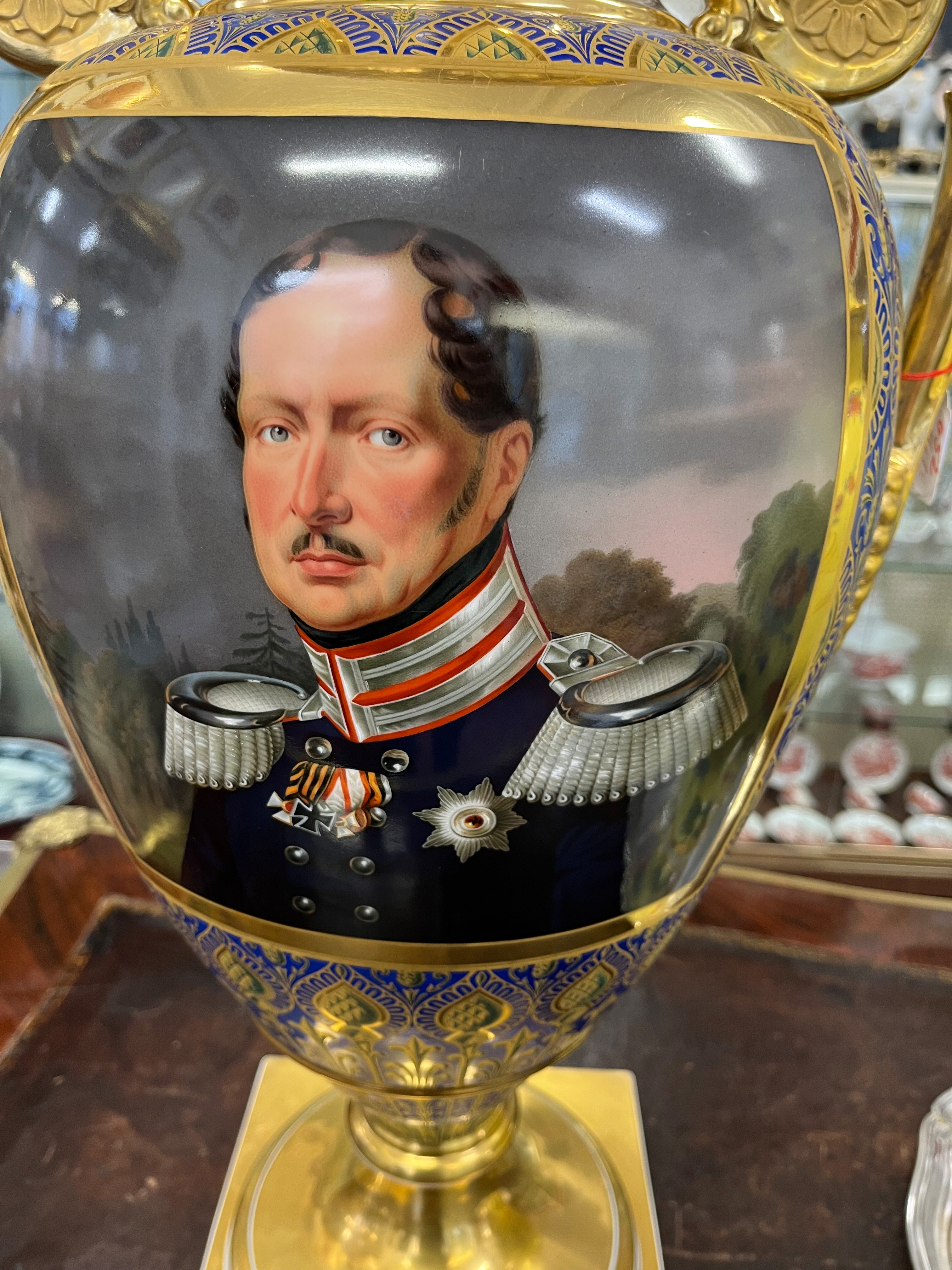 | Quadratische Plinthe mit trichterförmigem Fuß. Eiförmiger Korpus mit seitlich eingerollten Henkeln. Abgerundete Schultern mit walzenförmigem, überlappendem Mündungshals. Königsblauer Fond mit exzellenter, teilweise radierter Goldstaffierung. Fuß, Henkel und Mündungshals gold gehöht. Schauseite museal bemalt mit dem Porträt von König Friedrich Wilhelm III von Preußen. Verso mit dem Preußischen Adler, umrahmt von einem Lorbeerkranz. Porzellan, am Boden unterglasurblaue Szeptermarke mit eisenrotem „KPM“. Solche außergewöhnlich qualitätvollen Vasen wurden direkt vom König hochgestellten Persönlichkeiten als Geschenk überreicht. Provenienz: Eheleute Horst und Ruth E. Denk, New York.