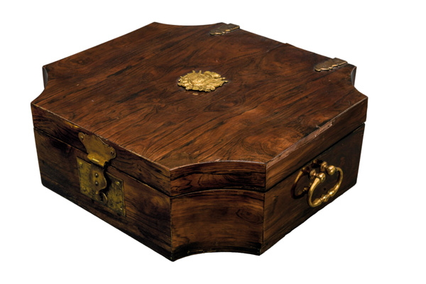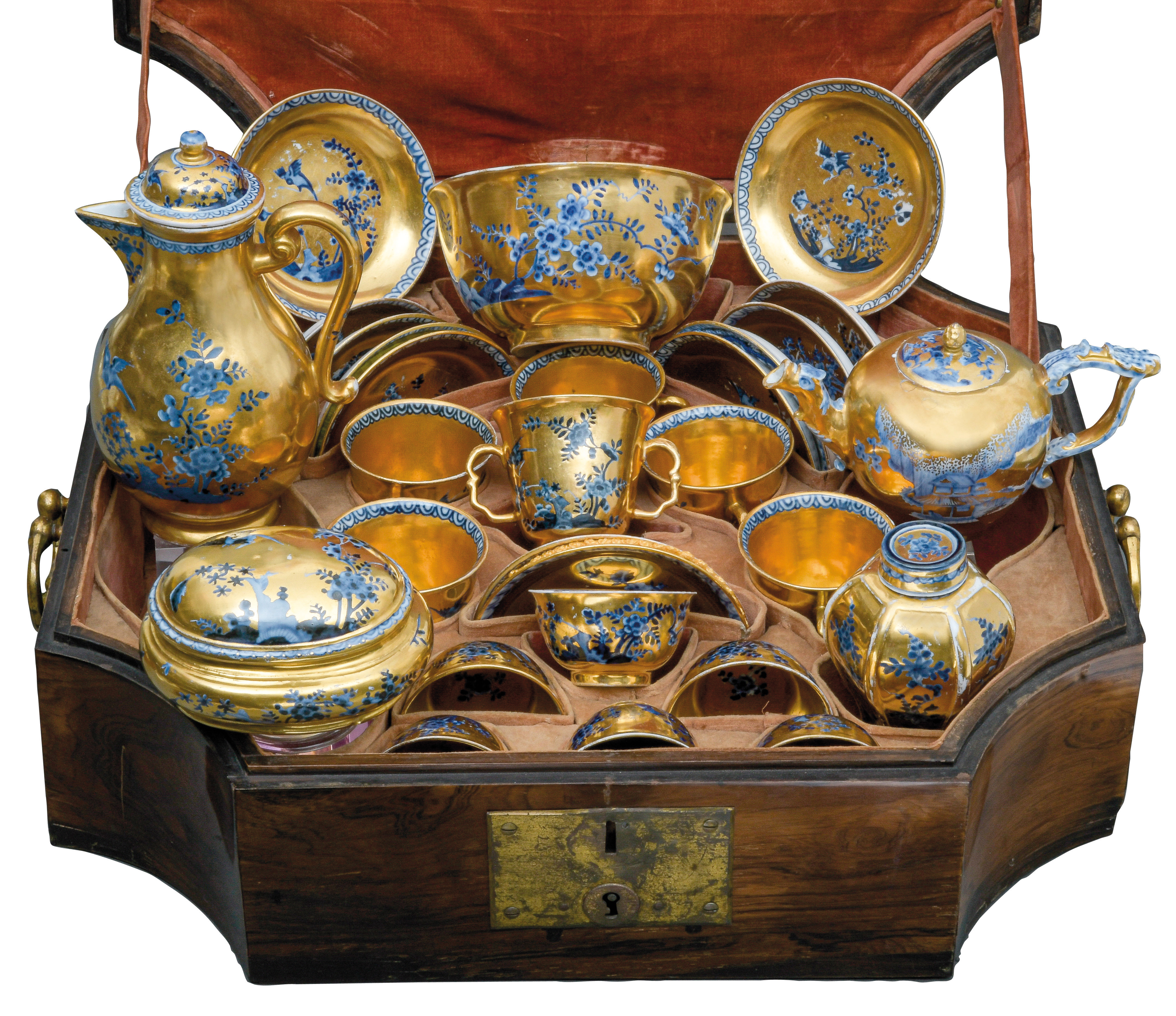 | Bestehend aus: Eine Kaffeekanne (H=19,8 cm), eine hexagonale Teedose (H=10 cm), eine runde Kumme (H=8,1 cm, D=15,2 cm), eine ovale Zuckerdose (H=6,5 cm), sechs Doppelhenkelbecher (H=7,2 cm), sechs Koppchen (H=4,2 cm) und zwölf Unterschalen (D=12,5 cm). Alle Teile mit gold gehöhtem Fond, unterglasurblau bemalt mit Fels- und Vogeldekor bzw. mit Landschaften. Porzellan, am Boden unterglasurblaue Schwertermarke; die Kumme mit Malerbuchstabe „K“. Malerei von Johann David Kretzschmar. In massivem Mahagonikoffer, furniert mit Palisander, mit seitlich beweglichen Griffen und Frontschloß. Provenienz: Kunsthandel Röbbig, München 2000; davor Christie's, Monaco. Vgl. R. Rückert 1966, Taf. 139, Nr. 566 und 568. (Schlüssel fehlt)