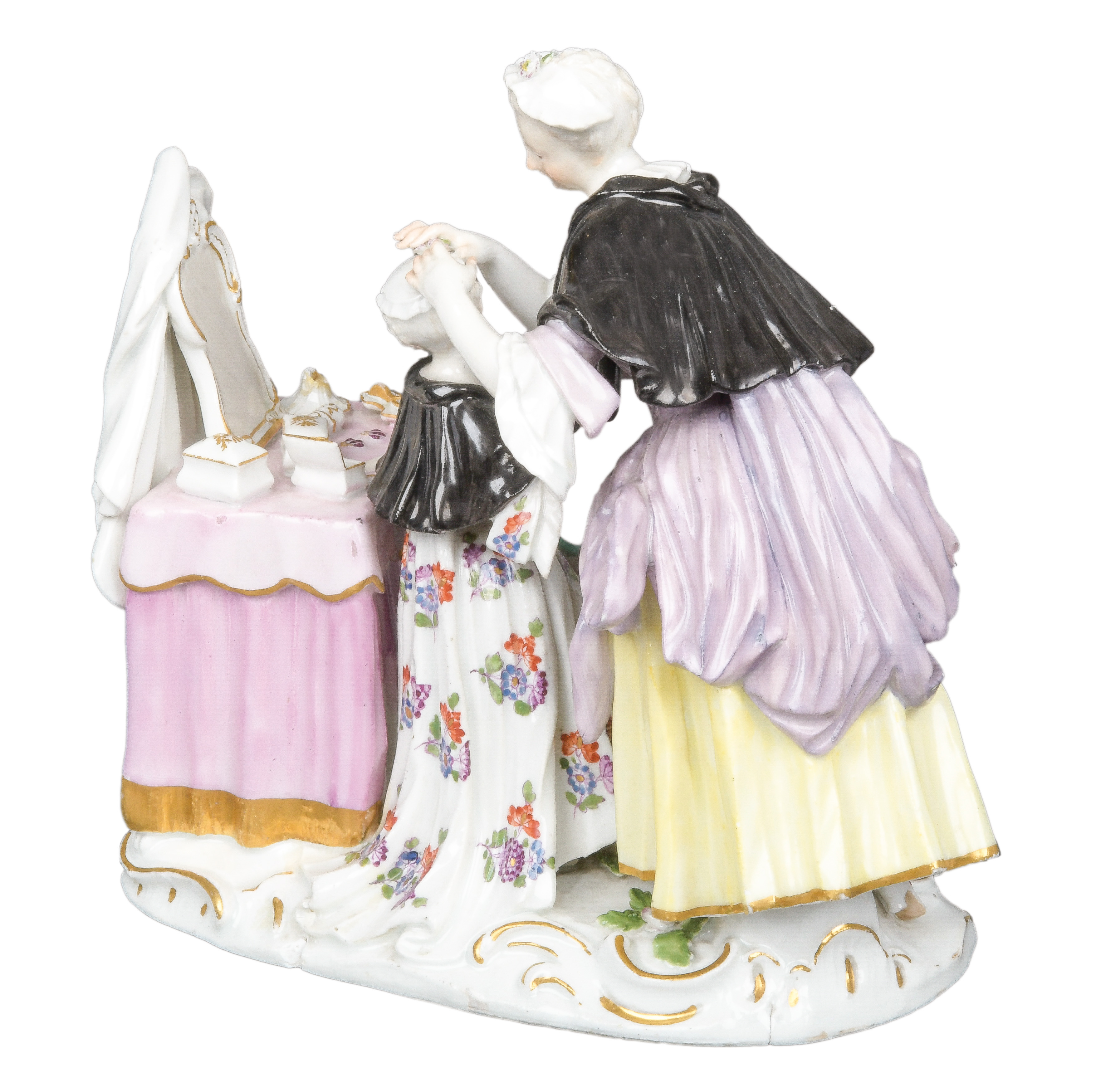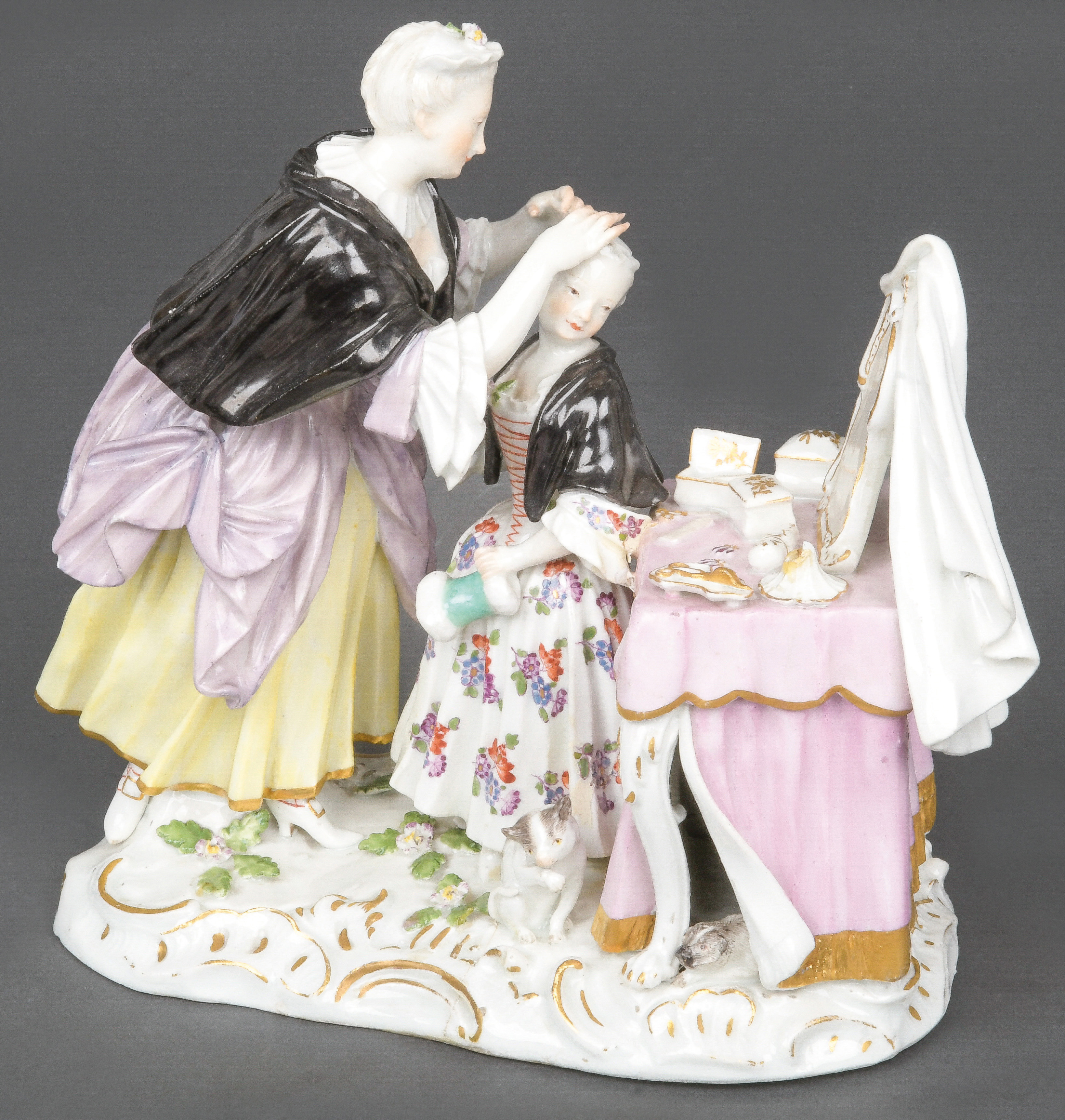 | Stehende Bedienstete, der Prinzessin die Haare friesierend, auf ovalem, rocaillereliefiertem, gold gesäumtem Sockel mit aufbossierten Blüten und Blättern. Seitlich eine Poudreuse mit verschiedenen Toilettenutensilien. Mittig davor sitzend, eine sich putzende Katze. Bunt bemalt, teilweise mit indianischem Floraldekor. Porzellan, ohne Marke. Modell von Johann Joachim Kaendler. Provenienz: Sotheby's, Chicago 1998. Vgl. R. Rückert 1966, Taf. 250, Nr. 1022. (Sockel sichtbar rest. bzw. best.)