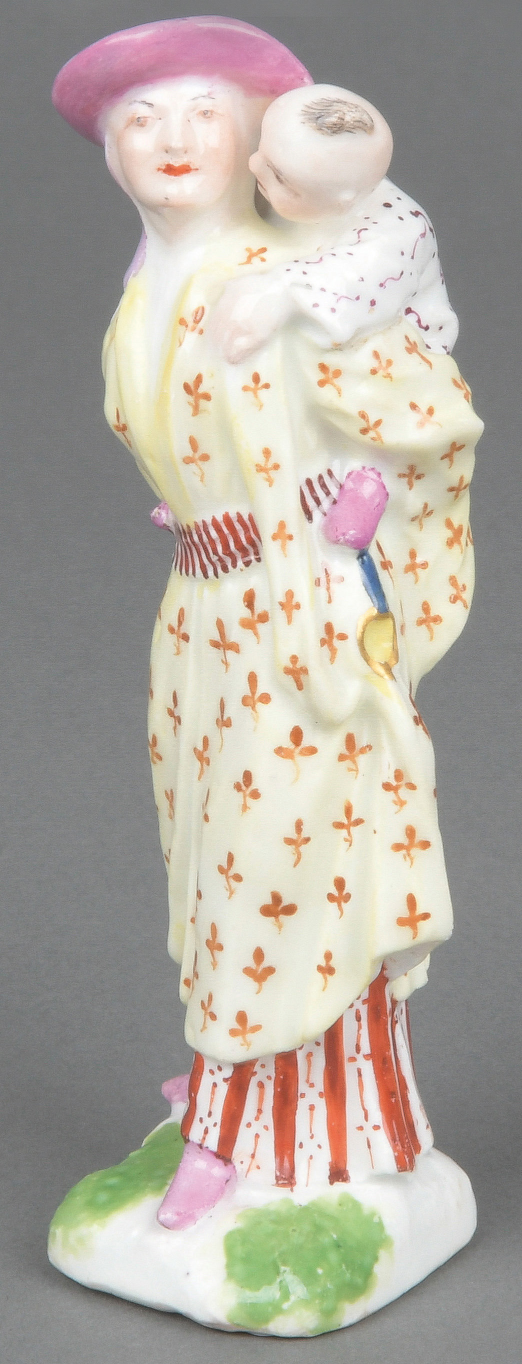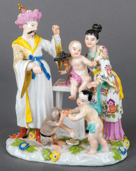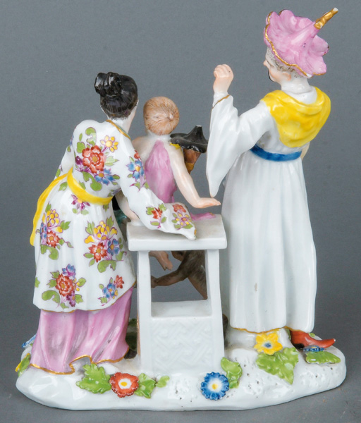 | Elternpaar auf ovalem Sockel mit aufbossierten Blüten und Blättern stehend. Mittig ein hoher Säulentisch mit darauf sitzendem Kind, im Vordergrund ein weiteres Kind und ein Affe. Bunt bemalt, teilw. mit indianischem Floraldekor. Porzellan, ohne Marke. Modell von Johann Joachim Kaendler und Peter Reinicke. Vgl. M. Kunze-Köllesperger, „Slg. F. Burda“, Augsburg 1997, Taf. 108, Nr. 32.