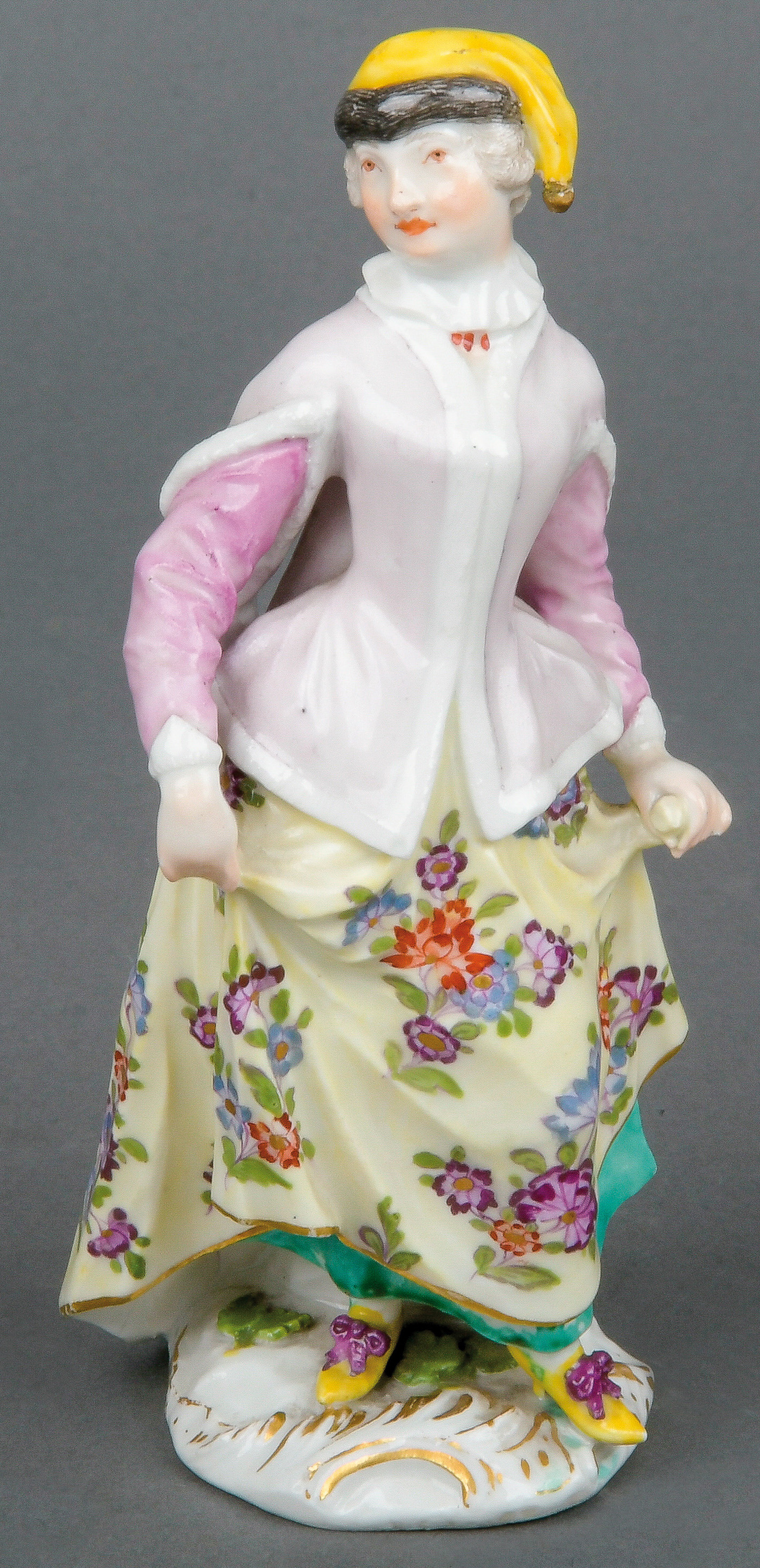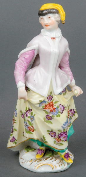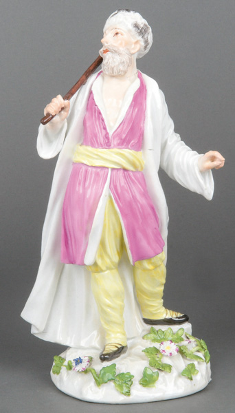 | Tanzend, auf rundem, gold gesäumtem Rocaillesockel. Bunt bemalt, teilw. mit indianischem Floraldekor. Porzellan, ohne Marke. Modell von Johann Joachim Kaendler.