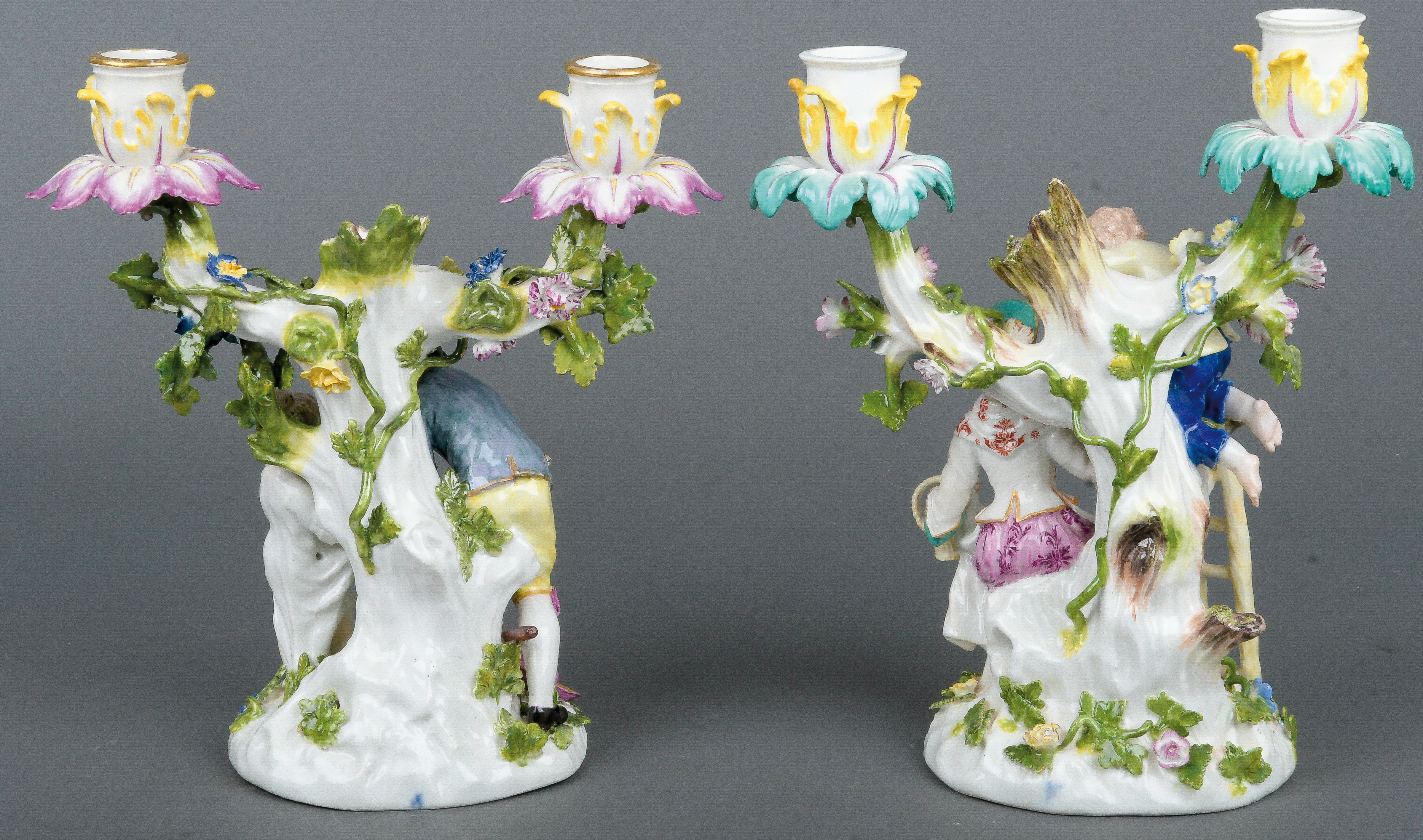 | Je zweiflammig, in Form eines Baumstammes modelliert, auf ovalem Sockel mit aufbossierten Blüten und Blättern. Darauf stehend ein Mann, der einem Mädchen ein Nest reicht bzw. ein Mann, der einer Dame ein Küken reicht. Porzellan, bunt bemalt, verso am Sockel unterglasurblaue Schwertermarke. Modelle von Johann Joachim Kaendler und Friedrich Elias Meyer. Vgl. R. Rückert 1966, Taf. 216, Nr. 884 .