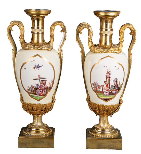 | Je birnförmig, mit hellem, crèmefarbenem Fond. Beidseitig mit mehrpassigen Goldkartuschen. Reserven bunt bemalt mit Chinoiserien und Drachen, umgeben von Insekten. Porzellan, ohne Marke, mit zeitgenössischer, fein modellierter, feuervergoldeter Bronzemontur. Malerei von Johann Gregorius Hoeroldt.